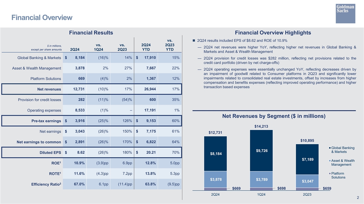 Financial Overview Financial Results Financial Overview Highlights vs.n 2Q24 results included EPS of $8.62 and ROE of 10.9% vs. vs. 2Q24 2Q23 $ in millions, — 2Q24 net revenues were higher YoY, reflecting higher net revenues in Global Banking & except per share amounts 2Q24 1Q24 2Q23 YTD YTD Markets and Asset & Wealth Management $ 8,184 (16)% 14% $ 17,910 15% Global Banking & Markets — 2Q24 provision for credit losses was $282 million, reflecting net provisions related to the credit card portfolio (driven by net charge-offs) Asset & Wealth Management 3,878 2% 27% 7,667 22% — 2Q24 operating expenses were essentially unchanged YoY, reflecting decreases driven by an impairment of goodwill related to Consumer platforms in 2Q23 and significantly lower impairments related to consolidated real estate investments, offset by increases from higher 669 (4)% 2% 1,367 12% Platform Solutions compensation and benefits expenses (reflecting improved operating performance) and higher transaction based expenses 12,731 (10)% 17% 26,944 17% Net revenues 282 (11)% (54)% 600 35% Provision for credit losses 8,533 (1)% – 17,191 1% Operating expenses Net Revenues by Segment ($ in millions) 3,916 (25)% 126% $ 9,153 60% Pre-tax earnings $ $14,213 $ 3,043 (26)% 150% $ 7,175 61% Net earnings $12,731 $10,895 $ 2,891 (26)% 170% $ 6,822 64% Net earnings to common Global Banking $9,726 & Markets Diluted EPS $ 8.62 (26)% 180% $ 20.21 70% $8,184 $7,189 Asset & Wealth 1 ROE 10.9% (3.9)pp 6.9pp 12.8% 5.0pp Management 1 Platform ROTE 11.6% (4.3)pp 7.2pp 13.8% 5.3pp Solutions $3,878 $3,789 $3,047 3 67.0% 6.1pp (11.4)pp 63.8% (9.5)pp Efficiency Ratio $669 $698 $659 2Q24 1Q24 2Q23 2