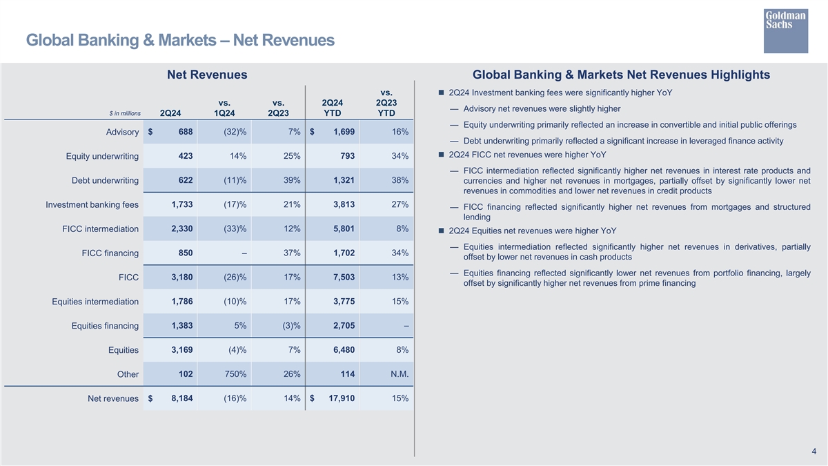 Global Banking & Markets Financial Results Global Banking & Markets Highlights vs.n 2Q24 net revenues were higher YoY vs. vs. 2Q24 2Q23 — Investment banking fees reflected significantly higher net revenues in Debt underwriting, $ in millions 2Q24 1Q24 2Q23 YTD YTD higher net revenues in Equity underwriting and slightly higher net revenues in Advisory — FICC reflected higher net revenues in intermediation and significantly higher net revenues in $ 1,733 (17)% 21% $ 3,813 27% Investment banking fees financing — Equities reflected higher net revenues in intermediation, partially offset by slightly lower net 3,180 (26)% 17% 7,503 13% FICC revenues in financing 3 n Investment banking fees backlog increased significantly QoQ, driven by Advisory and Debt 3,169 (4)% 7% 6,480 8% Equities underwriting 3 n 2Q24 select data : 102 750% 26% 114 N.M. Other — Total assets of $1.40 trillion — Loan balance of $123 billion 8,184 (16)% 14% 17,910 15% Net revenues — Net interest income of $815 million Provision for credit losses (55) N.M. N.M. 41 (78)% Global Banking & Markets Net Revenues ($ in millions) Operating expenses 5,075 (2)% 19% 10,228 15% $9,726 Pre-tax earnings $ 3,164 (29)% 11% $ 7,641 17% $8,184 $2,080 Net earnings $ 2,458 (30)% 18% $ 5,990 18% $7,189 Investment $1,733 banking fees Net earnings to common $ 2,338 (31)% 18% $ 5,715 18% $1,431 FICC $4,323 $3,180 Average common equity $ 76,071 1% 7% $ 75,424 7% Equities $2,711 Other Return on average common equity 12.3% (5.7)pp 1.2pp 15.2% 1.4pp $3,169 $3,311 $2,966 $102 $12 $81 2Q24 1Q24 2Q23 3