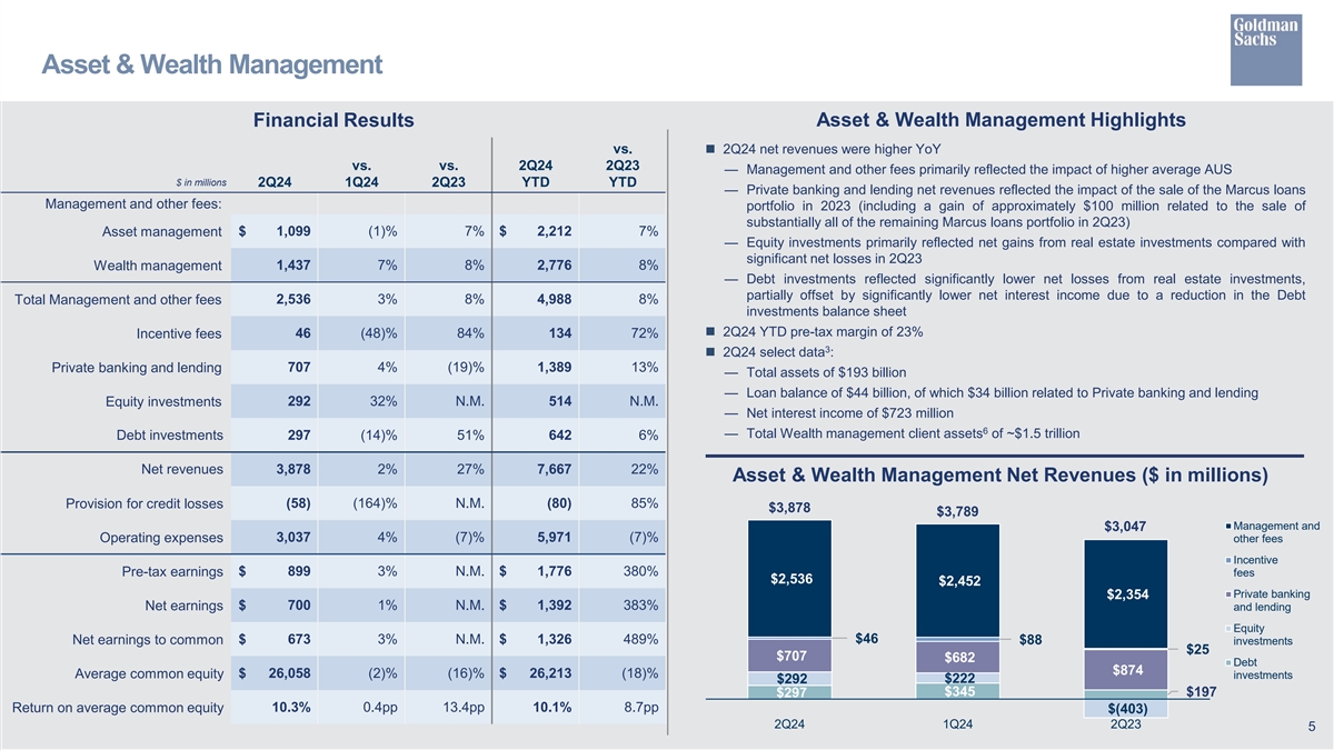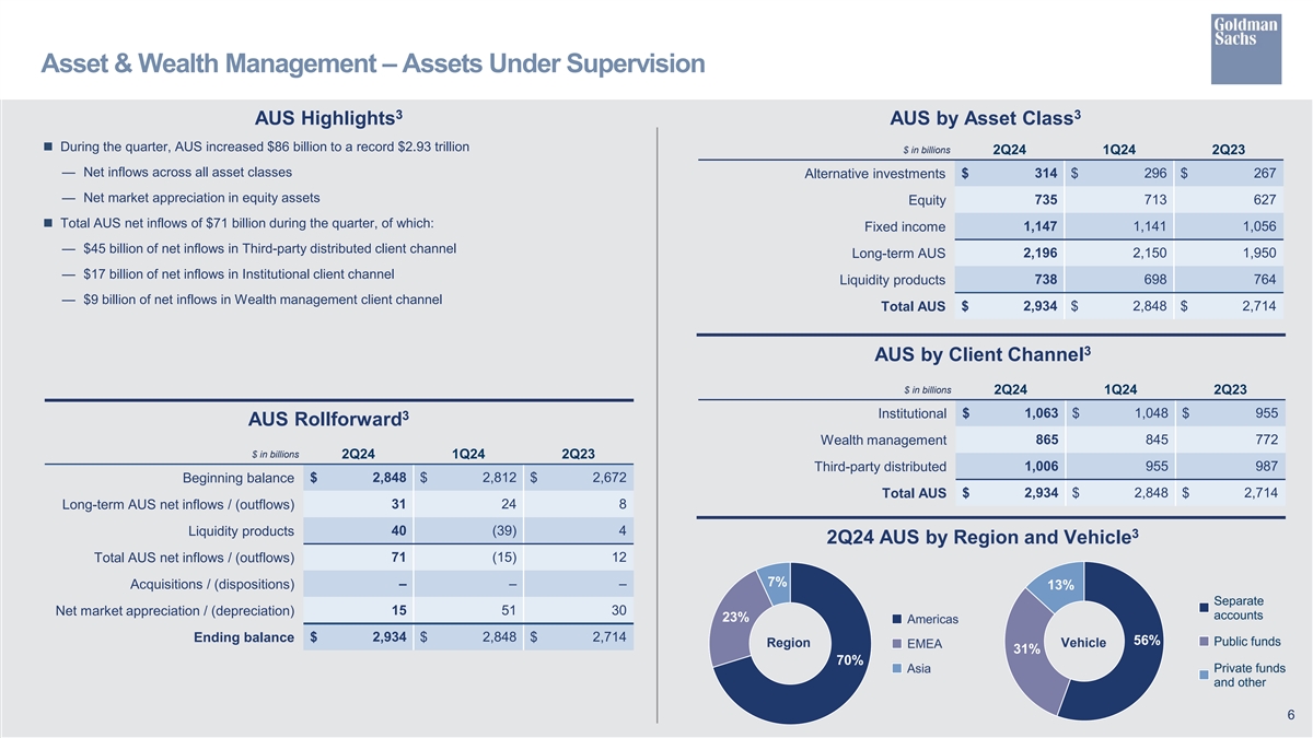 Results Snapshot Net Revenues Net Earnings EPS 2Q24 $12.73 billion 2Q24 $3.04 billion 2Q24 $8.62 2Q24 YTD $ 2 6 . 9 4 bi llion 2Q24 YTD $ 7 . 1 8 bi l l i on 2Q24 YTD $20. 21 1 1 Annualized ROE Annualized ROTE Book Value Per Share 2Q24 10.9% 2Q24 11.6% 2Q24 $327.13 2Q24 YTD 12.8% 2Q24 YTD 13.8% YTD Growth 4.3% 4 Quarterly Highlights Selected Items and FDIC Special Assessment Fee 2 #1 in announced and completed M&A ; $ in millions, except per share amounts 2Q24 2Q24 YTD nd 2 highest net revenues in Equities financing and in FICC financing Pre-tax earnings: 5 164 332 AWM historical principal investments $ $ Record Management and other fees of $2.54 billion GreenSky 3 (21) General Motors (GM) Card (58) (118) (19) (97) FDIC special assessment fee 3 Record AUS of $2.93 trillion; $ 90 $ 96 th Total impact to pre-tax earnings 26 consecutive quarter of long-term fee-based net inflows 70 75 Impact to net earnings $ $ 0.21 0.22 Impact to EPS $ $ Increased quarterly dividend by 9% to $3.00 per common share in 3Q24 Impact to ROE 0.3pp 0.1pp 1