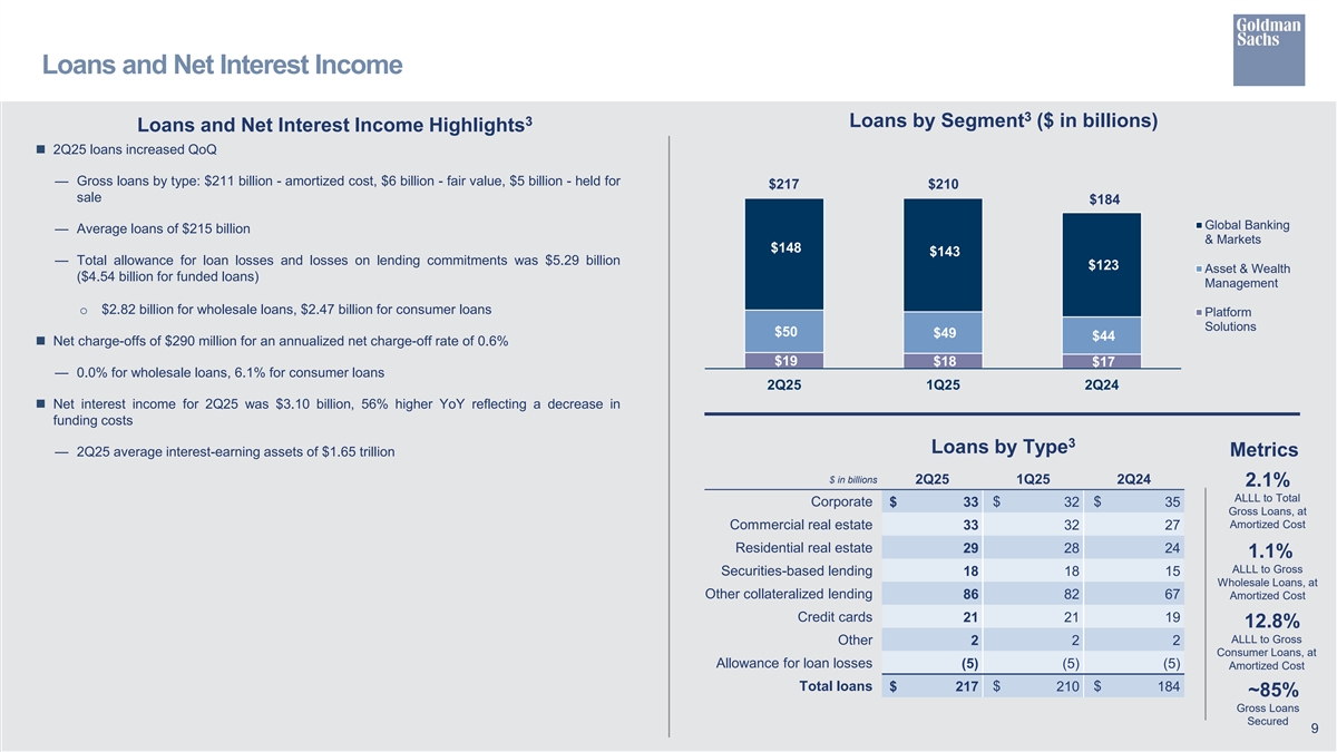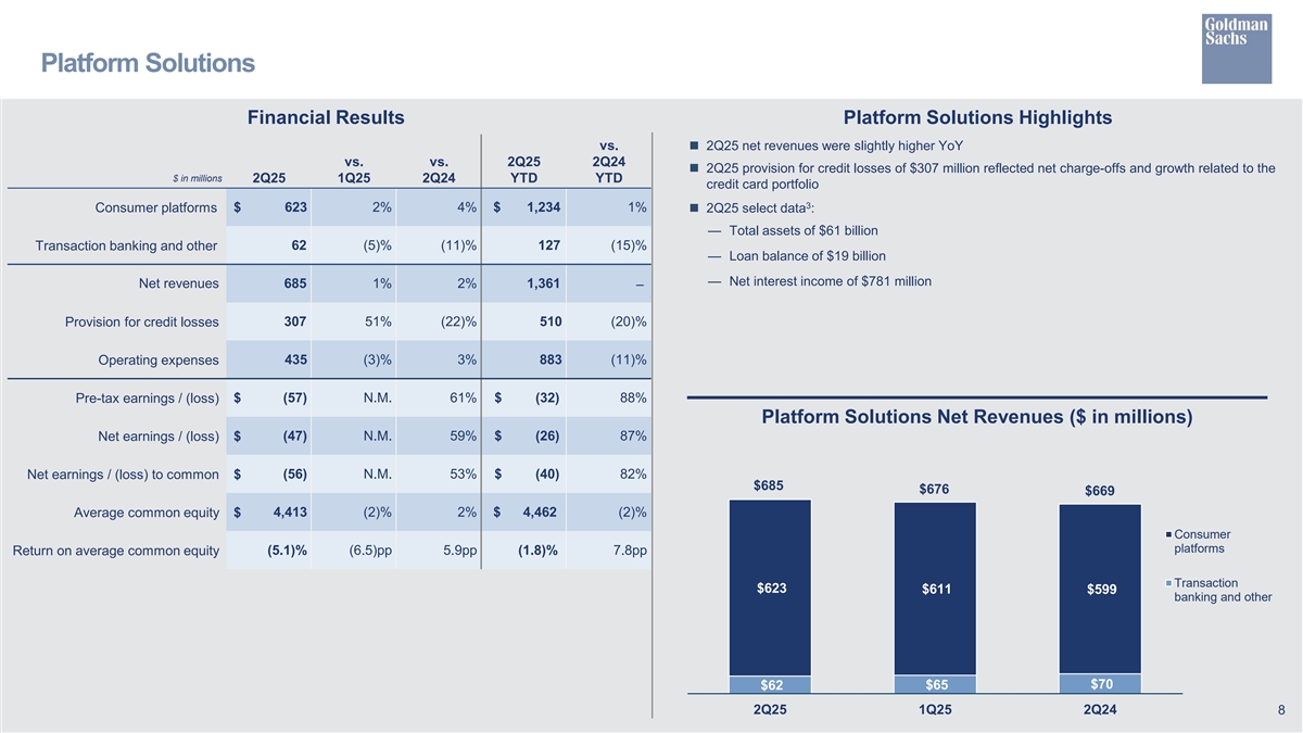 Platform Solutions Financial Results Platform Solutions Highlights vs.n 2Q25 net revenues were slightly higher YoY vs. vs. 2Q25 2Q24 n 2Q25 provision for credit losses of $307 million reflected net charge-offs and growth related to the $ in millions 2Q25 1Q25 2Q24 YTD YTD credit card portfolio 3 $ 623 2% 4% $ 1,234 1% Consumer platformsn 2Q25 select data : — Total assets of $61 billion 62 (5)% (11)% 127 (15)% Transaction banking and other — Loan balance of $19 billion — Net interest income of $781 million Net revenues 685 1% 2% 1,361 – 307 51% (22)% 510 (20)% Provision for credit losses 435 (3)% 3% 883 (11)% Operating expenses Pre-tax earnings / (loss) $ (57) N.M. 61% $ (32) 88% Platform Solutions Net Revenues ($ in millions) Net earnings / (loss) $ (47) N.M. 59% $ (26) 87% Net earnings / (loss) to common $ (56) N.M. 53% $ (40) 82% $685 $676 $669 Average common equity $ 4,413 (2)% 2% $ 4,462 (2)% Consumer platforms Return on average common equity (5.1)% (6.5)pp 5.9pp (1.8)% 7.8pp Transaction $623 $611 $599 banking and other $62 $65 $70 2Q25 1Q25 2Q24 8