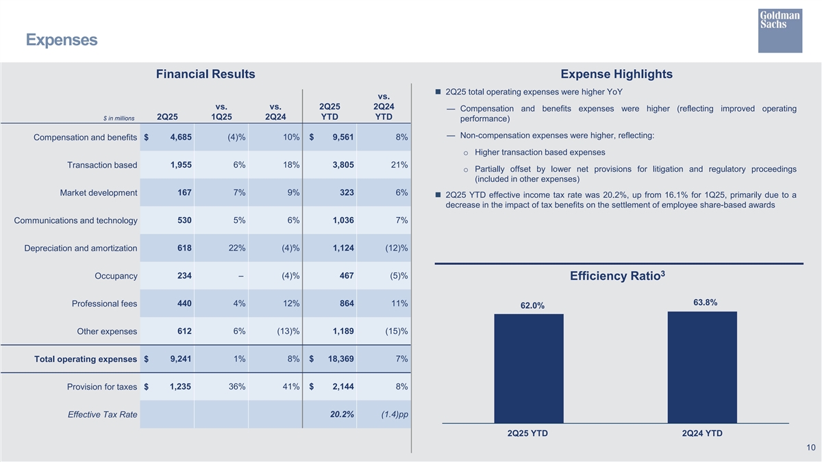 Expenses Financial Results Expense Highlights n 2Q25 total operating expenses were higher YoY vs. vs. vs. 2Q25 2Q24 — Compensation and benefits expenses were higher (reflecting improved operating 2Q25 1Q25 2Q24 YTD YTD $ in millions performance) — Non-compensation expenses were higher, reflecting: Compensation and benefits $ 4,685 (4)% 10% $ 9,561 8% o Higher transaction based expenses Transaction based 1,955 6% 18% 3,805 21% o Partially offset by lower net provisions for litigation and regulatory proceedings (included in other expenses) Market development 167 7% 9% 323 6% n 2Q25 YTD effective income tax rate was 20.2%, up from 16.1% for 1Q25, primarily due to a decrease in the impact of tax benefits on the settlement of employee share-based awards Communications and technology 530 5% 6% 1,036 7% 618 22% (4)% 1,124 (12)% Depreciation and amortization 3 Occupancy 234 – (4)% 467 (5)% Efficiency Ratio 63.8% Professional fees 440 4% 12% 864 11% 62.0% Other expenses 612 6% (13)% 1,189 (15)% Total operating expenses $ 9,241 1% 8% $ 18,369 7% 1,235 36% 41% $ 2,144 8% Provision for taxes $ Effective Tax Rate 20.2% (1.4)pp 2Q25 YTD 2Q24 YTD 10