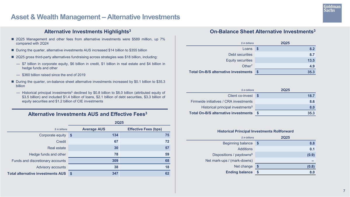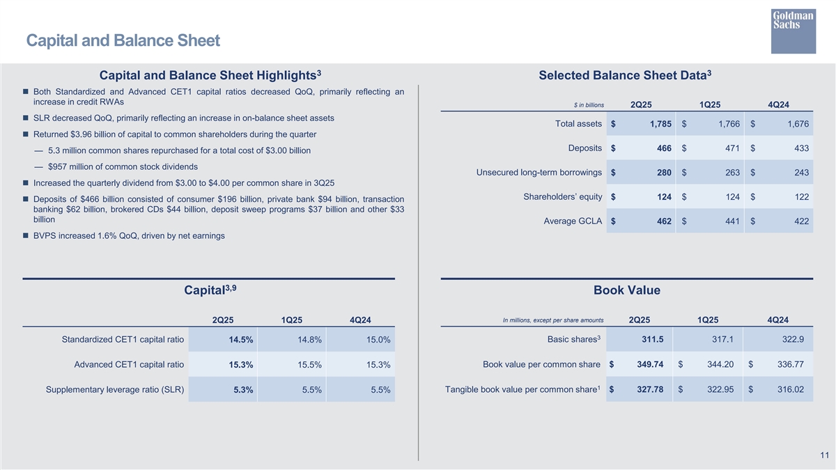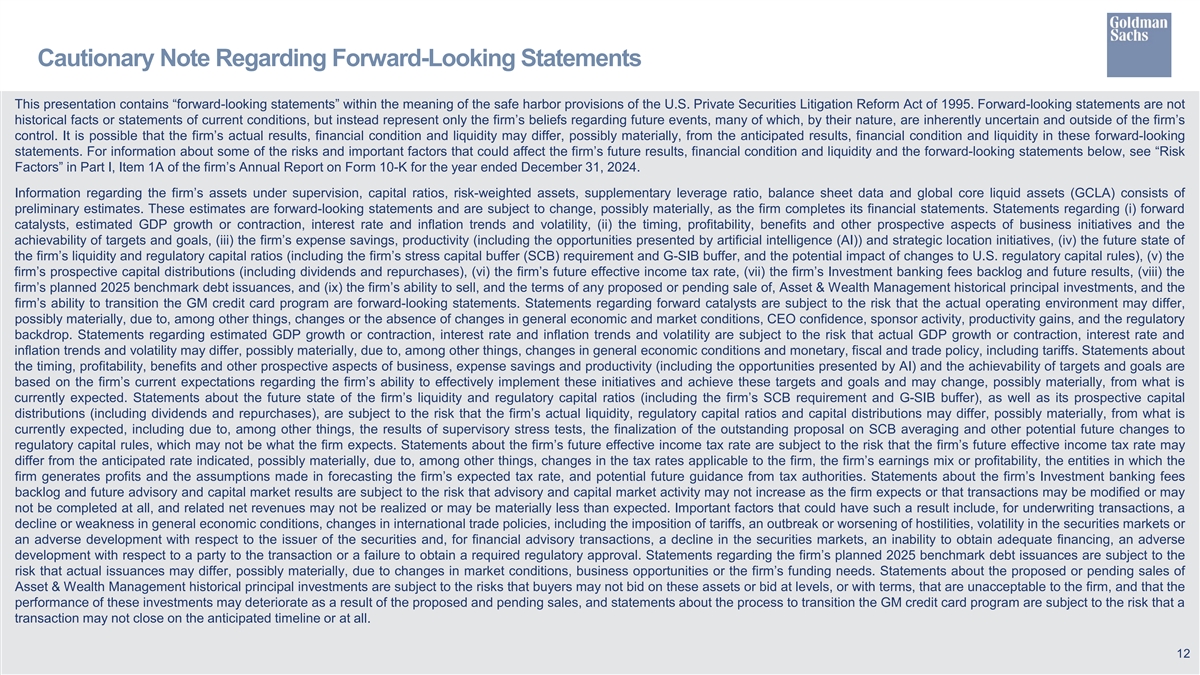 Cautionary Note Regarding Forward-Looking Statements This presentation contains “forward-looking statements” within the meaning of the safe harbor provisions of the U.S. Private Securities Litigation Reform Act of 1995. Forward-looking statements are not historical facts or statements of current conditions, but instead represent only the firm’s beliefs regarding future events, many of which, by their nature, are inherently uncertain and outside of the firm’s control. It is possible that the firm’s actual results, financial condition and liquidity may differ, possibly materially, from the anticipated results, financial condition and liquidity in these forward-looking statements. For information about some of the risks and important factors that could affect the firm’s future results, financial condition and liquidity and the forward-looking statements below, see “Risk Factors” in Part I, Item 1A of the firm’s Annual Report on Form 10-K for the year ended December 31, 2024. Information regarding the firm’s assets under supervision, capital ratios, risk-weighted assets, supplementary leverage ratio, balance sheet data and global core liquid assets (GCLA) consists of preliminary estimates. These estimates are forward-looking statements and are subject to change, possibly materially, as the firm completes its financial statements. Statements regarding (i) forward catalysts, estimated GDP growth or contraction, interest rate and inflation trends and volatility, (ii) the timing, profitability, benefits and other prospective aspects of business initiatives and the achievability of targets and goals, (iii) the firm’s expense savings, productivity (including the opportunities presented by artificial intelligence (AI)) and strategic location initiatives, (iv) the future state of the firm’s liquidity and regulatory capital ratios (including the firm’s stress capital buffer (SCB) requirement and G-SIB buffer, and the potential impact of changes to U.S. regulatory capital rules), (v) the firm’s prospective capital distributions (including dividends and repurchases), (vi) the firm’s future effective income tax rate, (vii) the firm’s Investment banking fees backlog and future results, (viii) the firm’s planned 2025 benchmark debt issuances, and (ix) the firm’s ability to sell, and the terms of any proposed or pending sale of, Asset & Wealth Management historical principal investments, and the firm’s ability to transition the GM credit card program are forward-looking statements. Statements regarding forward catalysts are subject to the risk that the actual operating environment may differ, possibly materially, due to, among other things, changes or the absence of changes in general economic and market conditions, CEO confidence, sponsor activity, productivity gains, and the regulatory backdrop. Statements regarding estimated GDP growth or contraction, interest rate and inflation trends and volatility are subject to the risk that actual GDP growth or contraction, interest rate and inflation trends and volatility may differ, possibly materially, due to, among other things, changes in general economic conditions and monetary, fiscal and trade policy, including tariffs. Statements about the timing, profitability, benefits and other prospective aspects of business, expense savings and productivity (including the opportunities presented by AI) and the achievability of targets and goals are based on the firm’s current expectations regarding the firm’s ability to effectively implement these initiatives and achieve these targets and goals and may change, possibly materially, from what is currently expected. Statements about the future state of the firm’s liquidity and regulatory capital ratios (including the firm’s SCB requirement and G-SIB buffer), as well as its prospective capital distributions (including dividends and repurchases), are subject to the risk that the firm’s actual liquidity, regulatory capital ratios and capital distributions may differ, possibly materially, from what is currently expected, including due to, among other things, the results of supervisory stress tests, the finalization of the outstanding proposal on SCB averaging and other potential future changes to regulatory capital rules, which may not be what the firm expects. Statements about the firm’s future effective income tax rate are subject to the risk that the firm’s future effective income tax rate may differ from the anticipated rate indicated, possibly materially, due to, among other things, changes in the tax rates applicable to the firm, the firm’s earnings mix or profitability, the entities in which the firm generates profits and the assumptions made in forecasting the firm’s expected tax rate, and potential future guidance from tax authorities. Statements about the firm’s Investment banking fees backlog and future advisory and capital market results are subject to the risk that advisory and capital market activity may not increase as the firm expects or that transactions may be modified or may not be completed at all, and related net revenues may not be realized or may be materially less than expected. Important factors that could have such a result include, for underwriting transactions, a decline or weakness in general economic conditions, changes in international trade policies, including the imposition of tariffs, an outbreak or worsening of hostilities, volatility in the securities markets or an adverse development with respect to the issuer of the securities and, for financial advisory transactions, a decline in the securities markets, an inability to obtain adequate financing, an adverse development with respect to a party to the transaction or a failure to obtain a required regulatory approval. Statements regarding the firm’s planned 2025 benchmark debt issuances are subject to the risk that actual issuances may differ, possibly materially, due to changes in