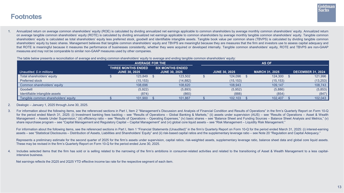 Footnotes 1. Annualized return on average common shareholders’ equity (ROE) is calculated by dividing annualized net earnings applicable to common shareholders by average monthly common shareholders’ equity. Annualized return on average tangible common shareholders’ equity (ROTE) is calculated by dividing annualized net earnings applicable to common shareholders by average monthly tangible common shareholders’ equity. Tangible common shareholders’ equity is calculated as total shareholders’ equity less preferred stock, goodwill and identifiable intangible assets. Tangible book value per common share (TBVPS) is calculated by dividing tangible common shareholders’ equity by basic shares. Management believes that tangible common shareholders’ equity and TBVPS are meaningful because they are measures that the firm and investors use to assess capital adequacy and that ROTE is meaningful because it measures the performance of businesses consistently, whether they were acquired or developed internally. Tangible common shareholders’ equity, ROTE and TBVPS are non-GAAP measures and may not be comparable to similar non-GAAP measures used by other companies. The table below presents a reconciliation of average and ending common shareholders’ equity to average and ending tangible common shareholders’ equity: AVERAGE FOR THE AS OF THREE MONTHS ENDED SIX MONTHS ENDED Unaudited, $ in millions JUNE 30, 2025 JUNE 30, 2025 JUNE 30, 2025 MARCH 31, 2025 DECEMBER 31, 2024 Total shareholders’ equity $ 123,849 $ 123,502 $ 124,096 $ 124,300 $ 121,996 Preferred stock (15,153) (14,882) (15,153) (15,153) (13,253) Common shareholders’ equity 108,696 108,620 108,943 109,147 108,743 Goodwill (5,922) (5,893) (5,952) (5,886) (5,853) Identifiable intangible assets (874) (860) (888) (854) (847) Tangible common shareholders’ equity $ 101,900 $ 101,867 $ 102,103 $ 102,407 $ 102,043 2. Dealogic – January 1, 2025 through June 30, 2025. 3. For information about the following items, see the referenced sections in Part I, Item 2 “Management’s Discussion and Analysis of Financial Condition and Results of Operations” in the firm’s Quarterly Report on Form 10-Q for the period ended March 31, 2025: (i) Investment banking fees backlog – see “Results of Operations – Global Banking & Markets,” (ii) assets under supervision (AUS) – see “Results of Operations – Asset & Wealth Management – Assets Under Supervision,” (iii) efficiency ratio – see “Results of Operations – Operating Expenses,” (iv) basic shares – see “Balance Sheet and Funding Sources – Balance Sheet Analysis and Metrics,” (v) share repurchase program – see “Capital Management and Regulatory Capital – Capital Management” and (vi) global core liquid assets – see “Risk Management – Liquidity Risk Management.” For information about the following items, see the referenced sections in Part I, Item 1 “Financial Statements (Unaudited)” in the firm’s Quarterly Report on Form 10-Q for the period ended March 31, 2025: (i) interest-earning assets – see “Statistical Disclosures – Distribution of Assets, Liabilities and Shareholders’ Equity” and (ii) risk-based capital ratios and the supplementary leverage ratio – see Note 20 “Regulation and Capital Adequacy.” Represents a preliminary estimate for the second quarter of 2025 for the firm’s assets under supervision, capital ratios, risk-weighted assets, supplementary leverage ratio, balance sheet data and global core liquid assets. These may be revised in the firm’s Quarterly Report on Form 10-Q for the period ended June 30, 2025. 4. Includes selected items that the firm has sold or is selling related to the narrowing of the firm’s ambitions in consumer-related activities and related to the transitioning of Asset & Wealth Management to a less capital- intensive business. Net earnings reflects the 2Q25 and 2Q25 YTD effective income tax rate for the respective segment of each item. 13