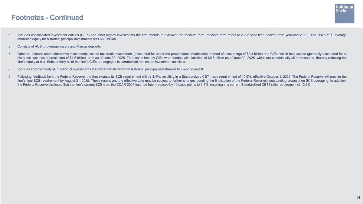 Footnotes - Continued 5. Includes consolidated investment entities (CIEs) and other legacy investments the firm intends to exit over the medium term (medium term refers to a 3-5 year time horizon from year-end 2022). The 2Q25 YTD average attributed equity for historical principal investments was $3.8 billion. 6. Consists of AUS, brokerage assets and Marcus deposits. 7. Other on-balance sheet alternative investments include tax credit investments (accounted for under the proportional amortization method of accounting) of $3.3 billion and CIEs, which held assets (generally accounted for at historical cost less depreciation) of $1.6 billion, both as of June 30, 2025. The assets held by CIEs were funded with liabilities of $0.8 billion as of June 30, 2025, which are substantially all nonrecourse, thereby reducing the firm’s equity at risk. Substantially all of the firm’s CIEs are engaged in commercial real estate investment activities. 8. Includes approximately $0.1 billion of investments that were transferred from historical principal investments to client co-invest. 9. Following feedback from the Federal Reserve, the firm expects its SCB requirement will be 3.4%, resulting in a Standardized CET1 ratio requirement of 10.9%, effective October 1, 2025. The Federal Reserve will provide the firm’s final SCB requirement by August 31, 2025. These results and the effective date may be subject to further changes pending the finalization of the Federal Reserve’s outstanding proposal on SCB averaging. In addition, the Federal Reserve disclosed that the firm’s current SCB from the CCAR 2024 test had been reduced by 10 basis points to 6.1%, resulting in a current Standardized CET1 ratio requirement of 13.6%. 14