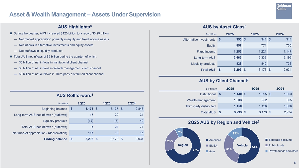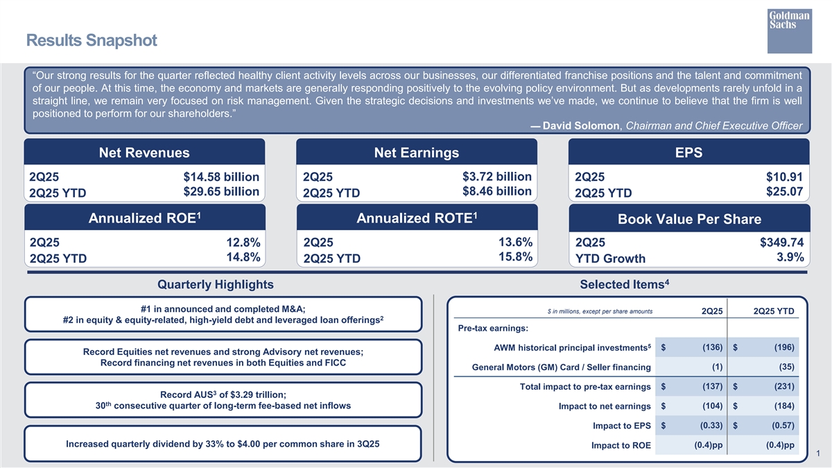Results Snapshot “Our strong results for the quarter reflected healthy client activity levels across our businesses, our differentiated franchise positions and the talent and commitment of our people. At this time, the economy and markets are generally responding positively to the evolving policy environment. But as developments rarely unfold in a straight line, we remain very focused on risk management. Given the strategic decisions and investments we’ve made, we continue to believe that the firm is well positioned to perform for our shareholders.” — David Solomon, Chairman and Chief Executive Officer Net Revenues Net Earnings EPS 2Q25 $14.58 billion 2Q25 $3.72 billion 2Q25 $10.91 $8.46 billion $29.65 billion $25.07 2Q25 YTD 2Q25 YTD 2Q25 YTD 1 1 Annualized ROE Annualized ROTE Book Value Per Share 13.6% 2Q25 12.8% 2Q25 2Q25 $349.74 14.8% 15.8% 3.9% 2Q25 YTD 2Q25 YTD YTD Growth 4 Quarterly Highlights Selected Items #1 in announced and completed M&A; $ in millions, except per share amounts 2Q25 2Q25 YTD 2 #2 in equity & equity-related, high-yield debt and leveraged loan offerings Pre-tax earnings: 5 $ (136) $ (196) AWM historical principal investments Record Equities net revenues and strong Advisory net revenues; Record financing net revenues in both Equities and FICC General Motors (GM) Card / Seller financing (1) (35) (137) (231) Total impact to pre-tax earnings $ $ 3 Record AUS of $3.29 trillion; th 30 consecutive quarter of long-term fee-based net inflows Impact to net earnings $ (104) $ (184) (0.33) (0.57) Impact to EPS $ $ Increased quarterly dividend by 33% to $4.00 per common share in 3Q25 (0.4)pp (0.4)pp Impact to ROE 1