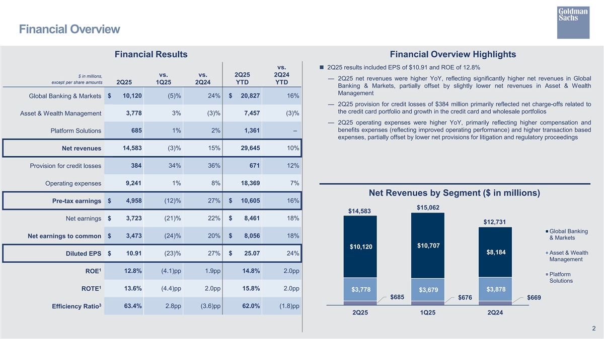 Financial Overview Financial Results Financial Overview Highlights vs.n 2Q25 results included EPS of $10.91 and ROE of 12.8% vs. vs. 2Q25 2Q24 $ in millions, — 2Q25 net revenues were higher YoY, reflecting significantly higher net revenues in Global except per share amounts 2Q25 1Q25 2Q24 YTD YTD Banking & Markets, partially offset by slightly lower net revenues in Asset & Wealth Management $ 10,120 (5)% 24% $ 20,827 16% Global Banking & Markets — 2Q25 provision for credit losses of $384 million primarily reflected net charge-offs related to the credit card portfolio and growth in the credit card and wholesale portfolios Asset & Wealth Management 3,778 3% (3)% 7,457 (3)% — 2Q25 operating expenses were higher YoY, primarily reflecting higher compensation and benefits expenses (reflecting improved operating performance) and higher transaction based 685 1% 2% 1,361 – Platform Solutions expenses, partially offset by lower net provisions for litigation and regulatory proceedings 14,583 (3)% 15% 29,645 10% Net revenues 384 34% 36% 671 12% Provision for credit losses 9,241 1% 8% 18,369 7% Operating expenses Net Revenues by Segment ($ in millions) 4,958 (12)% 27% $ 10,605 16% Pre-tax earnings $ $15,062 $14,583 $ 3,723 (21)% 22% $ 8,461 18% Net earnings $12,731 Global Banking $ 3,473 (24)% 20% $ 8,056 18% Net earnings to common & Markets $10,707 $10,120 $8,184 Asset & Wealth $ 10.91 (23)% 27% $ 25.07 24% Diluted EPS Management 1 ROE 12.8% (4.1)pp 1.9pp 14.8% 2.0pp Platform Solutions 1 ROTE 13.6% (4.4)pp 2.0pp 15.8% 2.0pp $3,878 $3,778 $3,679 $685 $676 $669 3 63.4% 2.8pp (3.6)pp 62.0% (1.8)pp Efficiency Ratio 2Q25 1Q25 2Q24 2
