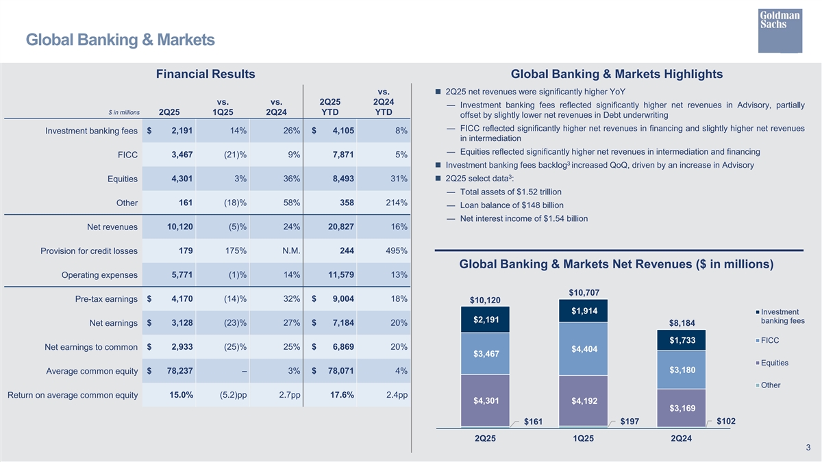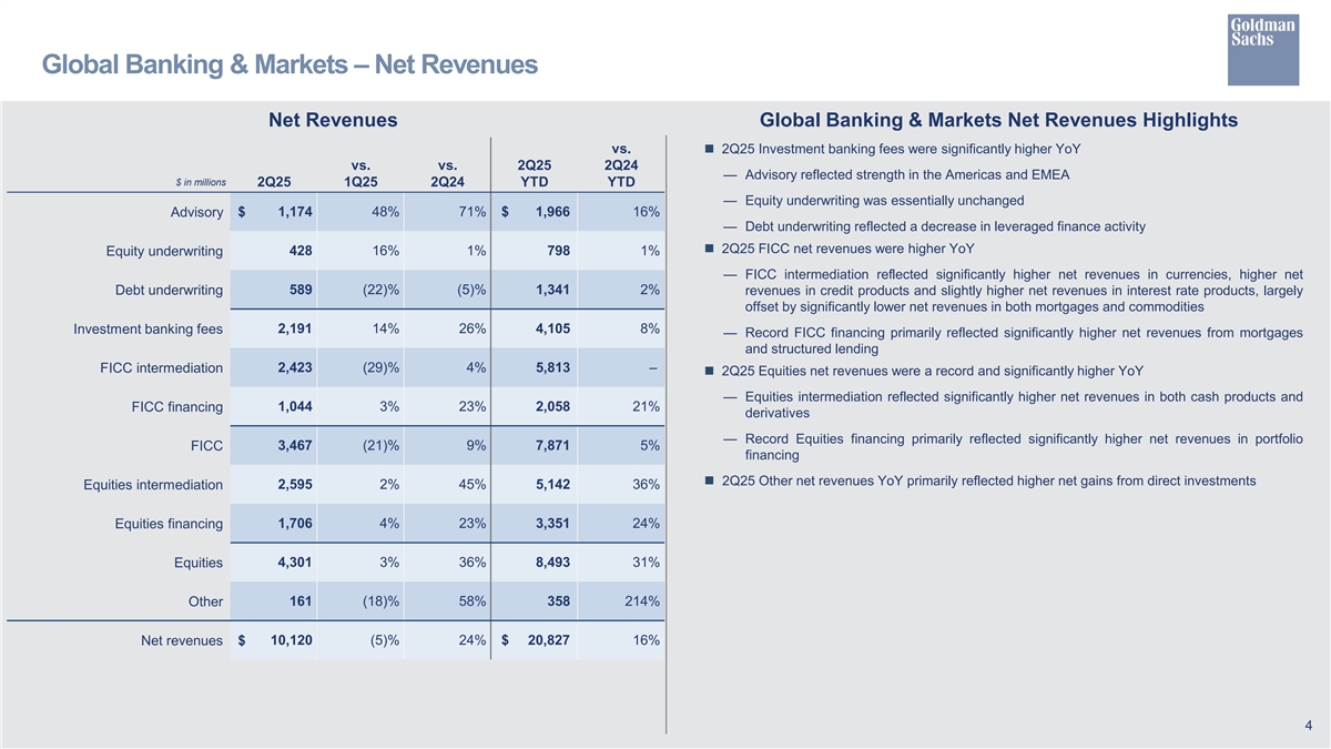 Global Banking & Markets Financial Results Global Banking & Markets Highlights vs.n 2Q25 net revenues were significantly higher YoY vs. vs. 2Q25 2Q24 — Investment banking fees reflected significantly higher net revenues in Advisory, partially $ in millions 2Q25 1Q25 2Q24 YTD YTD offset by slightly lower net revenues in Debt underwriting — FICC reflected significantly higher net revenues in financing and slightly higher net revenues $ 2,191 14% 26% $ 4,105 8% Investment banking fees in intermediation — Equities reflected significantly higher net revenues in intermediation and financing 3,467 (21)% 9% 7,871 5% FICC 3 n Investment banking fees backlog increased QoQ, driven by an increase in Advisory 3 4,301 3% 36% 8,493 31%n 2Q25 select data : Equities — Total assets of $1.52 trillion 161 (18)% 58% 358 214% Other — Loan balance of $148 billion — Net interest income of $1.54 billion 10,120 (5)% 24% 20,827 16% Net revenues Provision for credit losses 179 175% N.M. 244 495% Global Banking & Markets Net Revenues ($ in millions) Operating expenses 5,771 (1)% 14% 11,579 13% $10,707 Pre-tax earnings $ 4,170 (14)% 32% $ 9,004 18% $10,120 $1,914 Investment $2,191 banking fees Net earnings $ 3,128 (23)% 27% $ 7,184 20% $8,184 $1,733 FICC Net earnings to common $ 2,933 (25)% 25% $ 6,869 20% $4,404 $3,467 Equities $3,180 Average common equity $ 78,237 – 3% $ 78,071 4% Other Return on average common equity 15.0% (5.2)pp 2.7pp 17.6% 2.4pp $4,301 $4,192 $3,169 $161 $197 $102 2Q25 1Q25 2Q24 3