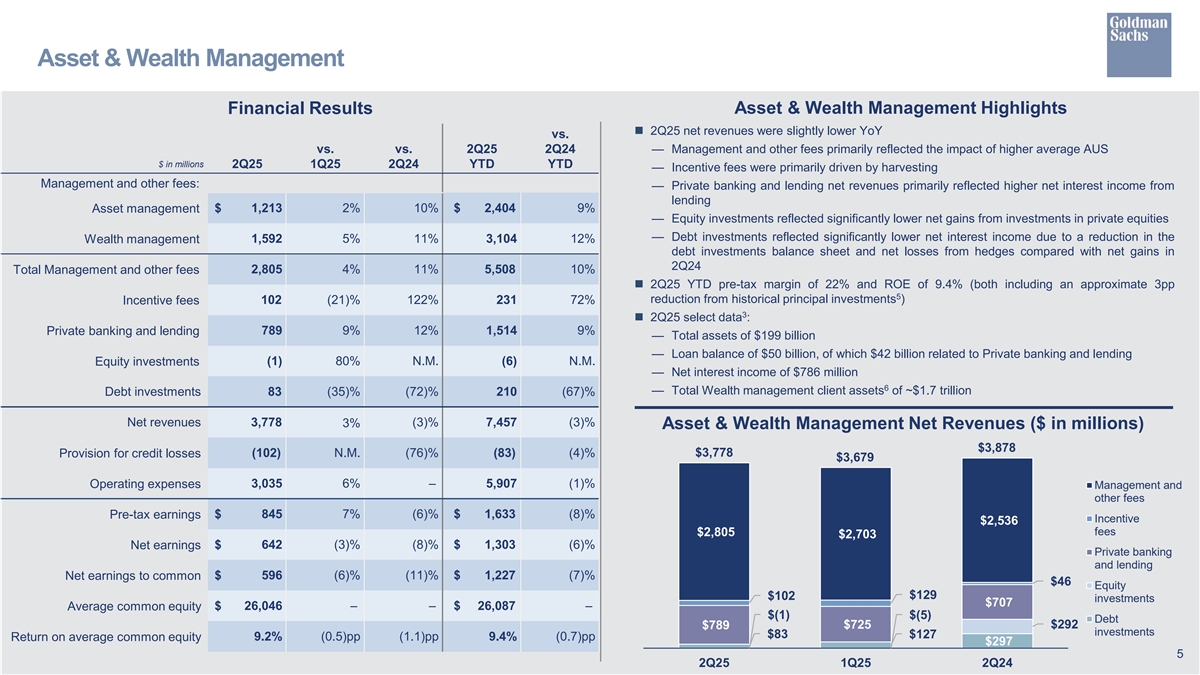Asset & Wealth Management Financial Results Asset & Wealth Management Highlights n 2Q25 net revenues were slightly lower YoY vs. vs. vs. 2Q25 2Q24 — Management and other fees primarily reflected the impact of higher average AUS $ in millions 2Q25 1Q25 2Q24 YTD YTD — Incentive fees were primarily driven by harvesting Management and other fees: — Private banking and lending net revenues primarily reflected higher net interest income from lending Asset management $ 1,213 2% 10% $ 2,404 9% — Equity investments reflected significantly lower net gains from investments in private equities — Debt investments reflected significantly lower net interest income due to a reduction in the 1,592 5% 11% 3,104 12% Wealth management debt investments balance sheet and net losses from hedges compared with net gains in 2Q24 Total Management and other fees 2,805 4% 11% 5,508 10% n 2Q25 YTD pre-tax margin of 22% and ROE of 9.4% (both including an approximate 3pp 5 102 (21)% 122% 231 72% reduction from historical principal investments ) Incentive fees 3 n 2Q25 select data : Private banking and lending 789 9% 12% 1,514 9% — Total assets of $199 billion — Loan balance of $50 billion, of which $42 billion related to Private banking and lending (1) 80% N.M. (6) N.M. Equity investments — Net interest income of $786 million 6 — Total Wealth management client assets of ~$1.7 trillion Debt investments 83 (35)% (72)% 210 (67)% Net revenues 3,778 (3)% 7,457 (3)% 3% Asset & Wealth Management Net Revenues ($ in millions) $3,878 $3,778 Provision for credit losses (102) N.M. (76)% (83) (4)% $3,679 3,035 6% – 5,907 (1)% Operating expenses Management and other fees Pre-tax earnings $ 845 7% (6)% $ 1,633 (8)% Incentive $2,536 fees $2,805 $2,703 $ 642 (3)% (8)% $ 1,303 (6)% Net earnings Private banking and lending Net earnings to common $ 596 (6)% (11)% $ 1,227 (7)% $46 Equity $129 $102 investments $707 $ 26,046 – – $ 26,087 – Average common equity $(1) $(5) Debt $725 $292 $789 investments $83 $127 Return on average common equity 9.2% (0.5)pp (1.1)pp 9.4% (0.7)pp $297 5 2Q25 1Q25 2Q24