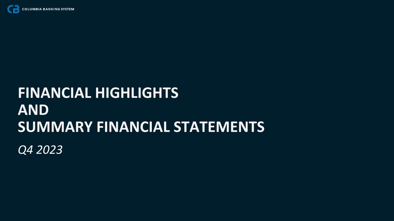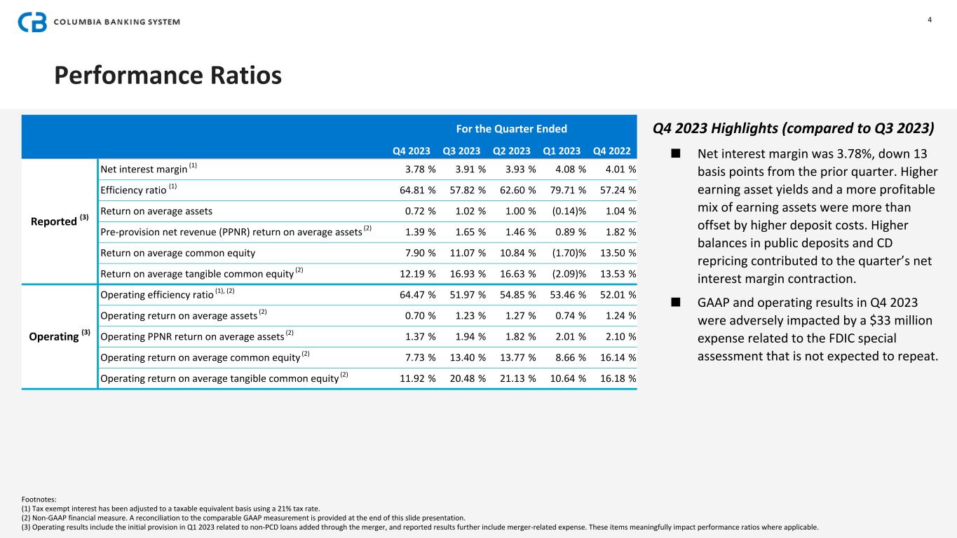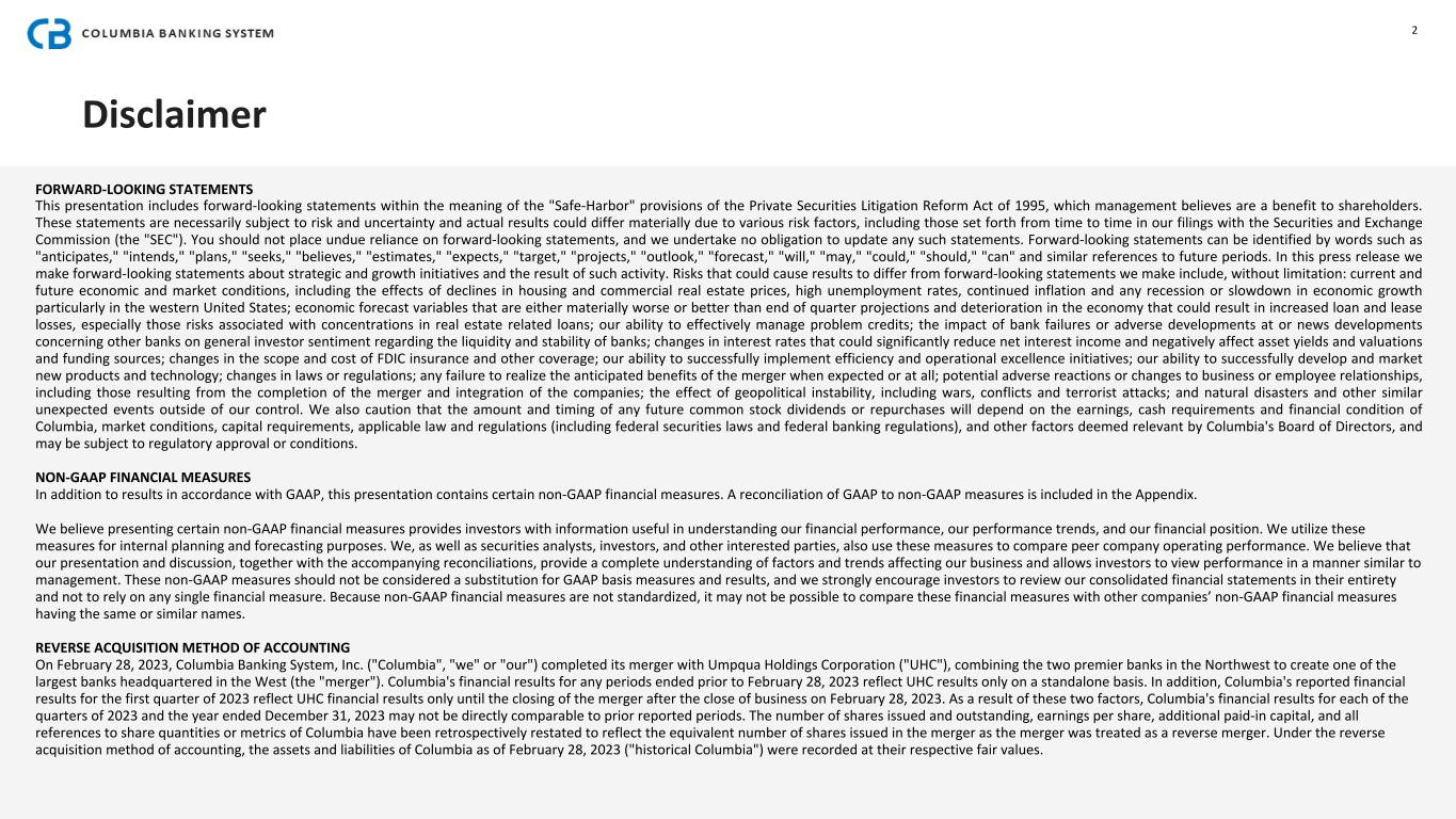 Disclaimer FORWARD-LOOKING STATEMENTS This presentation includes forward-looking statements within the meaning of the "Safe-Harbor" provisions of the Private Securities Litigation Reform Act of 1995, which management believes are a benefit to shareholders. These statements are necessarily subject to risk and uncertainty and actual results could differ materially due to various risk factors, including those set forth from time to time in our filings with the Securities and Exchange Commission (the "SEC"). You should not place undue reliance on forward-looking statements, and we undertake no obligation to update any such statements. Forward-looking statements can be identified by words such as "anticipates," "intends," "plans," "seeks," "believes," "estimates," "expects," "target," "projects," "outlook," "forecast," "will," "may," "could," "should," "can" and similar references to future periods. In this press release we make forward-looking statements about strategic and growth initiatives and the result of such activity. Risks that could cause results to differ from forward-looking statements we make include, without limitation: current and future economic and market conditions, including the effects of declines in housing and commercial real estate prices, high unemployment rates, continued inflation and any recession or slowdown in economic growth particularly in the western United States; economic forecast variables that are either materially worse or better than end of quarter projections and deterioration in the economy that could result in increased loan and lease losses, especially those risks associated with concentrations in real estate related loans; our ability to effectively manage problem credits; the impact of bank failures or adverse developments at or news developments concerning other banks on general investor sentiment regarding the liquidity and stability of banks; changes in interest rates that could significantly reduce net interest income and negatively affect asset yields and valuations and funding sources; changes in the scope and cost of FDIC insurance and other coverage; our ability to successfully implement efficiency and operational excellence initiatives; our ability to successfully develop and market new products and technology; changes in laws or regulations; any failure to realize the anticipated benefits of the merger when expected or at all; potential adverse reactions or changes to business or employee relationships, including those resulting from the completion of the merger and integration of the companies; the effect of geopolitical instability, including wars, conflicts and terrorist attacks; and natural disasters and other similar unexpected events outside of our control. We also caution that the amount and timing of any future common stock dividends or repurchases will depend on the earnings, cash requirements and financial condition of Columbia, market conditions, capital requirements, applicable law and regulations (including federal securities laws and federal banking regulations), and other factors deemed relevant by Columbia's Board of Directors, and may be subject to regulatory approval or conditions. NON-GAAP FINANCIAL MEASURES In addition to results in accordance with GAAP, this presentation contains certain non-GAAP financial measures. A reconciliation of GAAP to non-GAAP measures is included in the Appendix. We believe presenting certain non-GAAP financial measures provides investors with information useful in understanding our financial performance, our performance trends, and our financial position. We utilize these measures for internal planning and forecasting purposes. We, as well as securities analysts, investors, and other interested parties, also use these measures to compare peer company operating performance. We believe that our presentation and discussion, together with the accompanying reconciliations, provide a complete understanding of factors and trends affecting our business and allows investors to view performance in a manner similar to management. These non-GAAP measures should not be considered a substitution for GAAP basis measures and results, and we strongly encourage investors to review our consolidated financial statements in their entirety and not to rely on any single financial measure. Because non-GAAP financial measures are not standardized, it may not be possible to compare these financial measures with other companies’ non-GAAP financial measures having the same or similar names. REVERSE ACQUISITION METHOD OF ACCOUNTING On February 28, 2023, Columbia Banking System, Inc. ("Columbia", "we" or "our") completed its merger with Umpqua Holdings Corporation ("UHC"), combining the two premier banks in the Northwest to create one of the largest banks headquartered in the West (the "merger"). Columbia's financial results for any periods ended prior to February 28, 2023 reflect UHC results only on a standalone basis. In addition, Columbia's reported financial results for the first quarter of 2023 reflect UHC financial results only until the closing of the merger after the close of business on February 28, 2023. As a result of these two factors, Columbia's financial results for each of the quarters of 2023 and the year ended December 31, 2023 may not be directly comparable to prior reported periods. The number of shares issued and outstanding, earnings per share, additional paid-in capital, and all references to share quantities or metrics of Columbia have been retrospectively restated to reflect the equivalent number of shares issued in the merger as the merger was treated as a reverse merger. Under the reverse acquisition method of accounting, the assets and liabilities of Columbia as of February 28, 2023 ("historical Columbia") were recorded at their respective fair values. 2