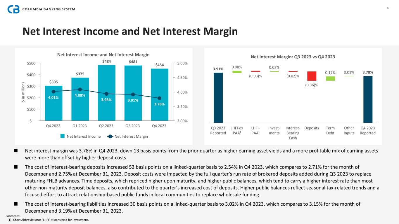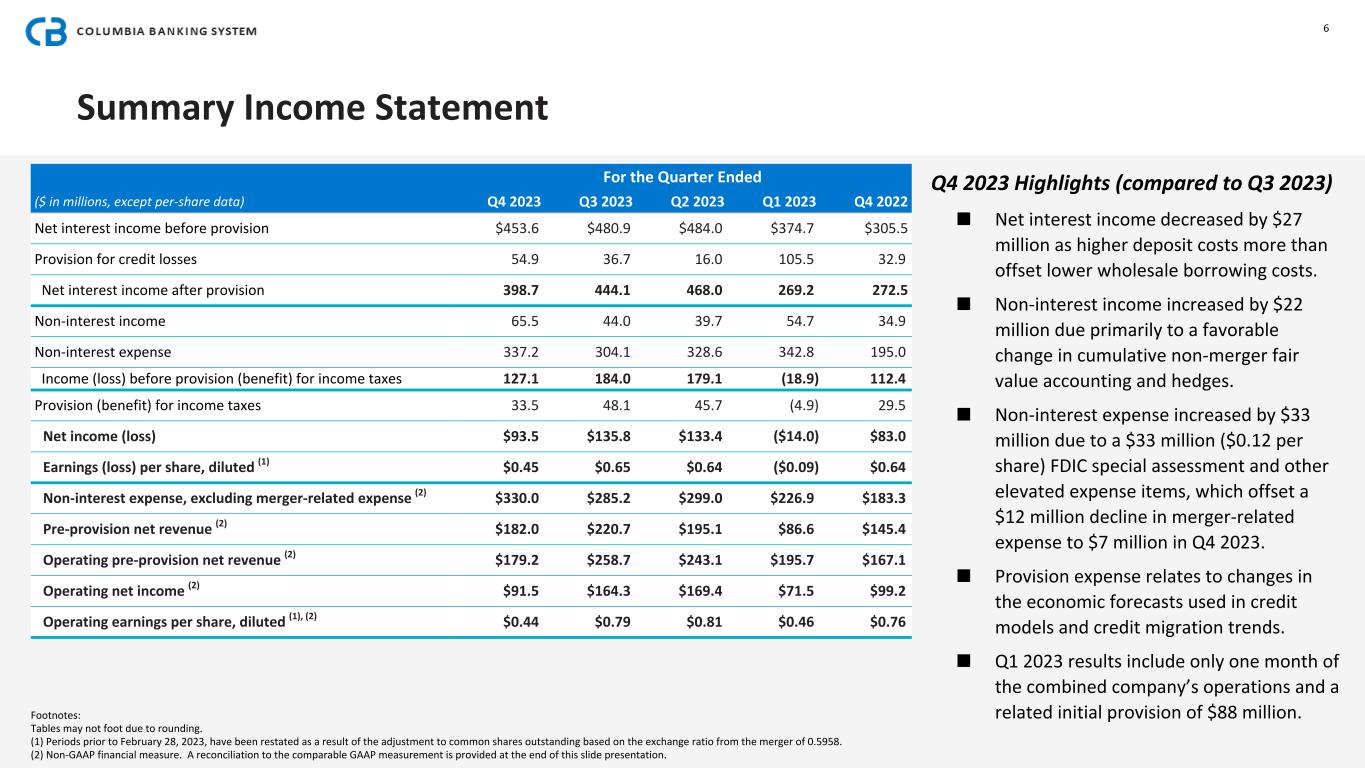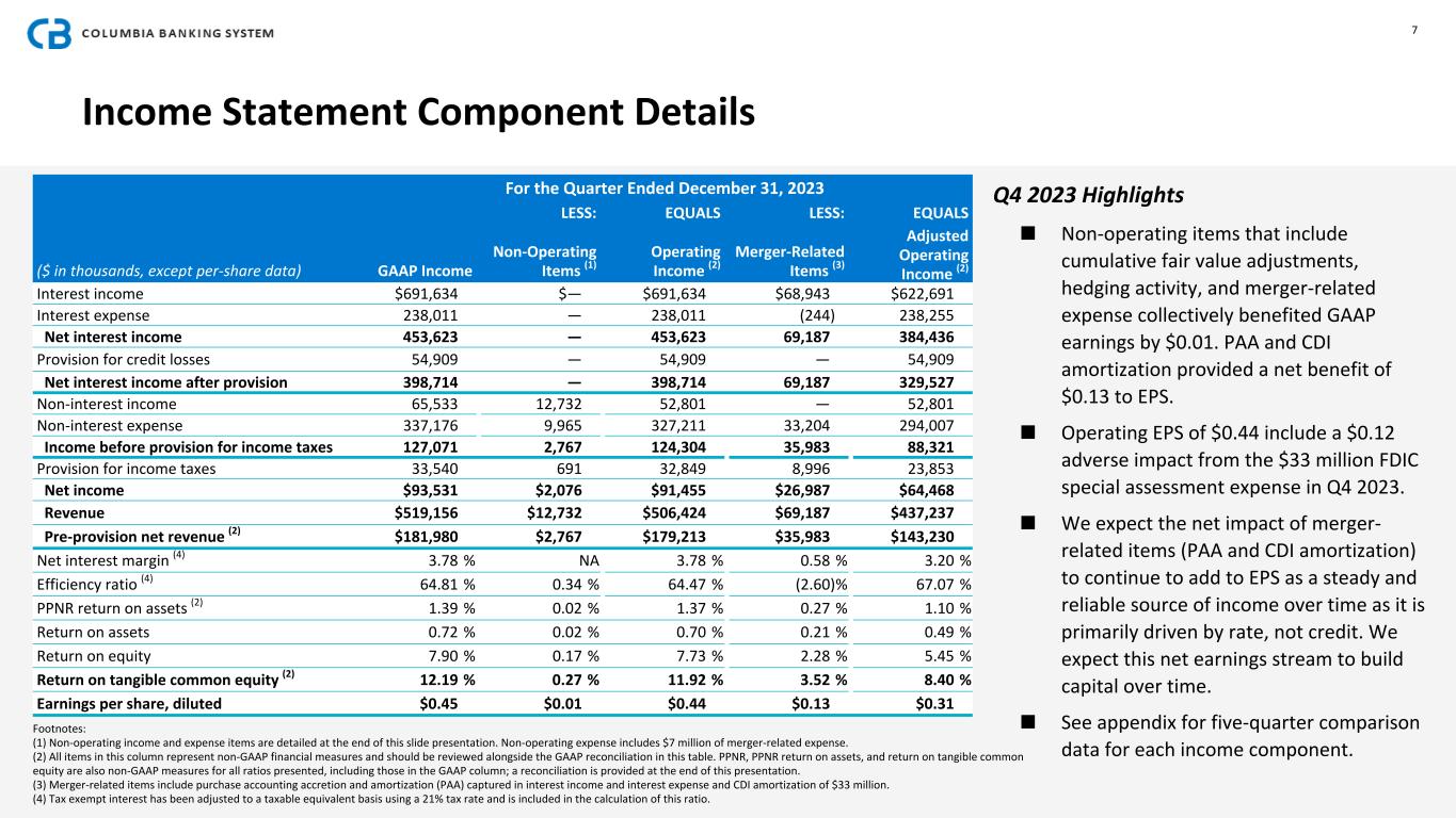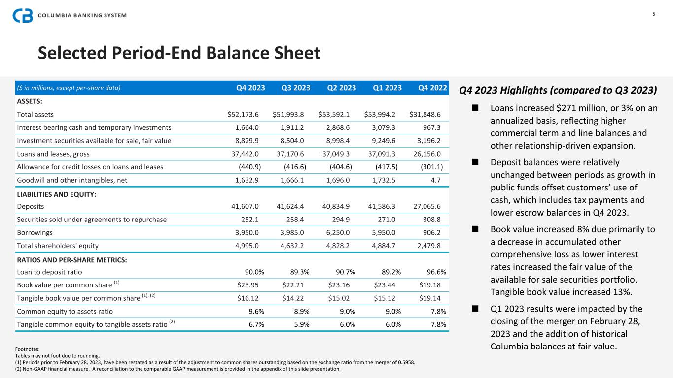 Disclaimer FORWARD-LOOKING STATEMENTS This presentation includes forward-looking statements within the meaning of the "Safe-Harbor" provisions of the Private Securities Litigation Reform Act of 1995, which management believes are a benefit to shareholders. These statements are necessarily subject to risk and uncertainty and actual results could differ materially due to various risk factors, including those set forth from time to time in our filings with the Securities and Exchange Commission (the "SEC"). You should not place undue reliance on forward-looking statements, and we undertake no obligation to update any such statements. Forward-looking statements can be identified by words such as "anticipates," "intends," "plans," "seeks," "believes," "estimates," "expects," "target," "projects," "outlook," "forecast," "will," "may," "could," "should," "can" and similar references to future periods. In this press release we make forward-looking statements about strategic and growth initiatives and the result of such activity. Risks that could cause results to differ from forward-looking statements we make include, without limitation: current and future economic and market conditions, including the effects of declines in housing and commercial real estate prices, high unemployment rates, continued inflation and any recession or slowdown in economic growth particularly in the western United States; economic forecast variables that are either materially worse or better than end of quarter projections and deterioration in the economy that could result in increased loan and lease losses, especially those risks associated with concentrations in real estate related loans; our ability to effectively manage problem credits; the impact of bank failures or adverse developments at or news developments concerning other banks on general investor sentiment regarding the liquidity and stability of banks; changes in interest rates that could significantly reduce net interest income and negatively affect asset yields and valuations and funding sources; changes in the scope and cost of FDIC insurance and other coverage; our ability to successfully implement efficiency and operational excellence initiatives; our ability to successfully develop and market new products and technology; changes in laws or regulations; any failure to realize the anticipated benefits of the merger when expected or at all; potential adverse reactions or changes to business or employee relationships, including those resulting from the completion of the merger and integration of the companies; the effect of geopolitical instability, including wars, conflicts and terrorist attacks; and natural disasters and other similar unexpected events outside of our control. We also caution that the amount and timing of any future common stock dividends or repurchases will depend on the earnings, cash requirements and financial condition of Columbia, market conditions, capital requirements, applicable law and regulations (including federal securities laws and federal banking regulations), and other factors deemed relevant by Columbia's Board of Directors, and may be subject to regulatory approval or conditions. NON-GAAP FINANCIAL MEASURES In addition to results in accordance with GAAP, this presentation contains certain non-GAAP financial measures. A reconciliation of GAAP to non-GAAP measures is included in the Appendix. We believe presenting certain non-GAAP financial measures provides investors with information useful in understanding our financial performance, our performance trends, and our financial position. We utilize these measures for internal planning and forecasting purposes. We, as well as securities analysts, investors, and other interested parties, also use these measures to compare peer company operating performance. We believe that our presentation and discussion, together with the accompanying reconciliations, provide a complete understanding of factors and trends affecting our business and allows investors to view performance in a manner similar to management. These non-GAAP measures should not be considered a substitution for GAAP basis measures and results, and we strongly encourage investors to review our consolidated financial statements in their entirety and not to rely on any single financial measure. Because non-GAAP financial measures are not standardized, it may not be possible to compare these financial measures with other companies’ non-GAAP financial measures having the same or similar names. REVERSE ACQUISITION METHOD OF ACCOUNTING On February 28, 2023, Columbia Banking System, Inc. ("Columbia", "we" or "our") completed its merger with Umpqua Holdings Corporation ("UHC"), combining the two premier banks in the Northwest to create one of the largest banks headquartered in the West (the "merger"). Columbia's financial results for any periods ended prior to February 28, 2023 reflect UHC results only on a standalone basis. In addition, Columbia's reported financial results for the first quarter of 2023 reflect UHC financial results only until the closing of the merger after the close of business on February 28, 2023. As a result of these two factors, Columbia's financial results for each of the quarters of 2023 and the year ended December 31, 2023 may not be directly comparable to prior reported periods. The number of shares issued and outstanding, earnings per share, additional paid-in capital, and all references to share quantities or metrics of Columbia have been retrospectively restated to reflect the equivalent number of shares issued in the merger as the merger was treated as a reverse merger. Under the reverse acquisition method of accounting, the assets and liabilities of Columbia as of February 28, 2023 ("historical Columbia") were recorded at their respective fair values. 2