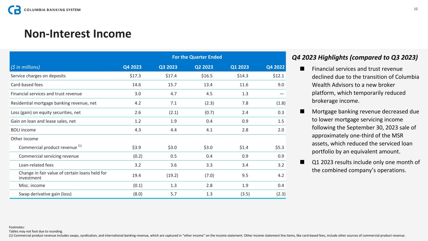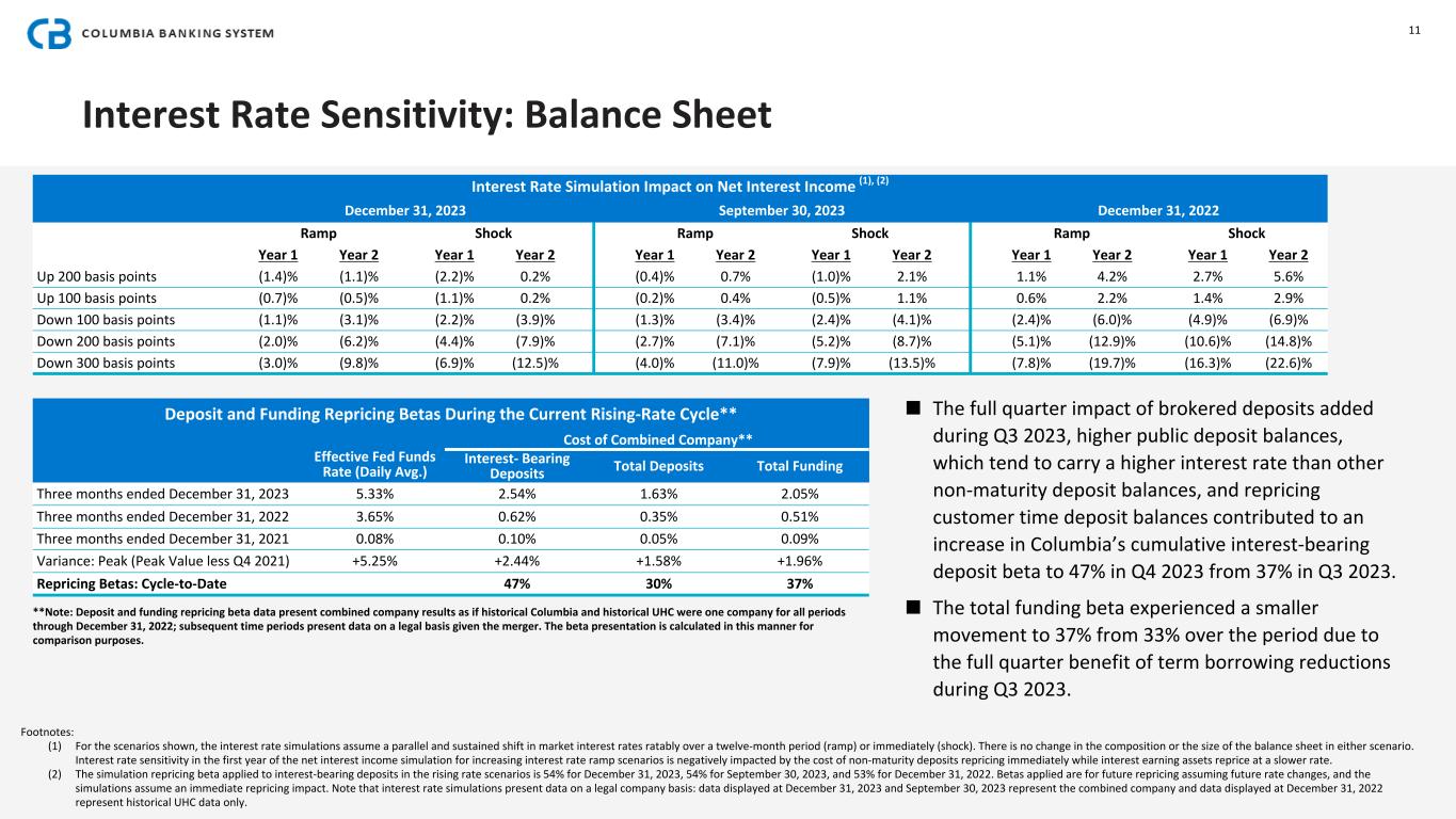 Interest Rate Sensitivity: Balance Sheet Interest Rate Simulation Impact on Net Interest Income (1), (2) December 31, 2023 September 30, 2023 December 31, 2022 Ramp Shock Ramp Shock Ramp Shock Year 1 Year 2 Year 1 Year 2 Year 1 Year 2 Year 1 Year 2 Year 1 Year 2 Year 1 Year 2 Up 200 basis points (1.4)% (1.1)% (2.2)% 0.2% (0.4)% 0.7% (1.0)% 2.1% 1.1% 4.2% 2.7% 5.6% Up 100 basis points (0.7)% (0.5)% (1.1)% 0.2% (0.2)% 0.4% (0.5)% 1.1% 0.6% 2.2% 1.4% 2.9% Down 100 basis points (1.1)% (3.1)% (2.2)% (3.9)% (1.3)% (3.4)% (2.4)% (4.1)% (2.4)% (6.0)% (4.9)% (6.9)% Down 200 basis points (2.0)% (6.2)% (4.4)% (7.9)% (2.7)% (7.1)% (5.2)% (8.7)% (5.1)% (12.9)% (10.6)% (14.8)% Down 300 basis points (3.0)% (9.8)% (6.9)% (12.5)% (4.0)% (11.0)% (7.9)% (13.5)% (7.8)% (19.7)% (16.3)% (22.6)% Footnotes: (1) For the scenarios shown, the interest rate simulations assume a parallel and sustained shift in market interest rates ratably over a twelve-month period (ramp) or immediately (shock). There is no change in the composition or the size of the balance sheet in either scenario. Interest rate sensitivity in the first year of the net interest income simulation for increasing interest rate ramp scenarios is negatively impacted by the cost of non-maturity deposits repricing immediately while interest earning assets reprice at a slower rate. (2) The simulation repricing beta applied to interest-bearing deposits in the rising rate scenarios is 54% for December 31, 2023, 54% for September 30, 2023, and 53% for December 31, 2022. Betas applied are for future repricing assuming future rate changes, and the simulations assume an immediate repricing impact. Note that interest rate simulations present data on a legal company basis: data displayed at December 31, 2023 and September 30, 2023 represent the combined company and data displayed at December 31, 2022 represent historical UHC data only. ■ The full quarter impact of brokered deposits added during Q3 2023, higher public deposit balances, which tend to carry a higher interest rate than other non-maturity deposit balances, and repricing customer time deposit balances contributed to an increase in Columbia’s cumulative interest-bearing deposit beta to 47% in Q4 2023 from 37% in Q3 2023. ■ The total funding beta experienced a smaller movement to 37% from 33% over the period due to the full quarter benefit of term borrowing reductions during Q3 2023. 11 Deposit and Funding Repricing Betas During the Current Rising-Rate Cycle** Effective Fed Funds Rate (Daily Avg.) Cost of Combined Company** Interest- Bearing Deposits Total Deposits Total Funding Three months ended December 31, 2023 5.33% 2.54% 1.63% 2.05% Three months ended December 31, 2022 3.65% 0.62% 0.35% 0.51% Three months ended December 31, 2021 0.08% 0.10% 0.05% 0.09% Variance: Peak (Peak Value less Q4 2021) +5.25% +2.44% +1.58% +1.96% Repricing Betas: Cycle-to-Date 47% 30% 37% **Note: Deposit and funding repricing beta data present combined company results as if historical Columbia and historical UHC were one company for all periods through December 31, 2022; subsequent time periods present data on a legal basis given the merger. The beta presentation is calculated in this manner for comparison purposes.