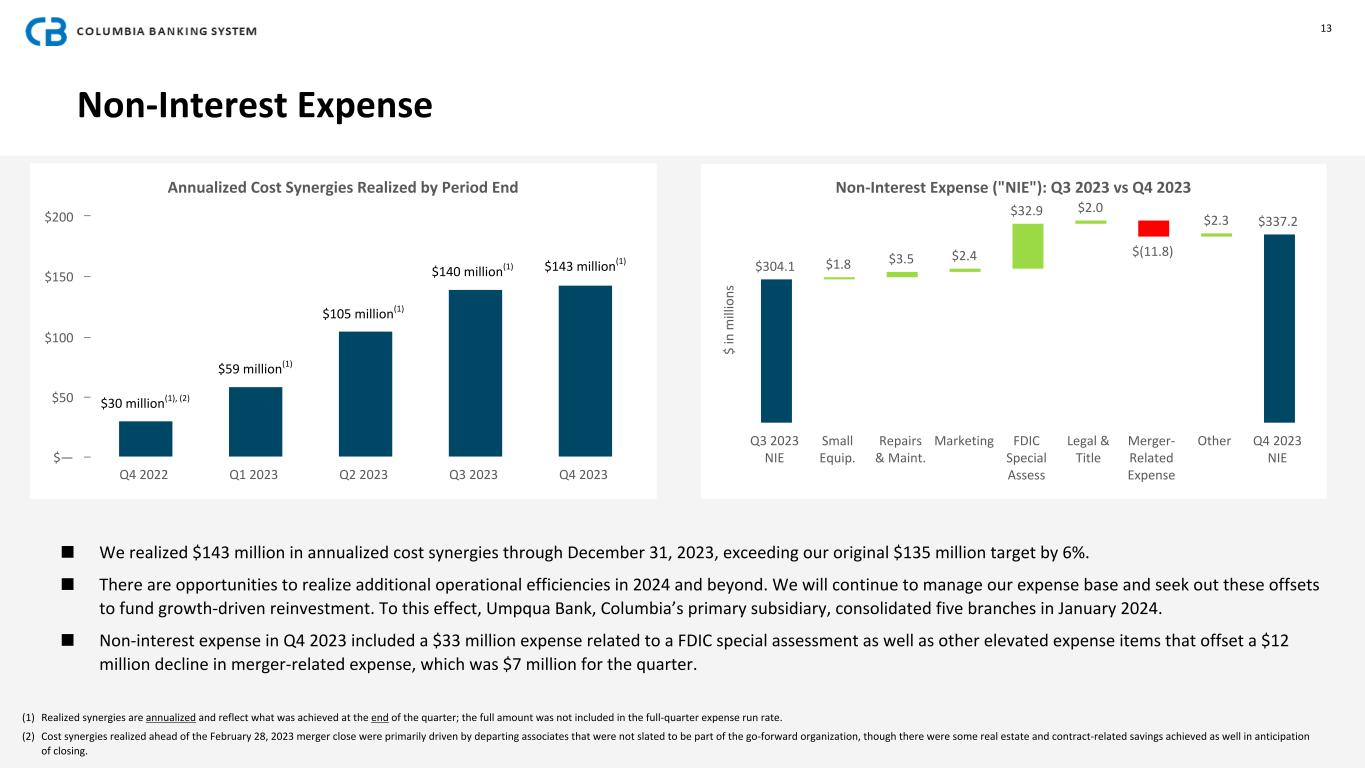 Non-Interest Income Footnotes: Tables may not foot due to rounding. (1) Commercial product revenue includes swaps, syndication, and international banking revenue, which are captured in “other income” on the income statement. Other income statement line items, like card-based fees, include other sources of commercial product revenue. For the Quarter Ended ($ in millions) Q4 2023 Q3 2023 Q2 2023 Q1 2023 Q4 2022 Service charges on deposits $17.3 $17.4 $16.5 $14.3 $12.1 Card-based fees 14.6 15.7 13.4 11.6 9.0 Financial services and trust revenue 3.0 4.7 4.5 1.3 — Residential mortgage banking revenue, net 4.2 7.1 (2.3) 7.8 (1.8) Loss (gain) on equity securities, net 2.6 (2.1) (0.7) 2.4 0.3 Gain on loan and lease sales, net 1.2 1.9 0.4 0.9 1.5 BOLI income 4.3 4.4 4.1 2.8 2.0 Other income Commercial product revenue (1) $3.9 $3.0 $3.0 $1.4 $5.3 Commercial servicing revenue (0.2) 0.5 0.4 0.9 0.9 Loan-related fees 3.2 3.6 3.3 3.4 3.2 Change in fair value of certain loans held for investment 19.4 (19.2) (7.0) 9.5 4.2 Misc. income (0.1) 1.3 2.8 1.9 0.4 Swap derivative gain (loss) (8.0) 5.7 1.3 (3.5) (2.3) 12 Q4 2023 Highlights (compared to Q3 2023) ■ Financial services and trust revenue declined due to the transition of Columbia Wealth Advisors to a new broker platform, which temporarily reduced brokerage income. ■ Mortgage banking revenue decreased due to lower mortgage servicing income following the September 30, 2023 sale of approximately one-third of the MSR assets, which reduced the serviced loan portfolio by an equivalent amount. ■ Q1 2023 results include only one month of the combined company’s operations.