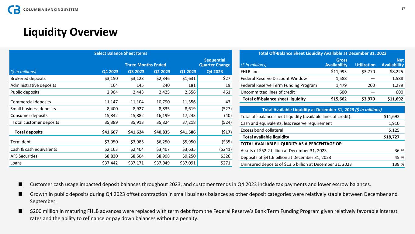 Liquidity Overview Total Available Liquidity at December 31, 2023 ($ in millions) Total off-balance sheet liquidity (available lines of credit): $11,692 Cash and equivalents, less reserve requirement 1,910 Excess bond collateral 5,125 Total available liquidity $18,727 TOTAL AVAILABLE LIQUIDITY AS A PERCENTAGE OF: Assets of $52.2 billion at December 31, 2023 36 % Deposits of $41.6 billion at December 31, 2023 45 % Uninsured deposits of $13.5 billion at December 31, 2023 138 % Total Off-Balance Sheet Liquidity Available at December 31, 2023 ($ in millions) Gross Availability Utilization Net Availability FHLB lines $11,995 $3,770 $8,225 Federal Reserve Discount Window 1,588 — 1,588 Federal Reserve Term Funding Program 1,479 200 1,279 Uncommitted lines of credit 600 — 600 Total off-balance sheet liquidity $15,662 $3,970 $11,692 17 ■ Customer cash usage impacted deposit balances throughout 2023, and customer trends in Q4 2023 include tax payments and lower escrow balances. ■ Growth in public deposits during Q4 2023 offset contraction in small business balances as other deposit categories were relatively stable between December and September. ■ $200 million in maturing FHLB advances were replaced with term debt from the Federal Reserve’s Bank Term Funding Program given relatively favorable interest rates and the ability to refinance or pay down balances without a penalty. Select Balance Sheet Items Three Months Ended Sequential Quarter Change ($ in millions) Q4 2023 Q3 2023 Q2 2023 Q1 2023 Q4 2023 Brokered deposits $3,150 $3,123 $2,346 $1,631 $27 Administrative deposits 164 145 240 181 19 Public deposits 2,904 2,443 2,425 2,556 461 Commercial deposits 11,147 11,104 10,790 11,356 43 Small business deposits 8,400 8,927 8,835 8,619 (527) Consumer deposits 15,842 15,882 16,199 17,243 (40) Total customer deposits 35,389 35,913 35,824 37,218 (524) Total deposits $41,607 $41,624 $40,835 $41,586 ($17) Term debt $3,950 $3,985 $6,250 $5,950 ($35) Cash & cash equivalents $2,163 $2,404 $3,407 $3,635 ($241) AFS Securities $8,830 $8,504 $8,998 $9,250 $326 Loans $37,442 $37,171 $37,049 $37,091 $271