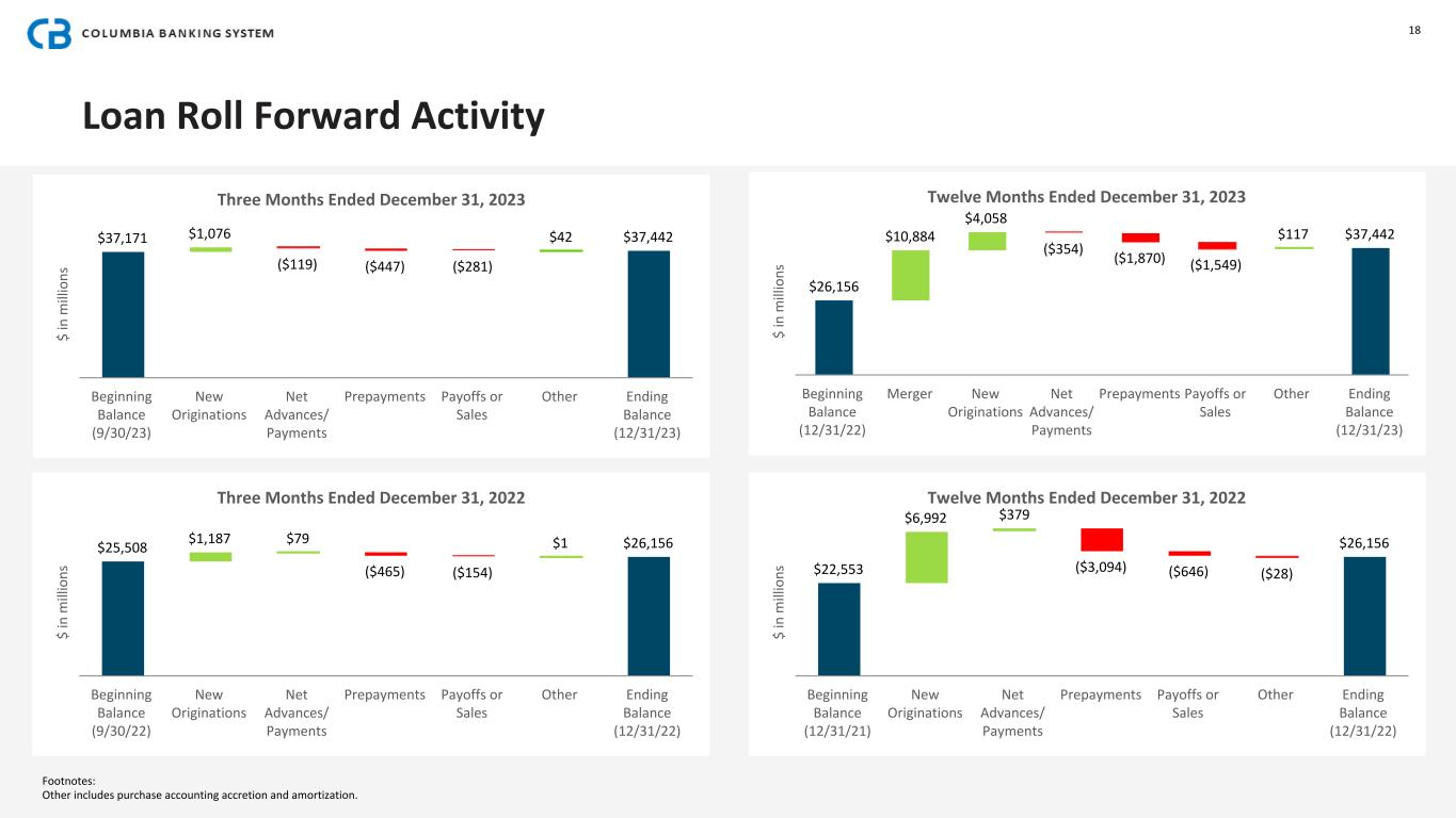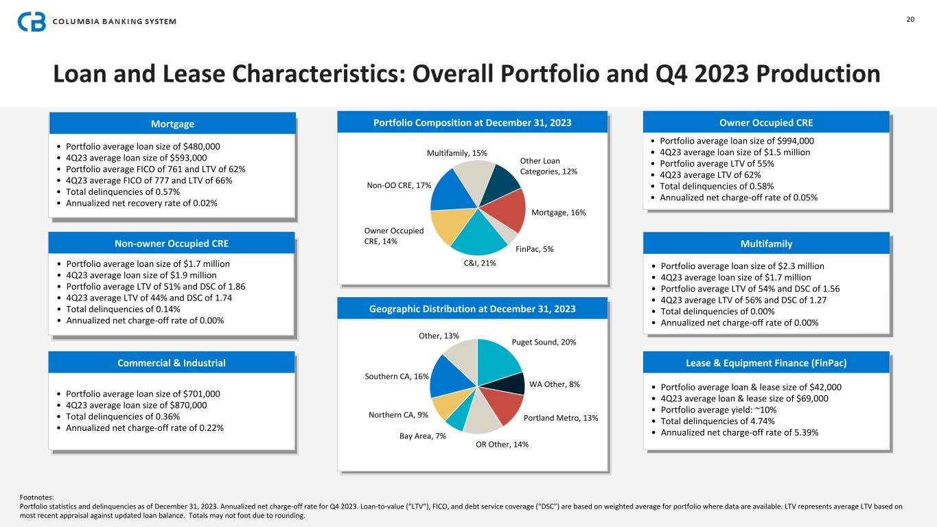 Loan and Lease Characteristics: Overall Portfolio and Q4 2023 Production Footnotes: Portfolio statistics and delinquencies as of December 31, 2023. Annualized net charge-off rate for Q4 2023. Loan-to-value (“LTV”), FICO, and debt service coverage (“DSC”) are based on weighted average for portfolio where data are available. LTV represents average LTV based on most recent appraisal against updated loan balance. Totals may not foot due to rounding. • Portfolio average loan size of $480,000 • 4Q23 average loan size of $593,000 • Portfolio average FICO of 761 and LTV of 62% • 4Q23 average FICO of 777 and LTV of 66% • Total delinquencies of 0.57% • Annualized net recovery rate of 0.02% Non-owner Occupied CRE • Portfolio average loan size of $1.7 million • 4Q23 average loan size of $1.9 million • Portfolio average LTV of 51% and DSC of 1.86 • 4Q23 average LTV of 44% and DSC of 1.74 • Total delinquencies of 0.14% • Annualized net charge-off rate of 0.00% Commercial & Industrial • Portfolio average loan size of $701,000 • 4Q23 average loan size of $870,000 • Total delinquencies of 0.36% • Annualized net charge-off rate of 0.22% Multifamily • Portfolio average loan size of $2.3 million • 4Q23 average loan size of $1.7 million • Portfolio average LTV of 54% and DSC of 1.56 • 4Q23 average LTV of 56% and DSC of 1.27 • Total delinquencies of 0.00% • Annualized net charge-off rate of 0.00% Owner Occupied CRE • Portfolio average loan size of $994,000 • 4Q23 average loan size of $1.5 million • Portfolio average LTV of 55% • 4Q23 average LTV of 62% • Total delinquencies of 0.58% • Annualized net charge-off rate of 0.05% Lease & Equipment Finance (FinPac) • Portfolio average loan & lease size of $42,000 • 4Q23 average loan & lease size of $69,000 • Portfolio average yield: ~10% • Total delinquencies of 4.74% • Annualized net charge-off rate of 5.39% Puget Sound, 20% WA Other, 8% Portland Metro, 13% OR Other, 14% Bay Area, 7% Northern CA, 9% Southern CA, 16% Other, 13% Mortgage, 16% FinPac, 5% C&I, 21% Owner Occupied CRE, 14% Non-OO CRE, 17% Multifamily, 15% Other Loan Categories, 12% Portfolio Composition at December 31, 2023 Geographic Distribution at December 31, 2023 Mortgage 20