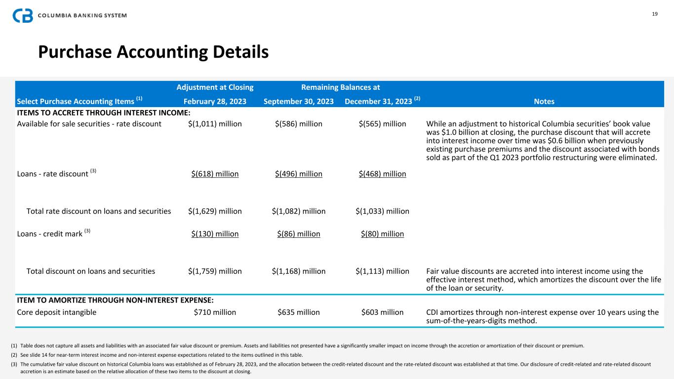 Purchase Accounting Details (1) Table does not capture all assets and liabilities with an associated fair value discount or premium. Assets and liabilities not presented have a significantly smaller impact on income through the accretion or amortization of their discount or premium. (2) See slide 14 for near-term interest income and non-interest expense expectations related to the items outlined in this table. (3) The cumulative fair value discount on historical Columbia loans was established as of February 28, 2023, and the allocation between the credit-related discount and the rate-related discount was established at that time. Our disclosure of credit-related and rate-related discount accretion is an estimate based on the relative allocation of these two items to the discount at closing. Adjustment at Closing Remaining Balances at Select Purchase Accounting Items (1) February 28, 2023 September 30, 2023 December 31, 2023 (2) Notes ITEMS TO ACCRETE THROUGH INTEREST INCOME: Available for sale securities - rate discount $(1,011) million $(586) million $(565) million While an adjustment to historical Columbia securities’ book value was $1.0 billion at closing, the purchase discount that will accrete into interest income over time was $0.6 billion when previously existing purchase premiums and the discount associated with bonds sold as part of the Q1 2023 portfolio restructuring were eliminated. Loans - rate discount (3) $(618) million $(496) million $(468) million Total rate discount on loans and securities $(1,629) million $(1,082) million $(1,033) million Loans - credit mark (3) $(130) million $(86) million $(80) million Total discount on loans and securities $(1,759) million $(1,168) million $(1,113) million Fair value discounts are accreted into interest income using the effective interest method, which amortizes the discount over the life of the loan or security. ITEM TO AMORTIZE THROUGH NON-INTEREST EXPENSE: Core deposit intangible $710 million $635 million $603 million CDI amortizes through non-interest expense over 10 years using the sum-of-the-years-digits method. 19