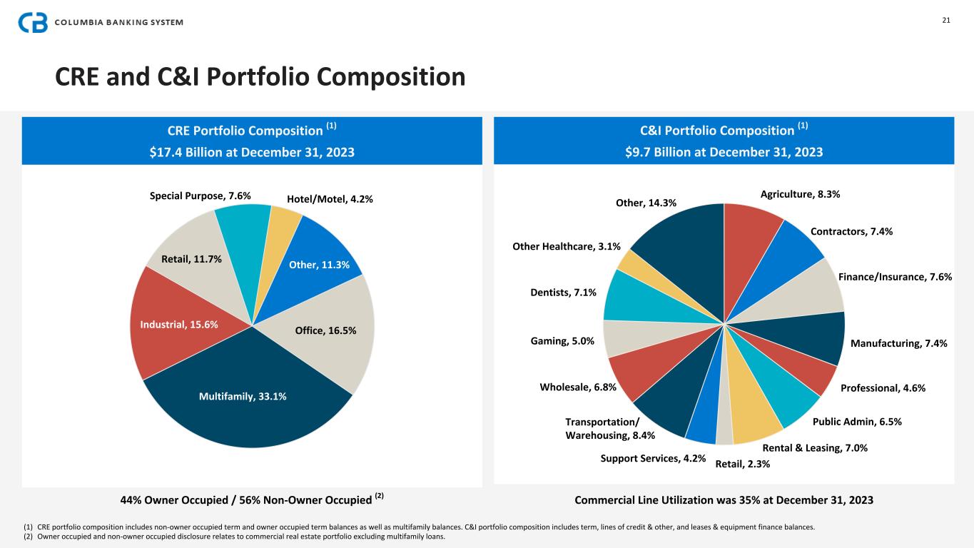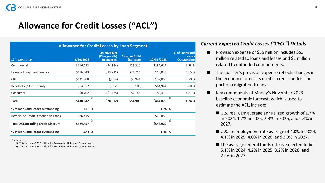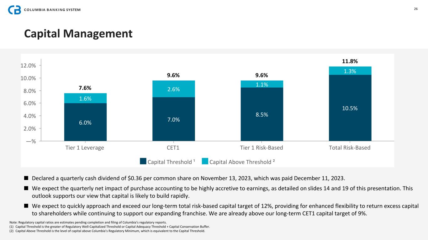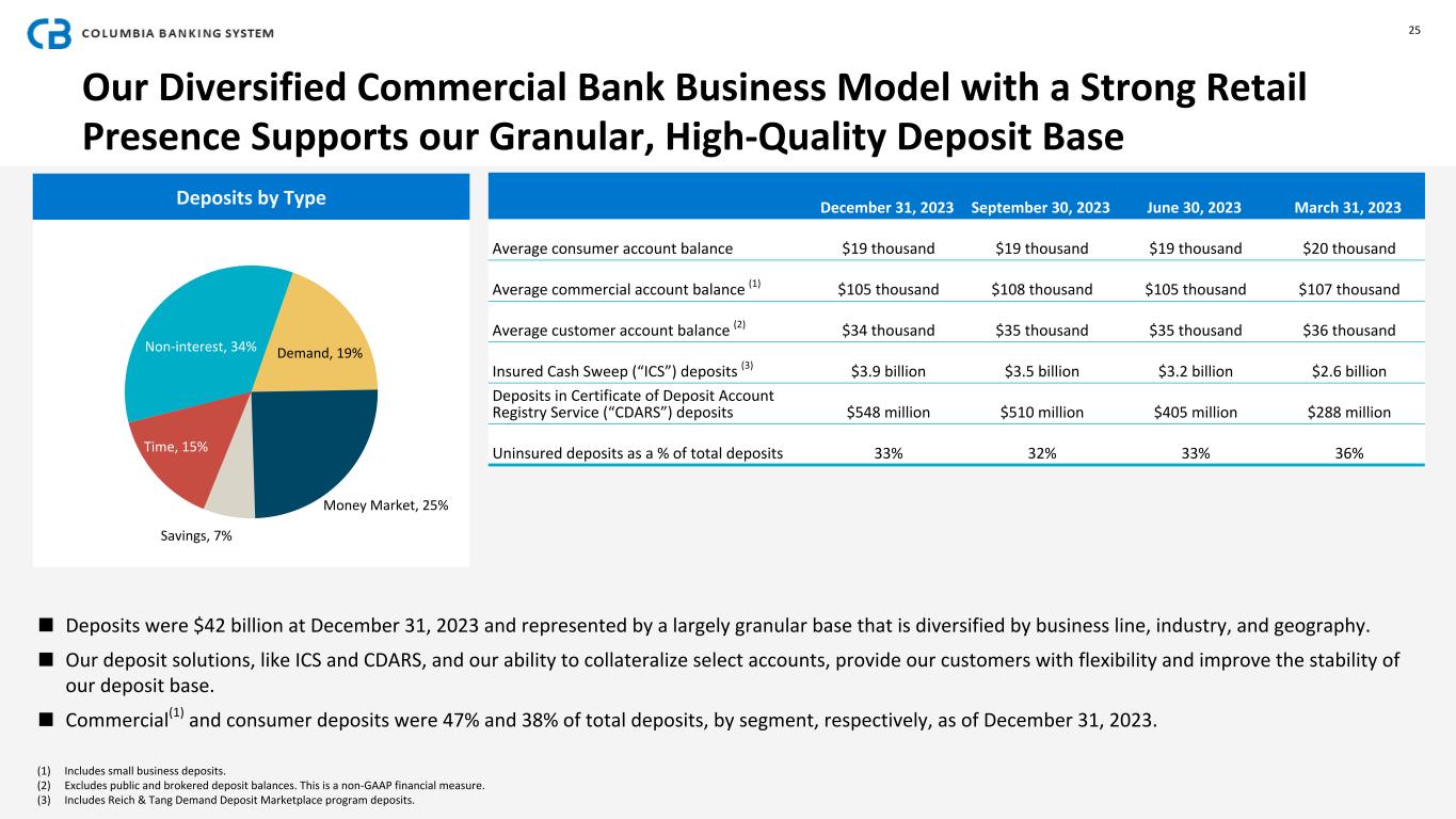 Credit Quality Pr ov is io n Ex pe ns e ($ in m ill io ns ) N on perform ing assets to total assets Provision Expense & Non-Performing Assets to Total Assets* $32.9 $17.1 $16.0 $36.7 $54.9 $88.4 0.18% 0.14% 0.15% 0.20% 0.22% Provision expense Initial Provision Non Performing Assets To Total Assets Q4 2022 Q1 2023 Q2 2023 Q3 2023 Q4 2023 $— $20.0 $40.0 $60.0 $80.0 $100.0 $120.0 —% 0.05% 0.10% 0.15% 0.20% 0.25% 0.30% 0.35% Cl as si fie d Lo an s / To ta l L oa ns Classified A ssets / RBC Classified Assets 0.73% 1.21% 1.13% 1.28% 1.41%7.8% 15.0% 13.4% 14.8% 16.1% Classified Loans to Total Loans Classified Assets to Risk-Based Capital Q4 2022 Q1 2023 Q2 2023 Q3 2023 Q4 2023 —% 0.30% 0.60% 0.90% 1.20% 1.50% 1.80% —% 3.0% 6.0% 9.0% 12.0% 15.0% 18.0% A xi s Ti tle Net Charge-offs to Average Loans and Leases (annualized) 0.01% —% 0.03% 0.01% 0.06% 2.84% 3.89% 5.96% 5.15% 5.39% 0.19% 0.23% 0.30% 0.25% 0.31% Umpqua Bank (ex FinPac) FinPac Columbia Banking System, Inc. Q4 2022 Q1 2023 Q2 2023 Q3 2023 Q4 2023 —% 1.00% 2.00% 3.00% 4.00% 5.00% 6.00% 24 ■ If the remaining credit discount on loans of $80 million at December 31, 2023 is added to the ACL of $464 million at December 31, 2023, the ACL would increase to 1.45% of loans from the reported 1.24% level. ■ The increase in classified asset ratios between December 31, 2022 and March 31, 2023 relates to the addition of the historical Columbia portfolio and related purchase accounting adjustments and their impact on risk-based capital. The metrics are not reflective of any notable change in classified assets. A CL ($ in m ill io ns ) A CL / Total Loans and Leases Allowance for Credit Losses $315 $436 $424 $438 $464 $107 $94 $86 $80 1.21% 1.18% 1.15% 1.24% ACL Credit Discount ACL to Total Loans and Leases ACL + Credit Discount to Total Loans and Leases Q4 2022 Q1 2023 Q2 2023 Q3 2023 Q4 2023 $100 $200 $300 $400 $500 $600 $700 —% 0.20% 0.40% 0.60% 0.80% 1.00% 1.20% 1.40%$105.5 Footnotes: *Q1 2023 provision expense of $105.5 million includes an initial provision of $88.4 million related to historical Columbia non-PCD loans. 1.41% 1.18% 1.45%1.40%1.46%