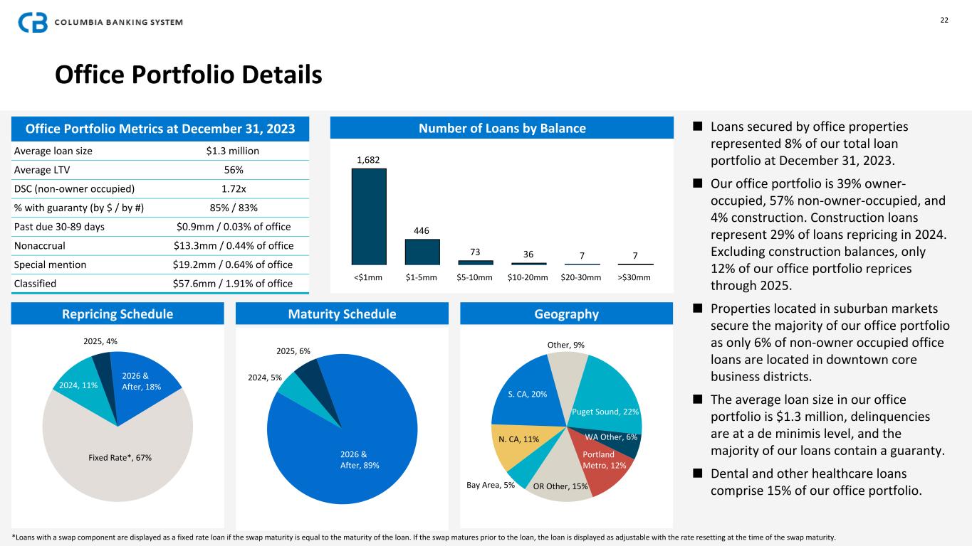 Office Portfolio Details Puget Sound, 22% WA Other, 6% Portland Metro, 12% OR Other, 15%Bay Area, 5% N. CA, 11% S. CA, 20% Other, 9% Office Portfolio Metrics at December 31, 2023 Average loan size $1.3 million Average LTV 56% DSC (non-owner occupied) 1.72x % with guaranty (by $ / by #) 85% / 83% Past due 30-89 days $0.9mm / 0.03% of office Nonaccrual $13.3mm / 0.44% of office Special mention $19.2mm / 0.64% of office Classified $57.6mm / 1.91% of office Number of Loans by Balance Geography 22 ■ Loans secured by office properties represented 8% of our total loan portfolio at December 31, 2023. ■ Our office portfolio is 39% owner- occupied, 57% non-owner-occupied, and 4% construction. Construction loans represent 29% of loans repricing in 2024. Excluding construction balances, only 12% of our office portfolio reprices through 2025. ■ Properties located in suburban markets secure the majority of our office portfolio as only 6% of non-owner occupied office loans are located in downtown core business districts. ■ The average loan size in our office portfolio is $1.3 million, delinquencies are at a de minimis level, and the majority of our loans contain a guaranty. ■ Dental and other healthcare loans comprise 15% of our office portfolio. 1,746 441 71 38 7 6 <$1mm $1-5mm $5-10mm $10-20mm $20-30mm >$30mm 2024, 11% 2025, 4% 2026 & After, 18% Fixed Rate*, 67% Repricing Schedule *Loans with a swap component are displayed as a fixed rate loan if the swap maturity is equal to the maturity of the loan. If the swap matures prior to the loan, the loan is displayed as adjustable with the rate resetting at the time of the swap maturity. 2024, 5% 2025, 6% 2026 & After, 89% Maturity Schedule , 19 8 9 6 7 1,682 6 3 6