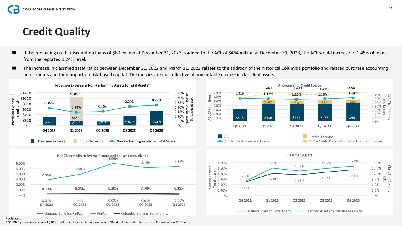 Non-GAAP Reconciliation For the Quarter Ended ($ in thousands) Q4 2023 Q3 2023 Q2 2023 Q1 2023 Q4 2022 Net interest income c $ 453,623 $ 480,875 $ 483,975 $ 374,698 $ 305,479 Non-interest income (GAAP) d $ 65,533 $ 43,981 $ 39,678 $ 54,735 $ 34,879 Less: Non-interest income adjustments a (12,732) 15,023 16,252 (8,074) 8,115 Operating non-interest income (non-GAAP) e $ 52,801 $ 59,004 $ 55,930 $ 46,661 $ 42,994 Revenue (GAAP) f $ 519,156 $ 524,856 $ 523,653 $ 429,433 $ 340,358 Operating revenue (non-GAAP) g $ 506,424 $ 539,879 $ 539,905 $ 421,359 $ 348,473 Non-interest expense (GAAP) h $ 337,176 $ 304,147 $ 328,559 $ 342,818 $ 194,982 Less: Non-interest expense adjustments b (9,965) (22,955) (31,768) (117,189) (13,603) Operating non-interest expense (non-GAAP) i $ 327,211 $ 281,192 $ 296,791 $ 225,629 $ 181,379 Net income (loss) (GAAP) j $ 93,531 $ 135,845 $ 133,377 $ (14,038) $ 82,964 Provision (benefit) for income taxes 33,540 48,127 45,703 (4,886) 29,464 Income (loss) before provision for income taxes 127,071 183,972 179,080 (18,924) 112,428 Provision for credit losses 54,909 36,737 16,014 105,539 32,948 Pre-provision net revenue (PPNR) (non-GAAP) k 181,980 220,709 195,094 86,615 145,376 Less: Non-interest income adjustments a (12,732) 15,023 16,252 (8,074) 8,115 Add: Non-interest expense adjustments b 9,965 22,955 31,768 117,189 13,603 Operating PPNR (non-GAAP) l $ 179,213 $ 258,687 $ 243,114 $ 195,730 $ 167,094 Net income (GAAP) j $ 93,531 $ 135,845 $ 133,377 $ (14,038) $ 82,964 Less: Non-interest income adjustments a (12,732) 15,023 16,252 (8,074) 8,115 Add: Non-interest expense adjustments b 9,965 22,955 31,768 117,189 13,603 Tax effect of adjustments 691 (9,482) (11,981) (23,565) (5,459) Operating net income (non-GAAP) m $ 91,455 $ 164,341 $ 169,416 $ 71,512 $ 99,223 For the Quarter Ended ($ in thousands) Q4 2023 Q3 2023 Q2 2023 Q1 2023 Q4 2022 Non-Interest Income Adjustments Gain on sale of debt securities, net $ 9 $ 4 $ — $ — $ — Loss (gain) on equity securities, net 2,636 (2,055) (697) 2,416 284 Loss (gain) on swap derivatives (8,042) 5,700 1,288 (3,543) (2,329) Change in fair value of certain loans held for investment 19,354 (19,247) (6,965) 9,488 4,192 Change in fair value of MSR due to valuation inputs or assumptions (6,251) 5,308 (2,242) (2,937) (9,914) MSR hedge gain (loss) 5,026 (4,733) (7,636) 2,650 (348) Total non-interest income adjustments a $ 12,732 $ (15,023) $ (16,252) $ 8,074 $ (8,115) Non-Interest Expense Adjustments Merger-related expense $ 7,174 $ 18,938 $ 29,649 $ 115,898 $ 11,637 Exit and disposal costs 2,791 4,017 2,119 1,291 1,966 Total non-interest expense adjustments b $ 9,965 $ 22,955 $ 31,768 $ 117,189 $ 13,603 34
