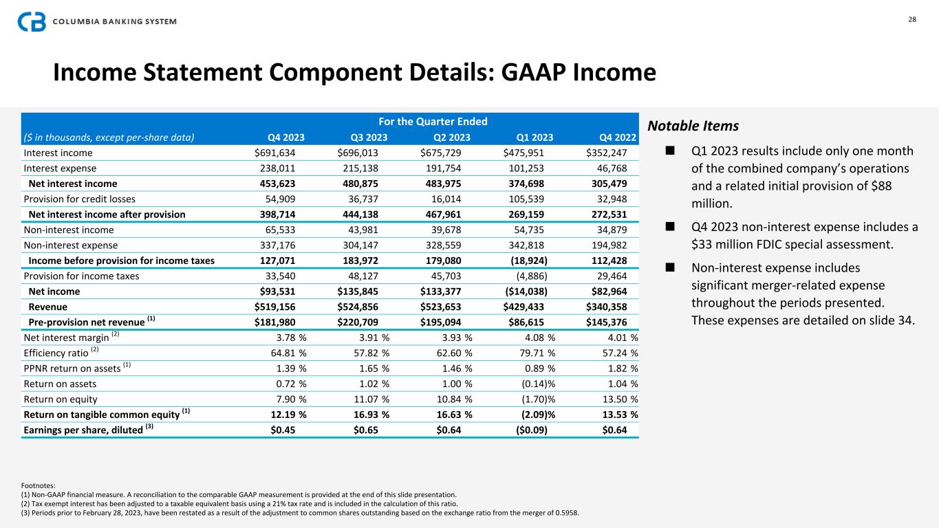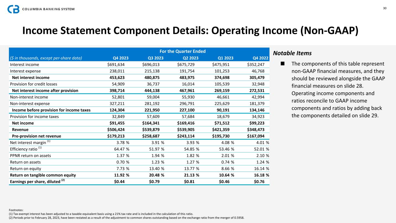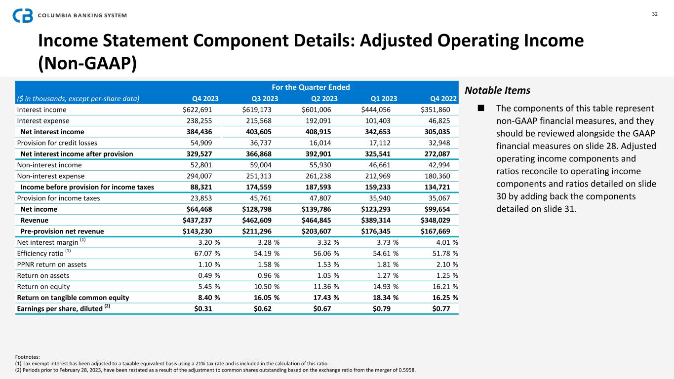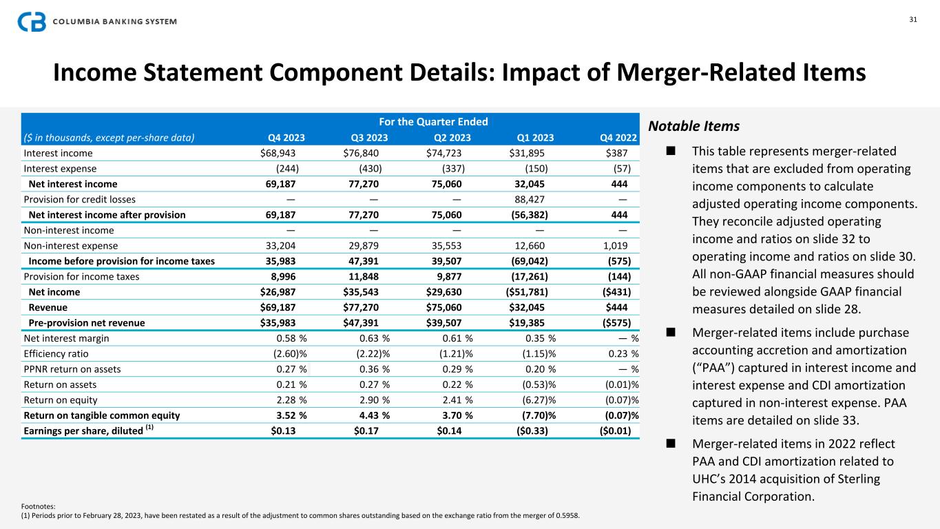 Income Statement Component Details: Operating Income (Non-GAAP) For the Quarter Ended ($ in thousands, except per-share data) Q4 2023 Q3 2023 Q2 2023 Q1 2023 Q4 2022 Interest income $691,634 $696,013 $675,729 $475,951 $352,247 Interest expense 238,011 215,138 191,754 101,253 46,768 Net interest income 453,623 480,875 483,975 374,698 305,479 Provision for credit losses 54,909 36,737 16,014 105,539 32,948 Net interest income after provision 398,714 444,138 467,961 269,159 272,531 Non-interest income 52,801 59,004 55,930 46,661 42,994 Non-interest expense 327,211 281,192 296,791 225,629 181,379 Income before provision for income taxes 124,304 221,950 227,100 90,191 134,146 Provision for income taxes 32,849 57,609 57,684 18,679 34,923 Net income $91,455 $164,341 $169,416 $71,512 $99,223 Revenue $506,424 $539,879 $539,905 $421,359 $348,473 Pre-provision net revenue $179,213 $258,687 $243,114 $195,730 $167,094 Net interest margin (1) 3.78 % 3.91 % 3.93 % 4.08 % 4.01 % Efficiency ratio (1) 64.47 % 51.97 % 54.85 % 53.46 % 52.01 % PPNR return on assets 1.37 % 1.94 % 1.82 % 2.01 % 2.10 % Return on assets 0.70 % 1.23 % 1.27 % 0.74 % 1.24 % Return on equity 7.73 % 13.40 % 13.77 % 8.66 % 16.14 % Return on tangible common equity 11.92 % 20.48 % 21.13 % 10.64 % 16.18 % Earnings per share, diluted (2) $0.44 $0.79 $0.81 $0.46 $0.76 30 Footnotes: (1) Tax exempt interest has been adjusted to a taxable equivalent basis using a 21% tax rate and is included in the calculation of this ratio. (2) Periods prior to February 28, 2023, have been restated as a result of the adjustment to common shares outstanding based on the exchange ratio from the merger of 0.5958. Notable Items ■ The components of this table represent non-GAAP financial measures, and they should be reviewed alongside the GAAP financial measures on slide 28. Operating income components and ratios reconcile to GAAP income components and ratios by adding back the components detailed on slide 29.