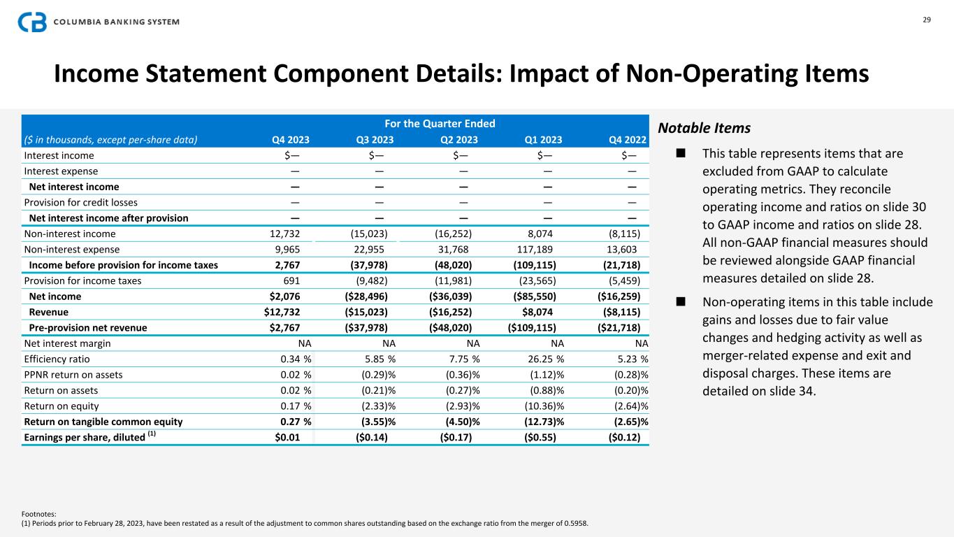 Income Statement Component Details: Impact of Non-Operating Items For the Quarter Ended ($ in thousands, except per-share data) Q4 2023 Q3 2023 Q2 2023 Q1 2023 Q4 2022 Interest income $— $— $— $— $— Interest expense — — — — — Net interest income — — — — — Provision for credit losses — — — — — Net interest income after provision — — — — — Non-interest income 12,732 (15,023) (16,252) 8,074 (8,115) Non-interest expense 9,965 22,955 31,768 117,189 13,603 Income before provision for income taxes 2,767 (37,978) (48,020) (109,115) (21,718) Provision for income taxes 691 (9,482) (11,981) (23,565) (5,459) Net income $2,076 ($28,496) ($36,039) ($85,550) ($16,259) Revenue $12,732 ($15,023) ($16,252) $8,074 ($8,115) Pre-provision net revenue $2,767 ($37,978) ($48,020) ($109,115) ($21,718) Net interest margin NA NA NA NA NA Efficiency ratio 0.34 % 5.85 % 7.75 % 26.25 % 5.23 % PPNR return on assets 0.02 % (0.29) % (0.36) % (1.12) % (0.28) % Return on assets 0.02 % (0.21) % (0.27) % (0.88) % (0.20) % Return on equity 0.17 % (2.33) % (2.93) % (10.36) % (2.64) % Return on tangible common equity 0.27 % (3.55) % (4.50) % (12.73) % (2.65) % Earnings per share, diluted (1) $0.01 ($0.14) ($0.17) ($0.55) ($0.12) 29 Notable Items ■ This table represents items that are excluded from GAAP to calculate operating metrics. They reconcile operating income and ratios on slide 30 to GAAP income and ratios on slide 28. All non-GAAP financial measures should be reviewed alongside GAAP financial measures detailed on slide 28. ■ Non-operating items in this table include gains and losses due to fair value changes and hedging activity as well as merger-related expense and exit and disposal charges. These items are detailed on slide 34. Footnotes: (1) Periods prior to February 28, 2023, have been restated as a result of the adjustment to common shares outstanding based on the exchange ratio from the merger of 0.5958.