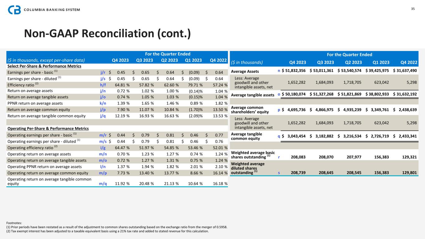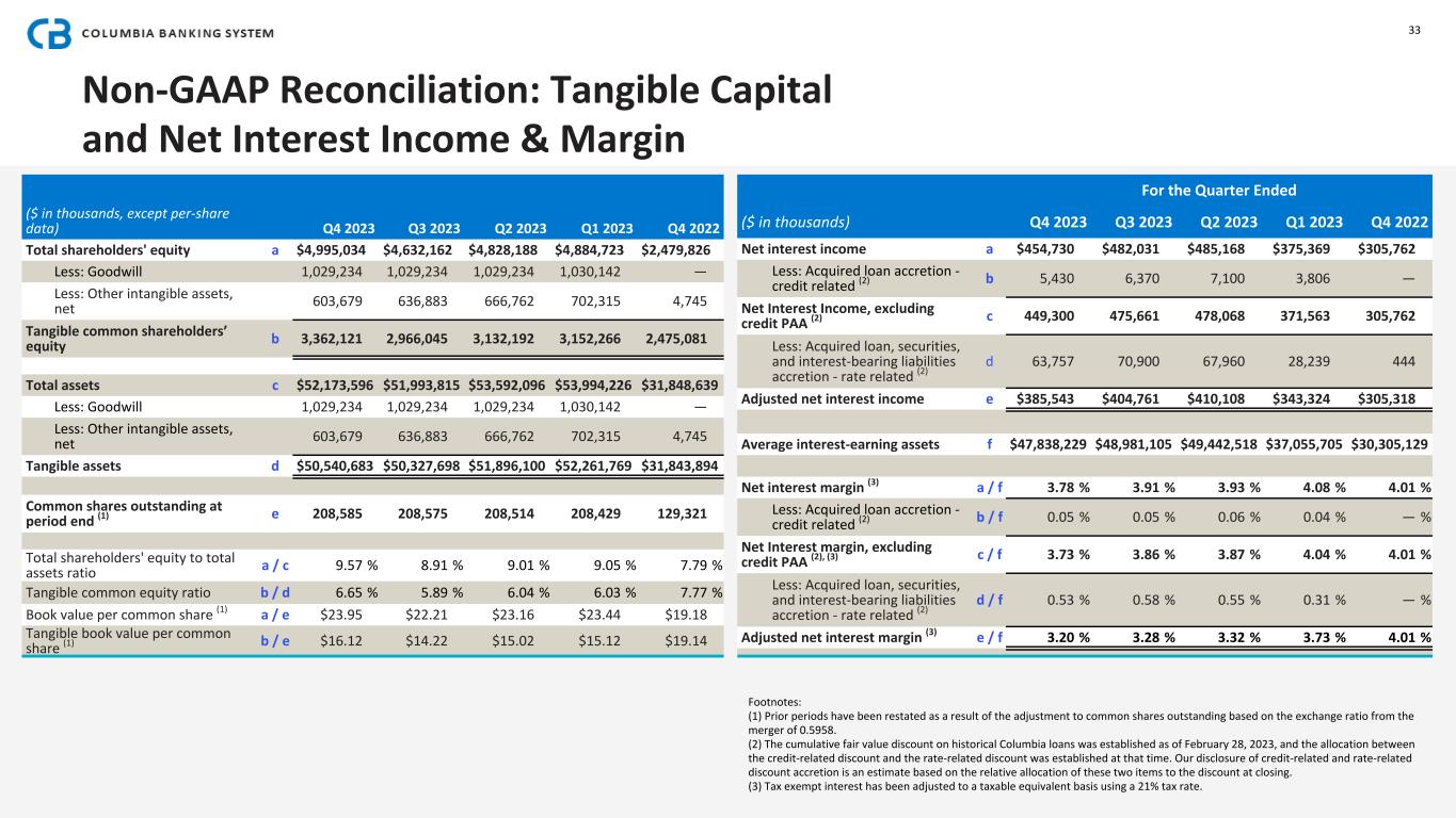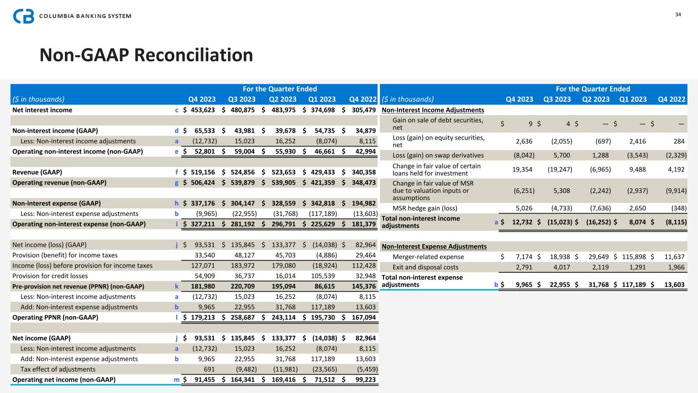 Non-GAAP Reconciliation: Tangible Capital and Net Interest Income & Margin ($ in thousands, except per-share data) Q4 2023 Q3 2023 Q2 2023 Q1 2023 Q4 2022 Total shareholders' equity a $4,995,034 $4,632,162 $4,828,188 $4,884,723 $2,479,826 Less: Goodwill 1,029,234 1,029,234 1,029,234 1,030,142 — Less: Other intangible assets, net 603,679 636,883 666,762 702,315 4,745 Tangible common shareholders’ equity b 3,362,121 2,966,045 3,132,192 3,152,266 2,475,081 Total assets c $52,173,596 $51,993,815 $53,592,096 $53,994,226 $31,848,639 Less: Goodwill 1,029,234 1,029,234 1,029,234 1,030,142 — Less: Other intangible assets, net 603,679 636,883 666,762 702,315 4,745 Tangible assets d $50,540,683 $50,327,698 $51,896,100 $52,261,769 $31,843,894 Common shares outstanding at period end (1) e 208,585 208,575 208,514 208,429 129,321 Total shareholders' equity to total assets ratio a / c 9.57 % 8.91 % 9.01 % 9.05 % 7.79 % Tangible common equity ratio b / d 6.65 % 5.89 % 6.04 % 6.03 % 7.77 % Book value per common share (1) a / e $23.95 $22.21 $23.16 $23.44 $19.18 Tangible book value per common share (1) b / e $16.12 $14.22 $15.02 $15.12 $19.14 Footnotes: (1) Prior periods have been restated as a result of the adjustment to common shares outstanding based on the exchange ratio from the merger of 0.5958. (2) The cumulative fair value discount on historical Columbia loans was established as of February 28, 2023, and the allocation between the credit-related discount and the rate-related discount was established at that time. Our disclosure of credit-related and rate-related discount accretion is an estimate based on the relative allocation of these two items to the discount at closing. (3) Tax exempt interest has been adjusted to a taxable equivalent basis using a 21% tax rate. 33 For the Quarter Ended ($ in thousands) Q4 2023 Q3 2023 Q2 2023 Q1 2023 Q4 2022 Net interest income a $454,730 $482,031 $485,168 $375,369 $305,762 Less: Acquired loan accretion - credit related (2) b 5,430 6,370 7,100 3,806 — Net Interest Income, excluding credit PAA (2) c 449,300 475,661 478,068 371,563 305,762 Less: Acquired loan, securities, and interest-bearing liabilities accretion - rate related (2) d 63,757 70,900 67,960 28,239 444 Adjusted net interest income e $385,543 $404,761 $410,108 $343,324 $305,318 Average interest-earning assets f $47,838,229 $48,981,105 $49,442,518 $37,055,705 $30,305,129 Net interest margin (3) a / f 3.78 % 3.91 % 3.93 % 4.08 % 4.01 % Less: Acquired loan accretion - credit related (2) b / f 0.05 % 0.05 % 0.06 % 0.04 % — % Net Interest margin, excluding credit PAA (2), (3) c / f 3.73 % 3.86 % 3.87 % 4.04 % 4.01 % Less: Acquired loan, securities, and interest-bearing liabilities accretion - rate related (2) d / f 0.53 % 0.58 % 0.55 % 0.31 % — % Adjusted net interest margin (3) e / f 3.20 % 3.28 % 3.32 % 3.73 % 4.01 %