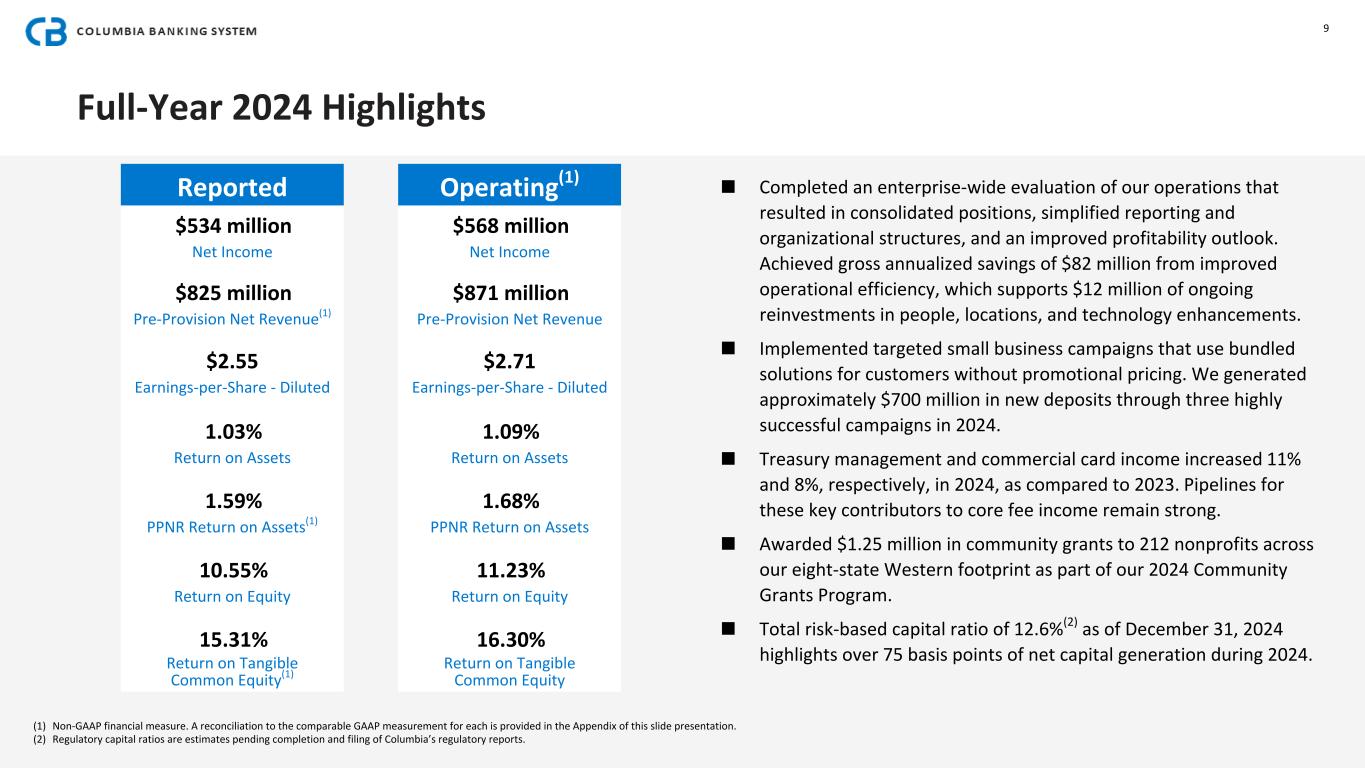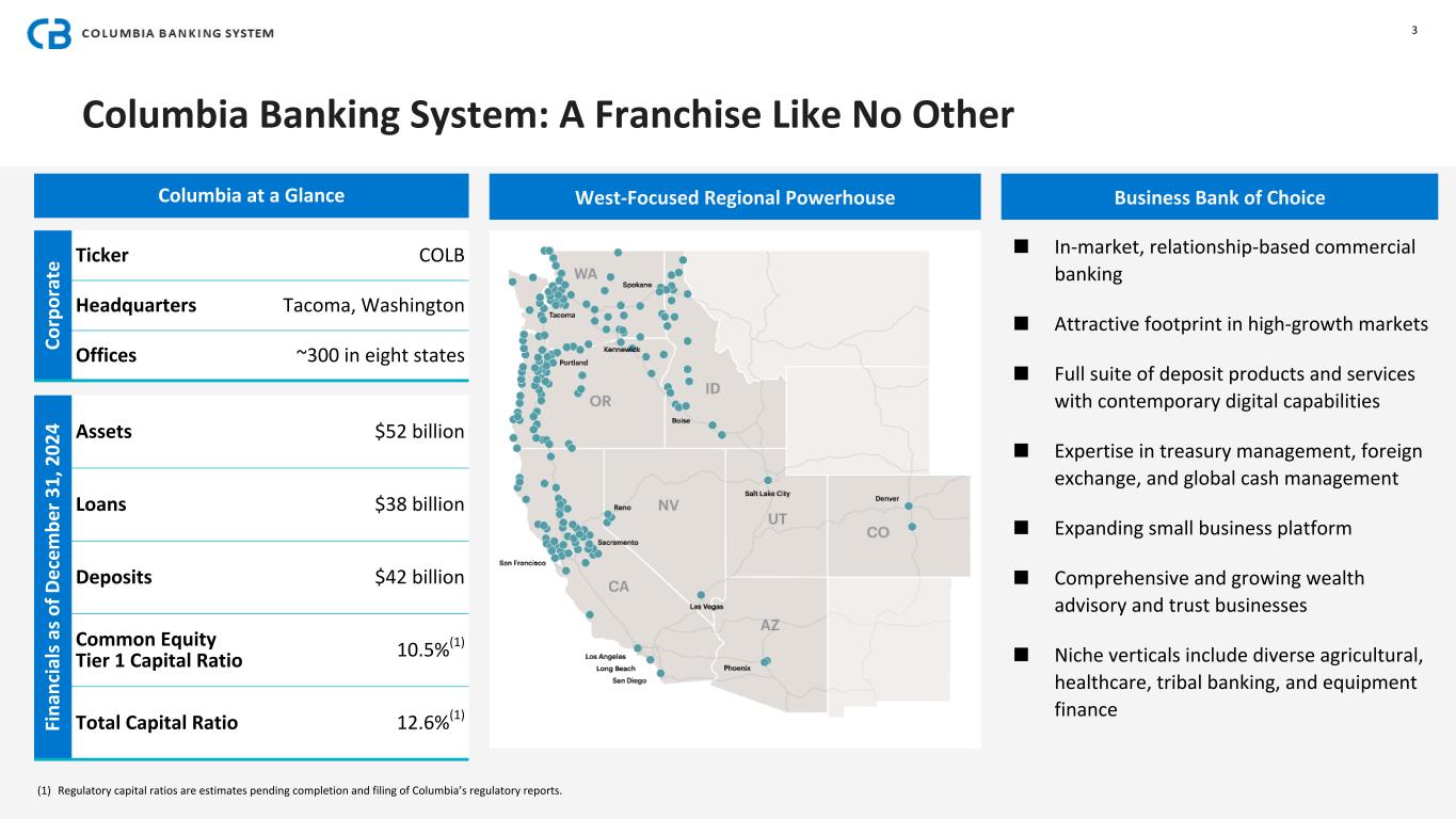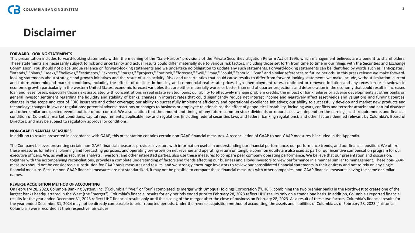 Disclaimer FORWARD-LOOKING STATEMENTS This presentation includes forward-looking statements within the meaning of the "Safe-Harbor" provisions of the Private Securities Litigation Reform Act of 1995, which management believes are a benefit to shareholders. These statements are necessarily subject to risk and uncertainty and actual results could differ materially due to various risk factors, including those set forth from time to time in our filings with the Securities and Exchange Commission. You should not place undue reliance on forward-looking statements and we undertake no obligation to update any such statements. Forward-looking statements can be identified by words such as "anticipates," "intends," "plans," "seeks," "believes," "estimates," "expects," "target," "projects," "outlook," "forecast," "will," "may," "could," "should," "can" and similar references to future periods. In this press release we make forward- looking statements about strategic and growth initiatives and the result of such activity. Risks and uncertainties that could cause results to differ from forward-looking statements we make include, without limitation: current and future economic and market conditions, including the effects of declines in housing and commercial real estate prices, high unemployment rates, continued or renewed inflation and any recession or slowdown in economic growth particularly in the western United States; economic forecast variables that are either materially worse or better than end of quarter projections and deterioration in the economy that could result in increased loan and lease losses, especially those risks associated with concentrations in real estate related loans; our ability to effectively manage problem credits; the impact of bank failures or adverse developments at other banks on general investor sentiment regarding the liquidity and stability of banks; changes in interest rates that could significantly reduce net interest income and negatively affect asset yields and valuations and funding sources; changes in the scope and cost of FDIC insurance and other coverage; our ability to successfully implement efficiency and operational excellence initiatives; our ability to successfully develop and market new products and technology; changes in laws or regulations; potential adverse reactions or changes to business or employee relationships; the effect of geopolitical instability, including wars, conflicts and terrorist attacks; and natural disasters and other similar unexpected events outside of our control. We also caution that the amount and timing of any future common stock dividends or repurchases will depend on the earnings, cash requirements and financial condition of Columbia, market conditions, capital requirements, applicable law and regulations (including federal securities laws and federal banking regulations), and other factors deemed relevant by Columbia's Board of Directors, and may be subject to regulatory approval or conditions. NON-GAAP FINANCIAL MEASURES In addition to results presented in accordance with GAAP, this presentation contains certain non-GAAP financial measures. A reconciliation of GAAP to non-GAAP measures is included in the Appendix. The Company believes presenting certain non-GAAP financial measures provides investors with information useful in understanding our financial performance, our performance trends, and our financial position. We utilize these measures for internal planning and forecasting purposes, and operating pre-provision net revenue and operating return on tangible common equity are also used as part of our incentive compensation program for our executive officers. We, as well as securities analysts, investors, and other interested parties, also use these measures to compare peer company operating performance. We believe that our presentation and discussion, together with the accompanying reconciliations, provides a complete understanding of factors and trends affecting our business and allows investors to view performance in a manner similar to management. These non-GAAP measures should not be considered a substitution for GAAP basis measures and results, and we strongly encourage investors to review our consolidated financial statements in their entirety and not to rely on any single financial measure. Because non-GAAP financial measures are not standardized, it may not be possible to compare these financial measures with other companies’ non-GAAP financial measures having the same or similar names. REVERSE ACQUISITION METHOD OF ACCOUNTING On February 28, 2023, Columbia Banking System, Inc. (“Columbia,” “we,” or “our”) completed its merger with Umpqua Holdings Corporation ("UHC"), combining the two premier banks in the Northwest to create one of the largest banks headquartered in the West (the "merger"). Columbia's financial results for any periods ended prior to February 28, 2023 reflect UHC results only on a standalone basis. In addition, Columbia's reported financial results for the year ended December 31, 2023 reflect UHC financial results only until the closing of the merger after the close of business on February 28, 2023. As a result of these two factors, Columbia's financial results for the year ended December 31, 2024 may not be directly comparable to prior reported periods. Under the reverse acquisition method of accounting, the assets and liabilities of Columbia as of February 28, 2023 ("historical Columbia") were recorded at their respective fair values. 2