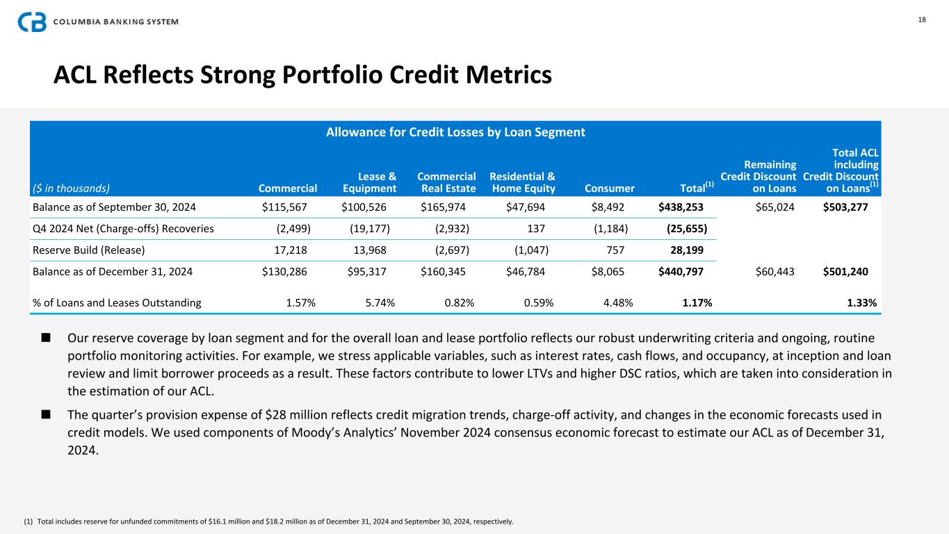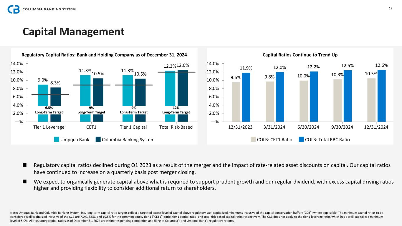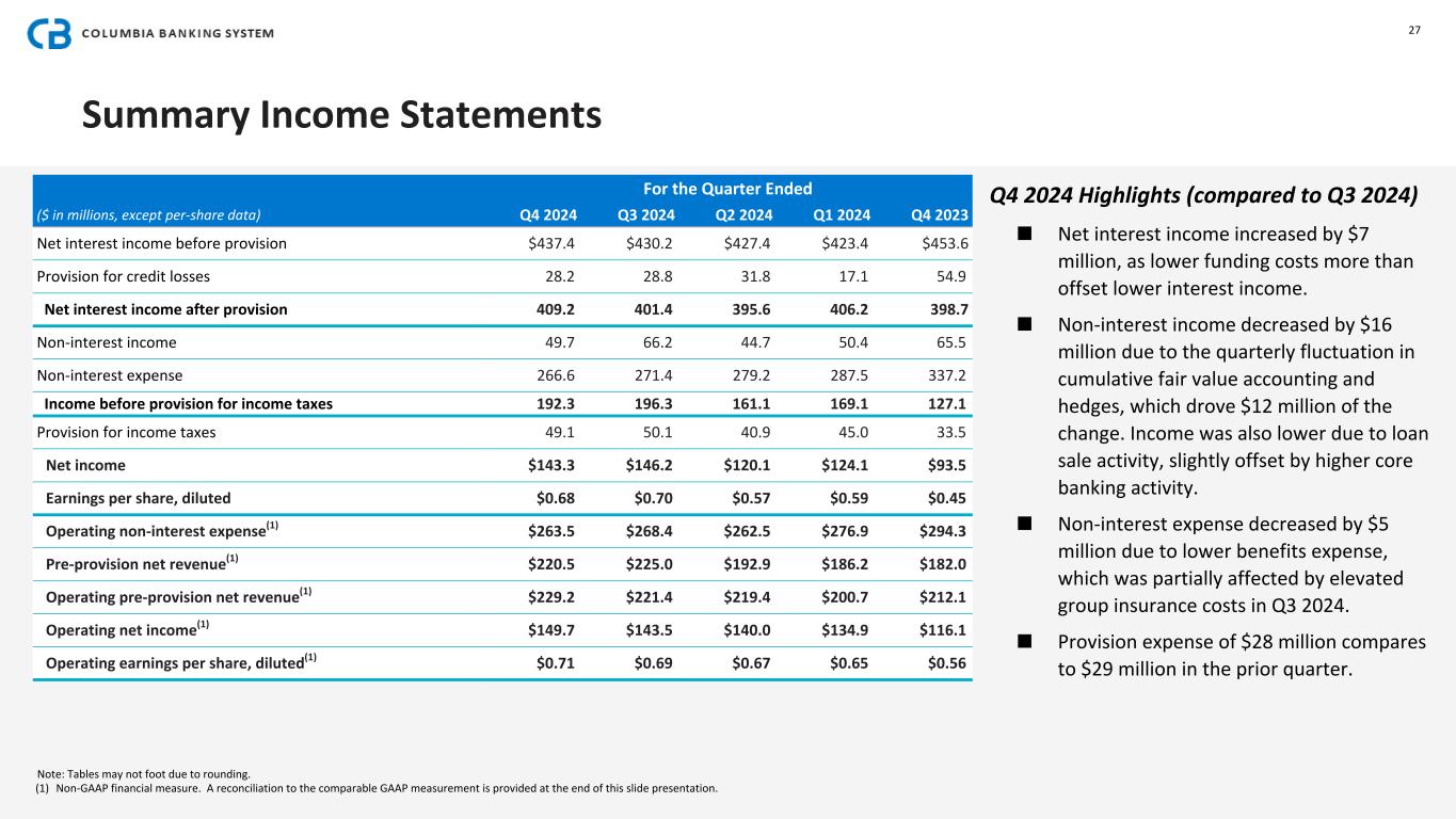 Disclaimer FORWARD-LOOKING STATEMENTS This presentation includes forward-looking statements within the meaning of the "Safe-Harbor" provisions of the Private Securities Litigation Reform Act of 1995, which management believes are a benefit to shareholders. These statements are necessarily subject to risk and uncertainty and actual results could differ materially due to various risk factors, including those set forth from time to time in our filings with the Securities and Exchange Commission. You should not place undue reliance on forward-looking statements and we undertake no obligation to update any such statements. Forward-looking statements can be identified by words such as "anticipates," "intends," "plans," "seeks," "believes," "estimates," "expects," "target," "projects," "outlook," "forecast," "will," "may," "could," "should," "can" and similar references to future periods. In this press release we make forward- looking statements about strategic and growth initiatives and the result of such activity. Risks and uncertainties that could cause results to differ from forward-looking statements we make include, without limitation: current and future economic and market conditions, including the effects of declines in housing and commercial real estate prices, high unemployment rates, continued or renewed inflation and any recession or slowdown in economic growth particularly in the western United States; economic forecast variables that are either materially worse or better than end of quarter projections and deterioration in the economy that could result in increased loan and lease losses, especially those risks associated with concentrations in real estate related loans; our ability to effectively manage problem credits; the impact of bank failures or adverse developments at other banks on general investor sentiment regarding the liquidity and stability of banks; changes in interest rates that could significantly reduce net interest income and negatively affect asset yields and valuations and funding sources; changes in the scope and cost of FDIC insurance and other coverage; our ability to successfully implement efficiency and operational excellence initiatives; our ability to successfully develop and market new products and technology; changes in laws or regulations; potential adverse reactions or changes to business or employee relationships; the effect of geopolitical instability, including wars, conflicts and terrorist attacks; and natural disasters and other similar unexpected events outside of our control. We also caution that the amount and timing of any future common stock dividends or repurchases will depend on the earnings, cash requirements and financial condition of Columbia, market conditions, capital requirements, applicable law and regulations (including federal securities laws and federal banking regulations), and other factors deemed relevant by Columbia's Board of Directors, and may be subject to regulatory approval or conditions. NON-GAAP FINANCIAL MEASURES In addition to results presented in accordance with GAAP, this presentation contains certain non-GAAP financial measures. A reconciliation of GAAP to non-GAAP measures is included in the Appendix. The Company believes presenting certain non-GAAP financial measures provides investors with information useful in understanding our financial performance, our performance trends, and our financial position. We utilize these measures for internal planning and forecasting purposes, and operating pre-provision net revenue and operating return on tangible common equity are also used as part of our incentive compensation program for our executive officers. We, as well as securities analysts, investors, and other interested parties, also use these measures to compare peer company operating performance. We believe that our presentation and discussion, together with the accompanying reconciliations, provides a complete understanding of factors and trends affecting our business and allows investors to view performance in a manner similar to management. These non-GAAP measures should not be considered a substitution for GAAP basis measures and results, and we strongly encourage investors to review our consolidated financial statements in their entirety and not to rely on any single financial measure. Because non-GAAP financial measures are not standardized, it may not be possible to compare these financial measures with other companies’ non-GAAP financial measures having the same or similar names. REVERSE ACQUISITION METHOD OF ACCOUNTING On February 28, 2023, Columbia Banking System, Inc. (“Columbia,” “we,” or “our”) completed its merger with Umpqua Holdings Corporation ("UHC"), combining the two premier banks in the Northwest to create one of the largest banks headquartered in the West (the "merger"). Columbia's financial results for any periods ended prior to February 28, 2023 reflect UHC results only on a standalone basis. In addition, Columbia's reported financial results for the year ended December 31, 2023 reflect UHC financial results only until the closing of the merger after the close of business on February 28, 2023. As a result of these two factors, Columbia's financial results for the year ended December 31, 2024 may not be directly comparable to prior reported periods. Under the reverse acquisition method of accounting, the assets and liabilities of Columbia as of February 28, 2023 ("historical Columbia") were recorded at their respective fair values. 2