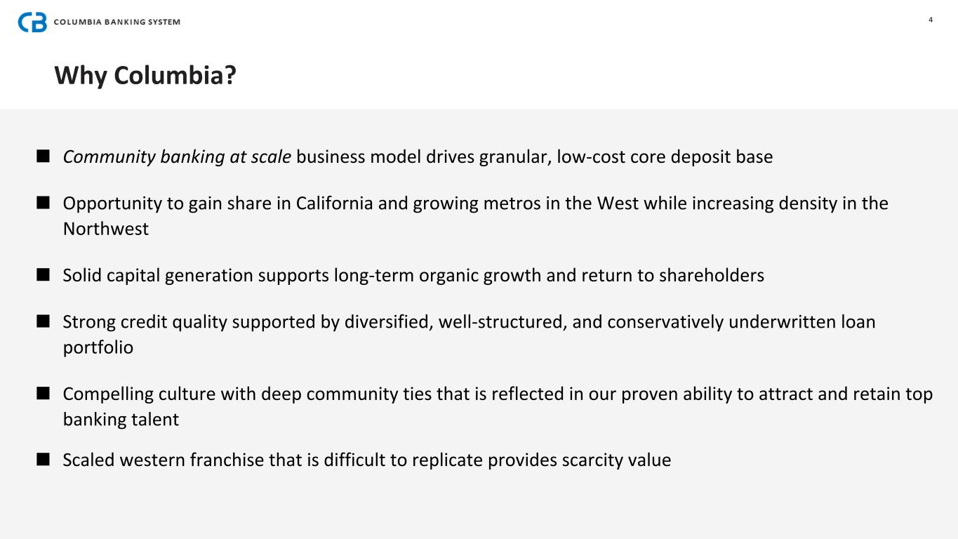 Columbia Banking System: A Franchise Like No Other 3 West-Focused Regional Powerhouse Business Bank of Choice ■ In-market, relationship-based commercial banking ■ Attractive footprint in high-growth markets ■ Full suite of deposit products and services with contemporary digital capabilities ■ Expertise in treasury management, foreign exchange, and global cash management ■ Expanding small business platform ■ Comprehensive and growing wealth advisory and trust businesses ■ Niche verticals include diverse agricultural, healthcare, tribal banking, and equipment finance Columbia at a Glance Co rp or at e Ticker COLB Headquarters Tacoma, Washington Offices ~300 in eight states Fi na nc ia ls a s of D ec em be r 31 , 2 02 4 Assets $52 billion Loans $38 billion Deposits $42 billion Common Equity Tier 1 Capital Ratio 10.5%(1) Total Capital Ratio 12.6%(1) (1) Regulatory capital ratios are estimates pending completion and filing of Columbia’s regulatory reports.