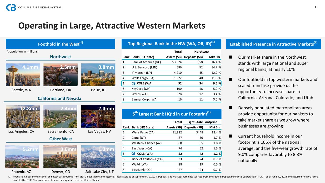Why Columbia? 4 ■ Community banking at scale business model drives granular, low-cost core deposit base ■ Opportunity to gain share in California and growing metros in the West while increasing density in the Northwest ■ Solid capital generation supports long-term organic growth and return to shareholders ■ Strong credit quality supported by diversified, well-structured, and conservatively underwritten loan portfolio ■ Compelling culture with deep community ties that is reflected in our proven ability to attract and retain top banking talent ■ Scaled western franchise that is difficult to replicate provides scarcity value