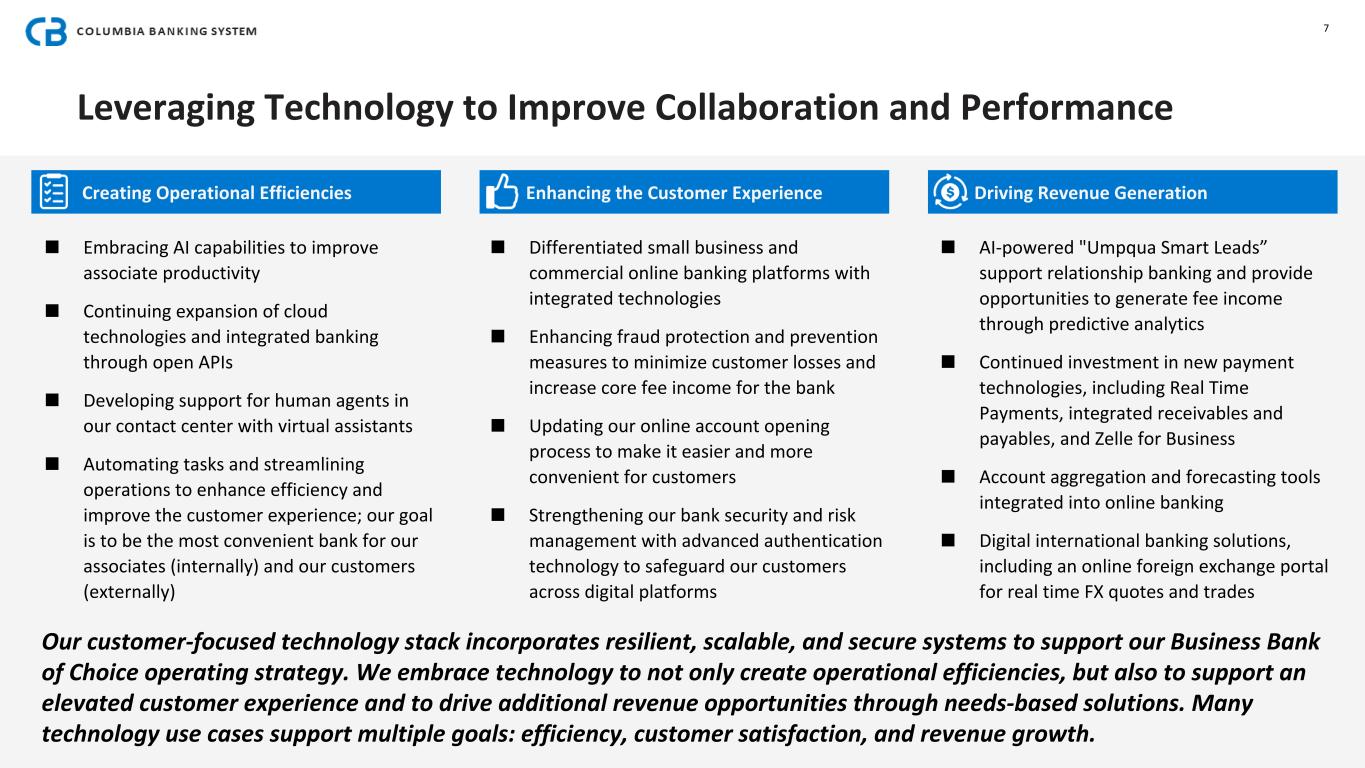 Population Deposits ($mm) COLB MSA(1) (000s) Market COLB Mkt Shr Seattle 4,098 $140,176 $7,154 5.1 % Portland 2,504 65,049 5,328 8.2 % Boise 849 16,828 220 1.3 % Spokane 600 13,872 3,860 27.8 % Opportunity to Increase Density and Gain Share throughout Our Footprint 6 Expand Footprint in California Broaden Presence in Other Western MarketsImprove Density in the Northwest Population Deposits ($mm) COLB MSA(1) (000s) Market COLB Mkt Shr Phoenix 5,169 $171,020 Adding targeted retail locations to support existing commercial banking presence Denver 3,034 110,993 Salt Lake City 1,274 76,171 Las Vegas 2,369 75,408 Population Deposits ($mm) COLB MSA(1) (000s) Market COLB Mkt Shr Los Angeles 12,773 $655,591 $1,045 0.2 % Sacramento 2,414 92,125 1,879 2.0 % San Francisco 4,573 428,928 518 0.1 % San Diego 3,280 106,844 34 < 0.1% (1) Population data sourced from S&P Global Market Intelligence. Deposits and market share data sourced from the FDIC as of June 30, 2024 and adjusted to a pro forma basis by the FDIC.