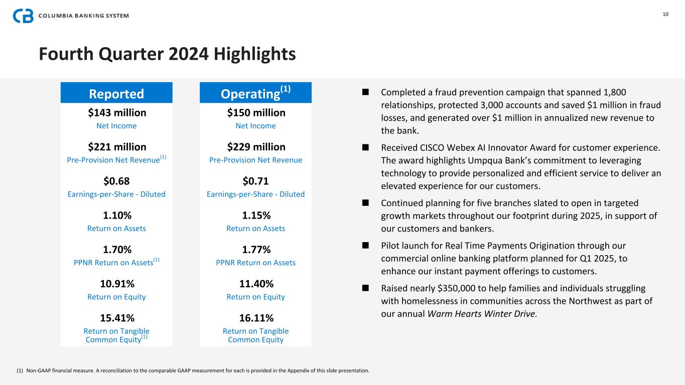 Full-Year 2024 Highlights 9 ■ Completed an enterprise-wide evaluation of our operations that resulted in consolidated positions, simplified reporting and organizational structures, and an improved profitability outlook. Achieved gross annualized savings of $82 million from improved operational efficiency, which supports $12 million of ongoing reinvestments in people, locations, and technology enhancements. ■ Implemented targeted small business campaigns that use bundled solutions for customers without promotional pricing. We generated approximately $700 million in new deposits through three highly successful campaigns in 2024. ■ Treasury management and commercial card income increased 11% and 8%, respectively, in 2024, as compared to 2023. Pipelines for these key contributors to core fee income remain strong. ■ Awarded $1.25 million in community grants to 212 nonprofits across our eight-state Western footprint as part of our 2024 Community Grants Program. ■ Total risk-based capital ratio of 12.6%(2) as of December 31, 2024 highlights over 75 basis points of net capital generation during 2024. Reported Operating(1) $534 million $568 million Net Income Net Income $825 million $871 million Pre-Provision Net Revenue(1) Pre-Provision Net Revenue $2.55 $2.71 Earnings-per-Share - Diluted Earnings-per-Share - Diluted 1.03% 1.09% Return on Assets Return on Assets 1.59% 1.68% PPNR Return on Assets(1) PPNR Return on Assets 10.55% 11.23% Return on Equity Return on Equity 15.31% 16.30% Return on Tangible Common Equity(1) Return on Tangible Common Equity (1) Non-GAAP financial measure. A reconciliation to the comparable GAAP measurement for each is provided in the Appendix of this slide presentation. (2) Regulatory capital ratios are estimates pending completion and filing of Columbia’s regulatory reports.