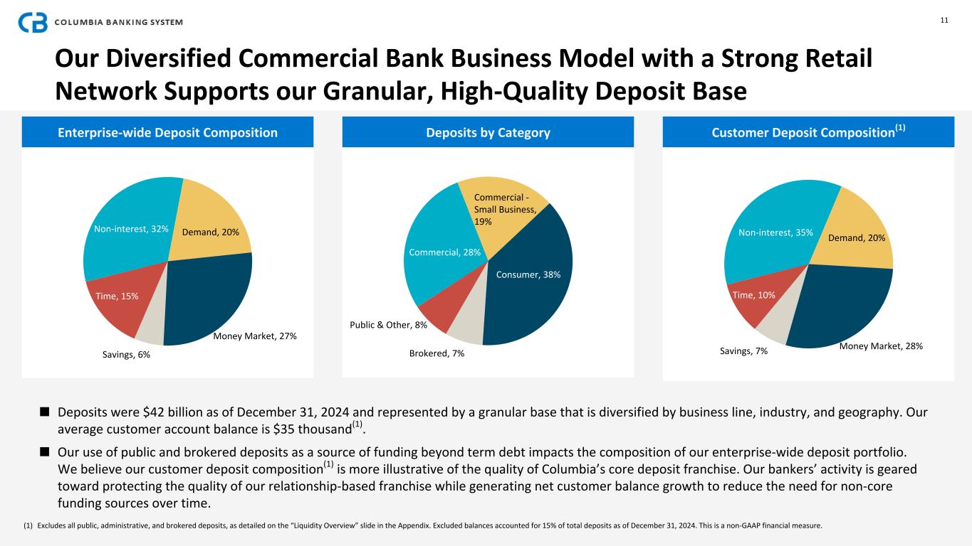 Fourth Quarter 2024 Highlights 10 ■ Completed a fraud prevention campaign that spanned 1,800 relationships, protected 3,000 accounts and saved $1 million in fraud losses, and generated over $1 million in annualized new revenue to the bank. ■ Received CISCO Webex AI Innovator Award for customer experience. The award highlights Umpqua Bank’s commitment to leveraging technology to provide personalized and efficient service to deliver an elevated experience for our customers. ■ Continued planning for five branches slated to open in targeted growth markets throughout our footprint during 2025, in support of our customers and bankers. ■ Pilot launch for Real Time Payments Origination through our commercial online banking platform planned for Q1 2025, to enhance our instant payment offerings to customers. ■ Raised nearly $350,000 to help families and individuals struggling with homelessness in communities across the Northwest as part of our annual Warm Hearts Winter Drive. Reported Operating(1) $143 million $150 million Net Income Net Income $221 million $229 million Pre-Provision Net Revenue(1) Pre-Provision Net Revenue $0.68 $0.71 Earnings-per-Share - Diluted Earnings-per-Share - Diluted 1.10% 1.15% Return on Assets Return on Assets 1.70% 1.77% PPNR Return on Assets(1) PPNR Return on Assets 10.91% 11.40% Return on Equity Return on Equity 15.41% 16.11% Return on Tangible Common Equity(1) Return on Tangible Common Equity (1) Non-GAAP financial measure. A reconciliation to the comparable GAAP measurement for each is provided in the Appendix of this slide presentation.