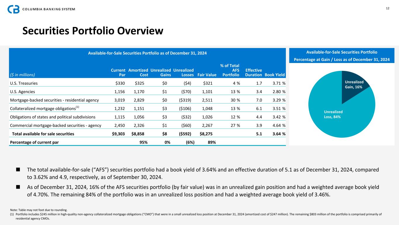 Our Diversified Commercial Bank Business Model with a Strong Retail Network Supports our Granular, High-Quality Deposit Base Non-interest, 32% Demand, 20% Money Market, 27% Savings, 6% Time, 15% Enterprise-wide Deposit Composition 11 ■ Deposits were $42 billion as of December 31, 2024 and represented by a granular base that is diversified by business line, industry, and geography. Our average customer account balance is $35 thousand(1). ■ Our use of public and brokered deposits as a source of funding beyond term debt impacts the composition of our enterprise-wide deposit portfolio. We believe our customer deposit composition(1) is more illustrative of the quality of Columbia’s core deposit franchise. Our bankers’ activity is geared toward protecting the quality of our relationship-based franchise while generating net customer balance growth to reduce the need for non-core funding sources over time. Commercial, 28% Commercial - Small Business, 19% Consumer, 38% Brokered, 7% Public & Other, 8% Deposits by Category Customer Deposit Composition(1) Non-interest, 35% Demand, 20% Money Market, 28%Savings, 7% Time, 10% (1) Excludes all public, administrative, and brokered deposits, as detailed on the “Liquidity Overview” slide in the Appendix. Excluded balances accounted for 15% of total deposits as of December 31, 2024. This is a non-GAAP financial measure.