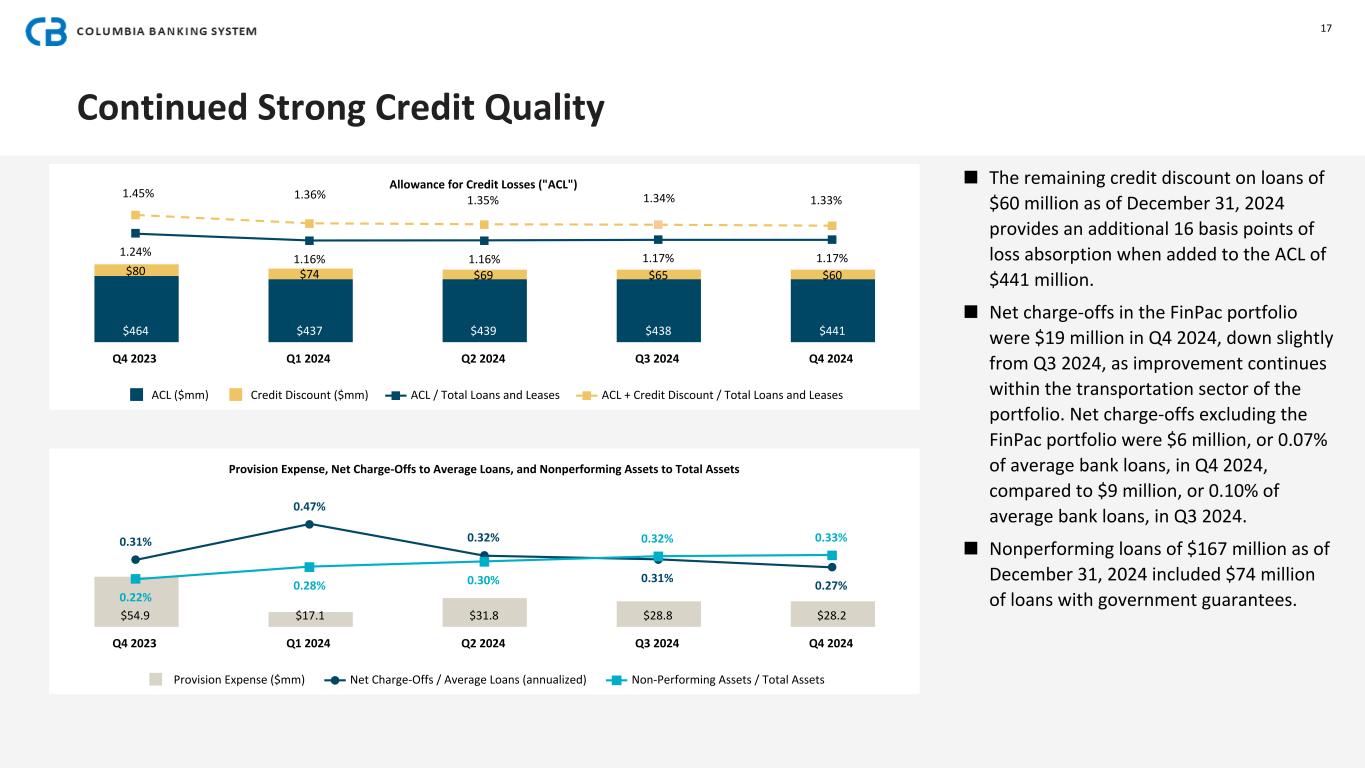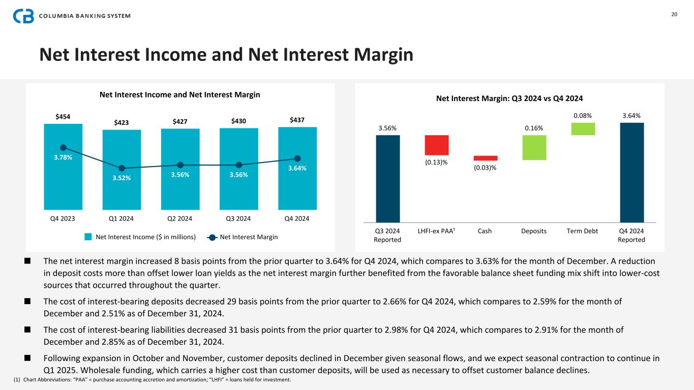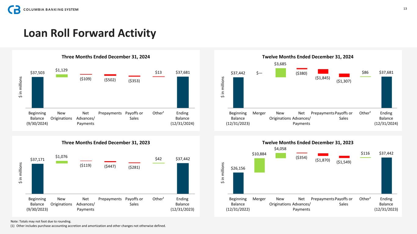 Non-GAAP Reconciliation: Net Interest Income & Net Interest Margin (1) The cumulative fair value discount on historical Columbia loans was established as of February 28, 2023, and the allocation between the credit-related discount and the rate-related discount was established at that time. Our disclosure of credit-related and rate-related discount accretion is an estimate based on the relative allocation of these two items to the discount at the closing of the merger. (2) Tax-exempt interest was adjusted to a taxable equivalent basis using a 21% tax rate. 35 For the Quarter Ended For the Year Ended ($ in thousands) 12/31/2024 9/30/2024 6/30/2024 3/31/2024 12/31/2023 12/31/2024 12/31/2023 Net interest income(2) a $438,424 $431,184 $428,434 $424,344 $454,730 $1,722,386 $1,797,298 Less: Acquired loan accretion - credit related(1) b 4,313 4,127 4,835 5,119 5,430 18,394 22,706 Net Interest Income, excluding credit PAA(1), (2) c 434,111 427,057 423,599 419,225 449,300 1,703,992 1,774,592 Less: Acquired rate-related accretion(1) d 61,499 59,620 67,375 57,336 63,757 245,830 230,856 Adjusted net interest income(1), (2) e $372,612 $367,437 $356,224 $361,889 $385,543 $1,458,162 $1,543,736 Average interest-earning assets f $47,870,698 $48,185,474 $48,117,746 $48,280,787 $47,838,229 $48,113,208 $45,867,566 Net interest margin(2) a / f 3.64 % 3.56 % 3.56 % 3.52 % 3.78 % 3.57 % 3.91 % Less: Acquired loan accretion - credit related(1) b / f 0.03 % 0.04 % 0.04 % 0.04 % 0.05 % 0.04 % 0.05 % Net Interest margin, excluding credit PAA(1), (2) c / f 3.61 % 3.52 % 3.52 % 3.48 % 3.73 % 3.53 % 3.86 % Less: Acquired rate-related accretion(1) d / f 0.51 % 0.49 % 0.56 % 0.48 % 0.53 % 0.51 % 0.50 % Adjusted net interest margin(1), (2) e / f 3.10 % 3.03 % 2.96 % 3.00 % 3.20 % 3.02 % 3.36 %