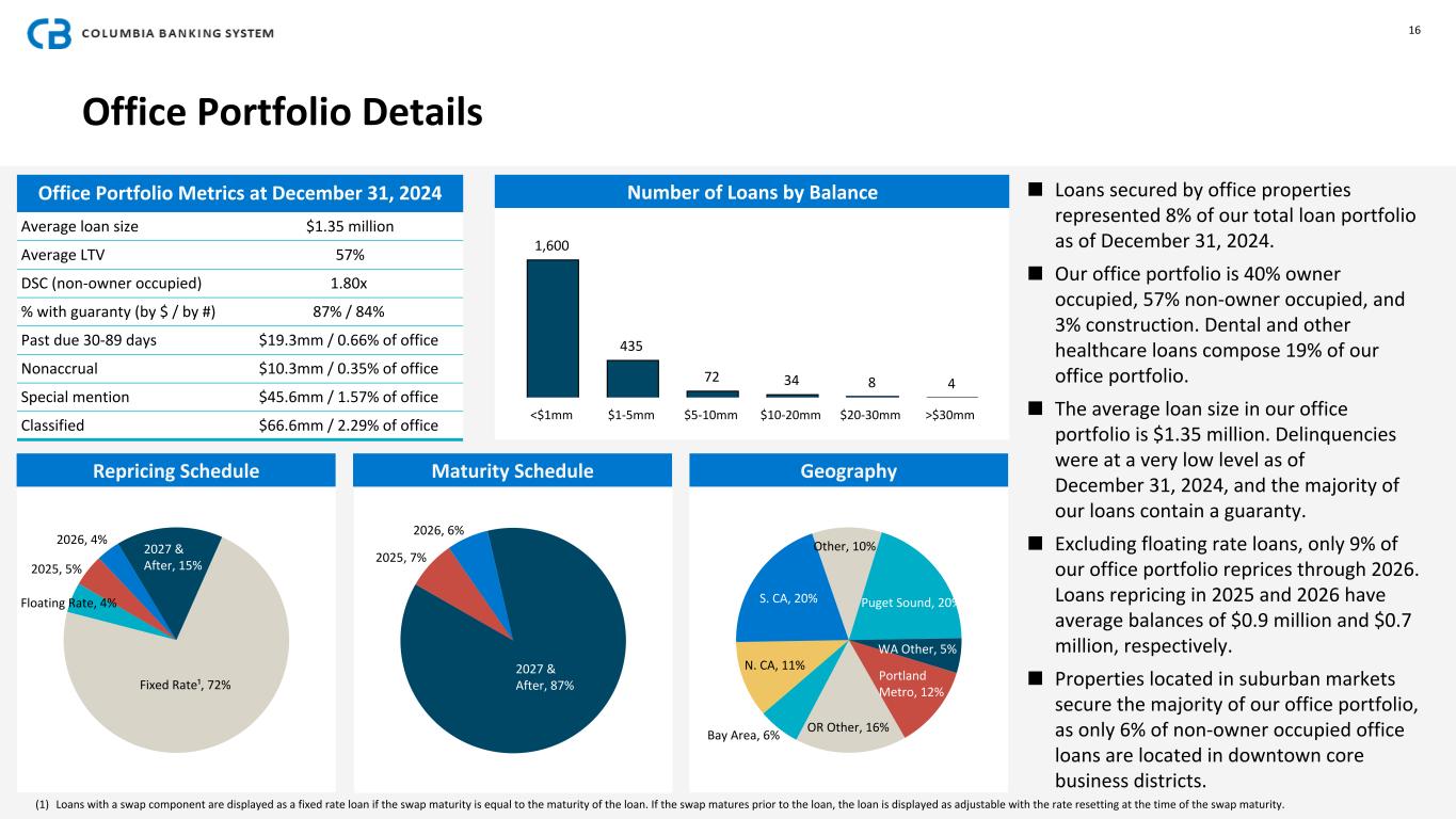Office Portfolio Details Puget Sound, 20% WA Other, 5% Portland Metro, 12% OR Other, 16% Bay Area, 6% N. CA, 11% S. CA, 20% Other, 10% Office Portfolio Metrics at December 31, 2024 Average loan size $1.35 million Average LTV 57% DSC (non-owner occupied) 1.80x % with guaranty (by $ / by #) 87% / 84% Past due 30-89 days $19.3mm / 0.66% of office Nonaccrual $10.3mm / 0.35% of office Special mention $45.6mm / 1.57% of office Classified $66.6mm / 2.29% of office Number of Loans by Balance Geography 16 ■ Loans secured by office properties represented 8% of our total loan portfolio as of December 31, 2024. ■ Our office portfolio is 40% owner occupied, 57% non-owner occupied, and 3% construction. Dental and other healthcare loans compose 19% of our office portfolio. ■ The average loan size in our office portfolio is $1.35 million. Delinquencies were at a very low level as of December 31, 2024, and the majority of our loans contain a guaranty. ■ Excluding floating rate loans, only 9% of our office portfolio reprices through 2026. Loans repricing in 2025 and 2026 have average balances of $0.9 million and $0.7 million, respectively. ■ Properties located in suburban markets secure the majority of our office portfolio, as only 6% of non-owner occupied office loans are located in downtown core business districts. 1,746 441 71 38 7 6 <$1mm $1-5mm $5-10mm $10-20mm $20-30mm >$30mm 2025, 5% 2026, 4% 2027 & After, 15% Fixed Rate¹, 72% Floating Rate, 4% Repricing Schedule (1) Loans with a swap component are displayed as a fixed rate loan if the swap maturity is equal to the maturity of the loan. If the swap matures prior to the loan, the loan is displayed as adjustable with the rate resetting at the time of the swap maturity. 2025, 7% 2026, 6% 2027 & After, 87% Maturity Schedule , 19 8 9 6 7 1,600 35 2 4 8 4