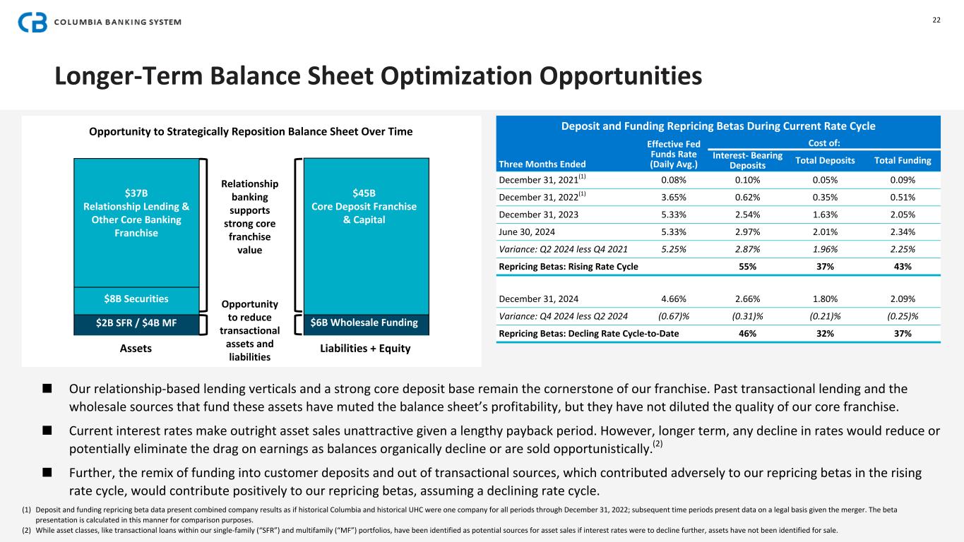 Select Asset and Liability Maturity and Repricing Schedules (in Months) at December 31, 2024 ($ in millions) <=3 4 to 6 7 to 12 13 to 24 25 to 36 36+ Total % Total(3) Loans Fixed (maturity)(2) $390 $114 $355 $664 $1,045 $10,745 $13,313 35% Floating (repricing)(2) 13,432 — — — — — 13,432 35% Adjustable (repricing) 364 569 441 1,523 1,345 7,107 11,349 30% Total Loans $14,186 $683 $796 $2,187 $2,390 $17,852 $38,094 100% Time deposits (maturity)(4) $3,852 $1,272 $820 $128 $17 $13 $6,102 Average rate(4) 4.31% 3.99% 3.50% 1.77% 0.27% 0.28% 4.06% Term debt (maturity) $2,600 $500 $— $— $— $— $3,100 Average rate 5.04% 4.49% 4.95% Interest Rate Sensitivity 21 Note: Tables may not foot due to rounding. Loan totals on this slide do not include purchase accounting adjustments. Deferred fees and costs also drive variances between loan totals on this slide and loan totals in the earnings press release. (1) For the scenarios shown, the interest rate simulations assume a parallel and sustained shift in market interest rates ratably over a twelve-month period (ramp) or immediately (shock). The simulation repricing betas applied to interest-bearing deposits in the rising rate and declining rate scenarios are 55% and 54%, respectively, for December 31, 2024. Additional data related to interest rate simulations are available in Columbia’s Form 10-K for the fiscal year ended December 31, 2023. (2) Commercial tranche loans that mature in one month are included in the floating rate loan category, not the fixed rate loan category, as these loans reprice in a manner similar to floating rate loans. (3) Floating rate loans are indexed to prime (8% of the total loan portfolio) and 1-month underlying interest rates (27% of the total loan portfolio). When adjustable rate loans reprice, they are indexed to interest rates that span 1-month tenors to 10-year tenors as well as the prime rate; the most prevalent underlying index rates are 6-month tenors (17% of the total loan portfolio) and 5-year tenors (6% of the total loan portfolio). (4) Time deposits maturing in 3 months or less include $1.5 billion in customer CDs at an average rate of 4.00% and $2.4 billion in brokered CDs at an average rate of 4.57%. (5) Loans were grouped into three buckets: (1) No Floor: no contractual floor on the loan; (2) At Floor: current rate = floor; (3) Above Floor: current rate exceeds floor. The amount above the floor was based on the current margin plus the current index assuming the loan repriced on December 31, 2024. The adjustable loans may not reprice until well into the future, depending on the timing and size of interest rate changes. Interest Rate Simulation Impact on Net Interest Income at December 31, 2024(1) Ramp Shock Year 1 Year 2 Year 1 Year 2 Up 200 basis points (0.3)% 0.0% (1.7)% 1.6% Up 100 basis points (0.1)% 0.0% (0.8)% 0.8% Down 100 basis points 0.1% (0.2)% 0.7% (1.1)% Down 200 basis points 0.4% (0.4)% 1.6% (2.0)% Down 300 basis points 1.1% (0.7)% 2.7% (3.3)% Downward Rate Change to Move to Floor at December 31, 2024 ($ in millions) Floating Loans Adjustable Loans Above Floor Total <25 basis points $27 $33 $60 26 to 50 basis points 116 40 156 51 to 75 basis points 44 44 88 76 to 100 basis points 78 66 144 101 to 125 basis points 34 80 114 126 to 150 basis points 45 87 132 >150 basis points 3,919 9,311 13,230 Total $4,263 $9,661 $13,924 Floors: Floating and Adjustable Rate Loans at December 31, 2024 ($ in millions) No Floor(5) At Floor(5) Above Floor(5) Total Floating $8,830 $339 $4,263 $13,432 Adjustable 1,622 66 9,661 11,349 Total $10,452 $405 $13,924 $24,781 % of Total 42% 2% 56% 100%