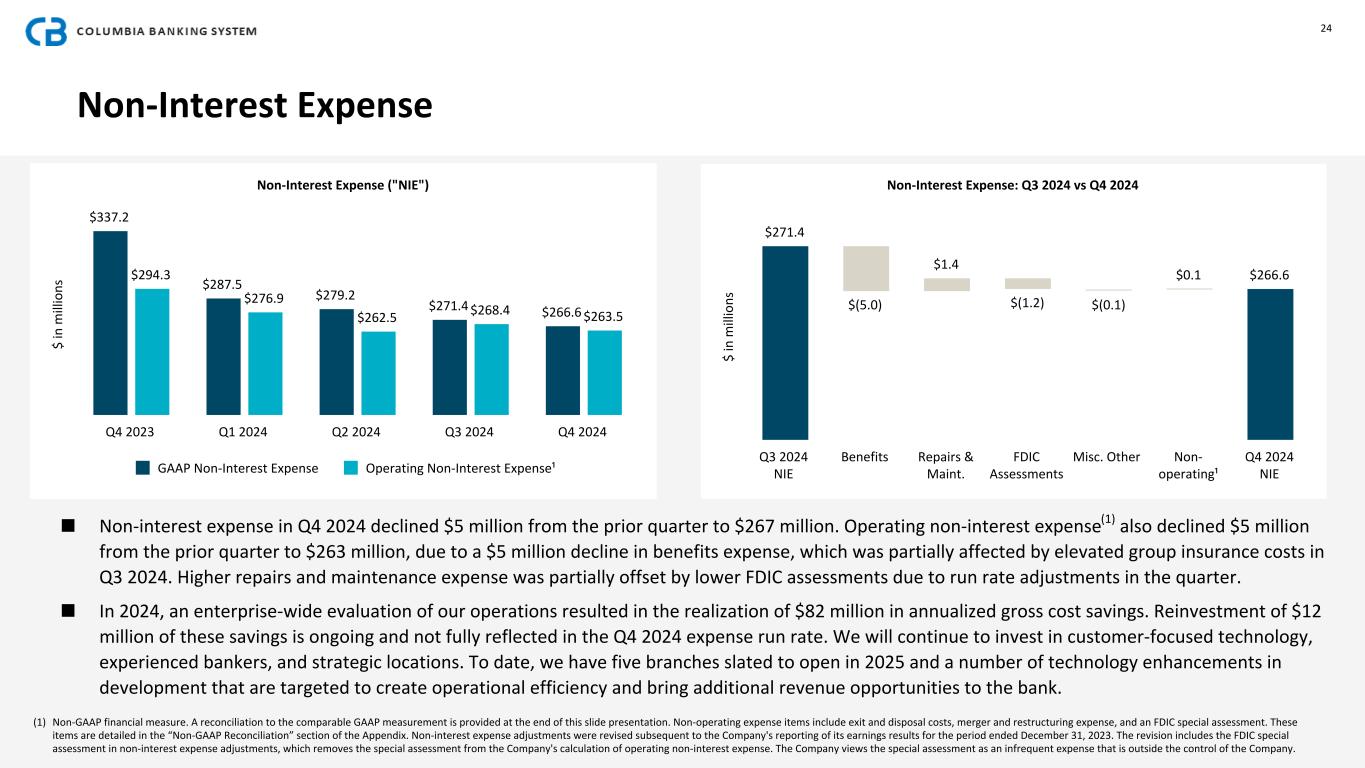 Non-Interest Income Note: Tables may not foot due to rounding. (1) Other commercial product revenue includes swaps, syndication, and international banking revenue, which are captured in “other income” on the income statement. Other income statement line items, like card-based fees, include other sources of commercial product revenue. For the Quarter Ended ($ in millions) Q4 2024 Q3 2024 Q2 2024 Q1 2024 Q4 2023 Service charges on deposits $18.4 $18.5 $18.5 $16.1 $17.3 Card-based fees 14.6 14.6 14.7 13.2 14.6 Financial services and trust revenue 5.3 5.1 5.4 4.5 3.0 Residential mortgage banking revenue, net 7.0 6.7 5.8 4.6 4.2 (Loss) gain on equity securities, net (1.4) 2.3 0.3 (1.6) 2.6 (Loss) gain on loan and lease sales, net (1.7) 0.2 (1.5) 0.2 1.2 BOLI income 4.7 4.7 4.7 4.6 4.3 Other income Other commercial product revenue(1) $2.0 $2.9 $2.6 $2.3 $3.9 Commercial servicing revenue 0.6 0.5 0.2 0.6 (0.2) Loan-related fees 3.4 3.3 4.1 3.7 3.2 Change in fair value of certain loans held for investment (7.4) 9.4 (10.1) (2.4) 19.4 Misc. income 0.6 1.6 (0.4) 3.3 (0.1) Swap derivative gain (loss) 3.6 (3.6) 0.4 1.2 (8.0) 23 Q4 2024 Highlights (compared to Q3 2024) ■ Our Business Bank of Choice strategy incorporates a collaborative team approach to deliver needs-based solutions to our customers, which deepens relationships and provides growth in sustainable core fee income. Our trends reflect a growing contribution from card activity, financial services and trust activity, and other commercial product revenue like treasury management, as compared to the prior year period. ■ Higher interest rates related to the bond market sell-off in Q4 2024 compared to Q3 2024’s rally drove fair value changes in certain loans carried at fair value, which, when coupled with the swap derivative gain, reduced non-interest income by $4 million compared to a $6 million addition in Q3 2024. These items are captured in other income.