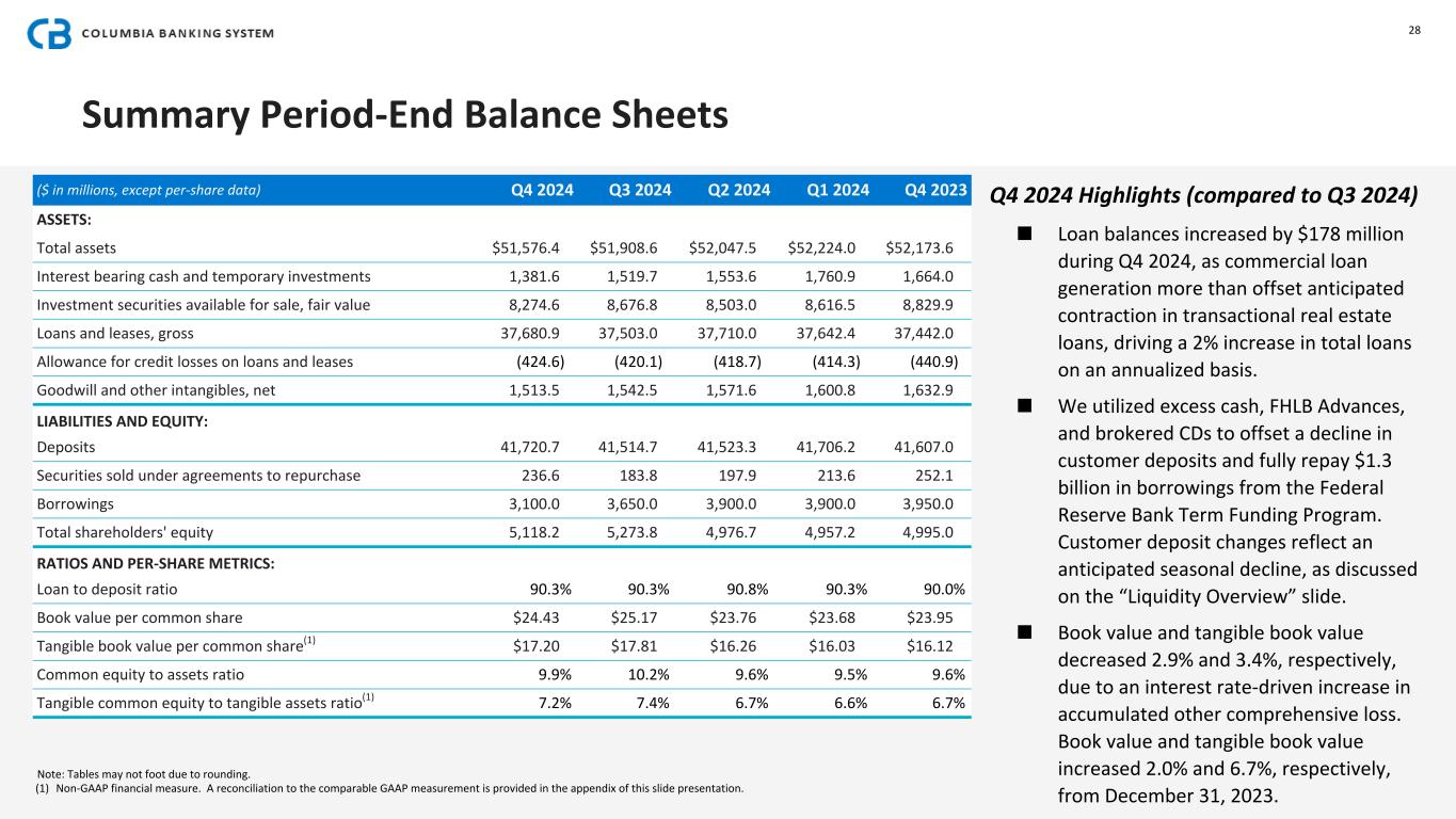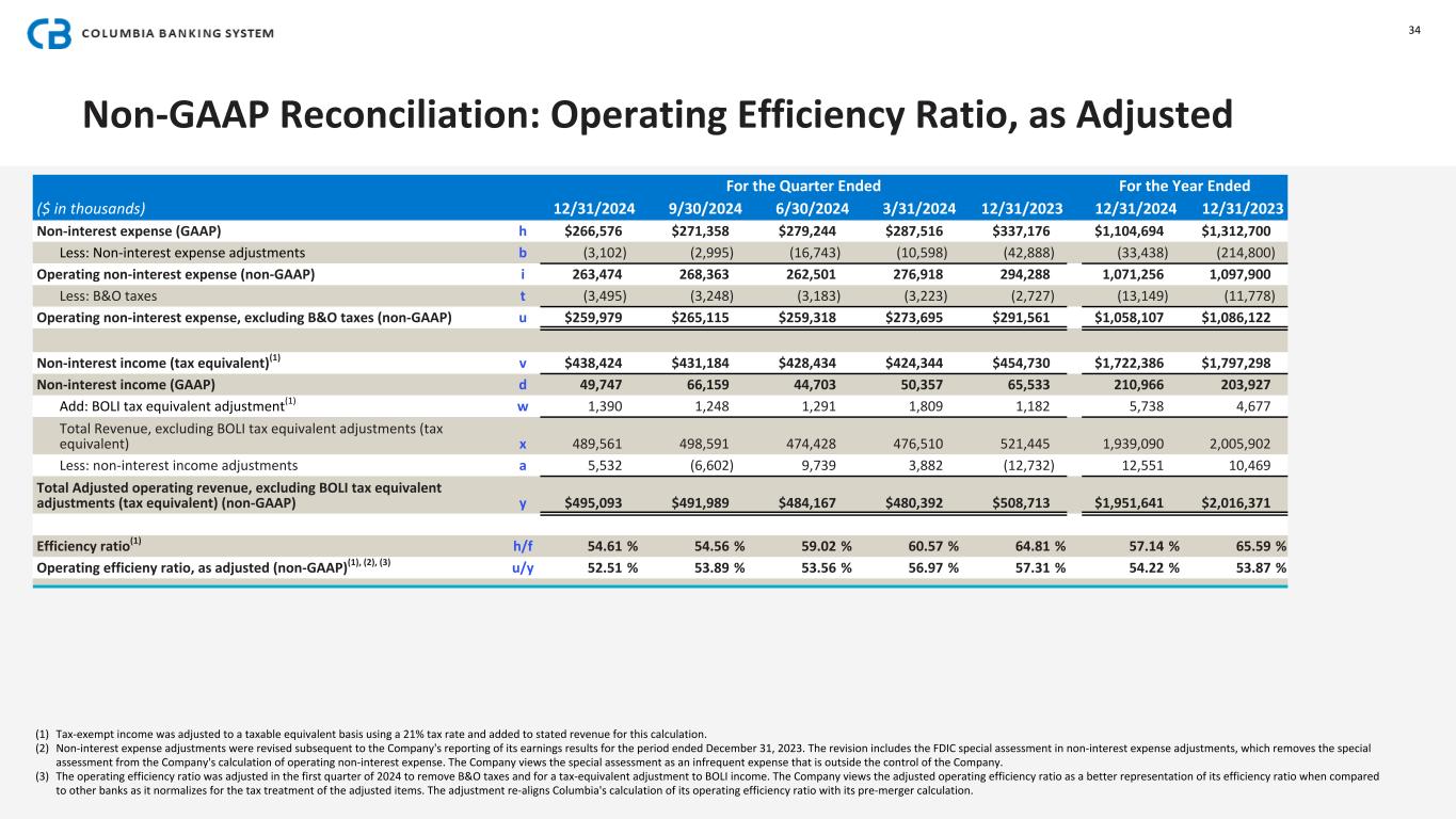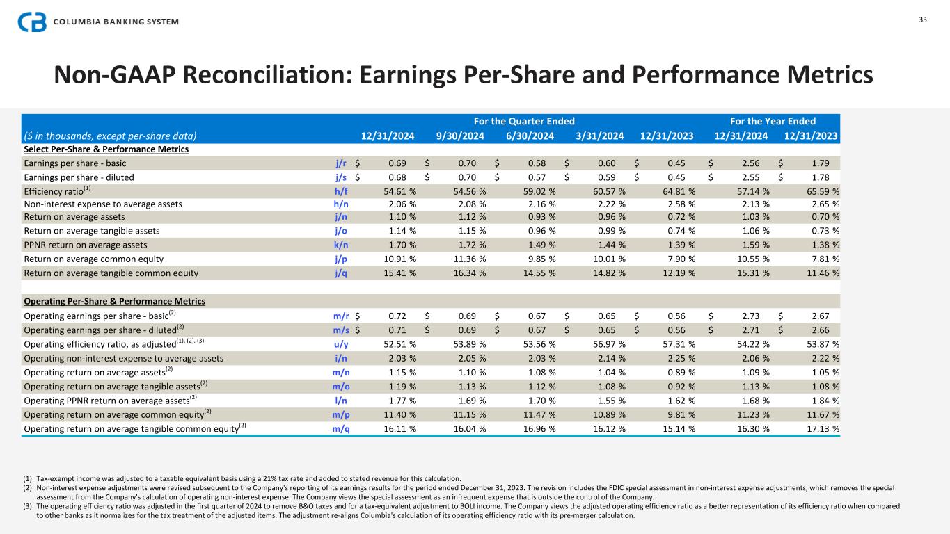 Non-GAAP Reconciliation: Earnings Per-Share and Performance Metrics For the Quarter Ended For the Year Ended ($ in thousands, except per-share data) 12/31/2024 9/30/2024 6/30/2024 3/31/2024 12/31/2023 12/31/2024 12/31/2023 Select Per-Share & Performance Metrics Earnings per share - basic j/r $ 0.69 $ 0.70 $ 0.58 $ 0.60 $ 0.45 $ 2.56 $ 1.79 Earnings per share - diluted j/s $ 0.68 $ 0.70 $ 0.57 $ 0.59 $ 0.45 $ 2.55 $ 1.78 Efficiency ratio(1) h/f 54.61 % 54.56 % 59.02 % 60.57 % 64.81 % 57.14 % 65.59 % Non-interest expense to average assets h/n 2.06 % 2.08 % 2.16 % 2.22 % 2.58 % 2.13 % 2.65 % Return on average assets j/n 1.10 % 1.12 % 0.93 % 0.96 % 0.72 % 1.03 % 0.70 % Return on average tangible assets j/o 1.14 % 1.15 % 0.96 % 0.99 % 0.74 % 1.06 % 0.73 % PPNR return on average assets k/n 1.70 % 1.72 % 1.49 % 1.44 % 1.39 % 1.59 % 1.38 % Return on average common equity j/p 10.91 % 11.36 % 9.85 % 10.01 % 7.90 % 10.55 % 7.81 % Return on average tangible common equity j/q 15.41 % 16.34 % 14.55 % 14.82 % 12.19 % 15.31 % 11.46 % Operating Per-Share & Performance Metrics Operating earnings per share - basic(2) m/r $ 0.72 $ 0.69 $ 0.67 $ 0.65 $ 0.56 $ 2.73 $ 2.67 Operating earnings per share - diluted(2) m/s $ 0.71 $ 0.69 $ 0.67 $ 0.65 $ 0.56 $ 2.71 $ 2.66 Operating efficiency ratio, as adjusted(1), (2), (3) u/y 52.51 % 53.89 % 53.56 % 56.97 % 57.31 % 54.22 % 53.87 % Operating non-interest expense to average assets i/n 2.03 % 2.05 % 2.03 % 2.14 % 2.25 % 2.06 % 2.22 % Operating return on average assets(2) m/n 1.15 % 1.10 % 1.08 % 1.04 % 0.89 % 1.09 % 1.05 % Operating return on average tangible assets(2) m/o 1.19 % 1.13 % 1.12 % 1.08 % 0.92 % 1.13 % 1.08 % Operating PPNR return on average assets(2) l/n 1.77 % 1.69 % 1.70 % 1.55 % 1.62 % 1.68 % 1.84 % Operating return on average common equity(2) m/p 11.40 % 11.15 % 11.47 % 10.89 % 9.81 % 11.23 % 11.67 % Operating return on average tangible common equity(2) m/q 16.11 % 16.04 % 16.96 % 16.12 % 15.14 % 16.30 % 17.13 % (1) Tax-exempt income was adjusted to a taxable equivalent basis using a 21% tax rate and added to stated revenue for this calculation. (2) Non-interest expense adjustments were revised subsequent to the Company's reporting of its earnings results for the period ended December 31, 2023. The revision includes the FDIC special assessment in non-interest expense adjustments, which removes the special assessment from the Company's calculation of operating non-interest expense. The Company views the special assessment as an infrequent expense that is outside the control of the Company. (3) The operating efficiency ratio was adjusted in the first quarter of 2024 to remove B&O taxes and for a tax-equivalent adjustment to BOLI income. The Company views the adjusted operating efficiency ratio as a better representation of its efficiency ratio when compared to other banks as it normalizes for the tax treatment of the adjusted items. The adjustment re-aligns Columbia's calculation of its operating efficiency ratio with its pre-merger calculation. 33