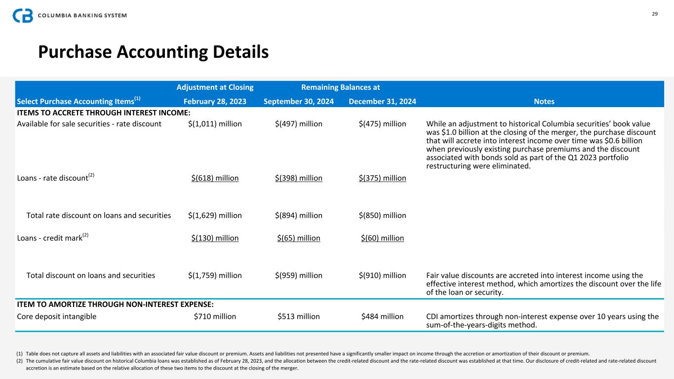 Purchase Accounting Details (1) Table does not capture all assets and liabilities with an associated fair value discount or premium. Assets and liabilities not presented have a significantly smaller impact on income through the accretion or amortization of their discount or premium. (2) The cumulative fair value discount on historical Columbia loans was established as of February 28, 2023, and the allocation between the credit-related discount and the rate-related discount was established at that time. Our disclosure of credit-related and rate-related discount accretion is an estimate based on the relative allocation of these two items to the discount at the closing of the merger. Adjustment at Closing Remaining Balances at Select Purchase Accounting Items(1) February 28, 2023 September 30, 2024 December 31, 2024 Notes ITEMS TO ACCRETE THROUGH INTEREST INCOME: Available for sale securities - rate discount $(1,011) million $(497) million $(475) million While an adjustment to historical Columbia securities’ book value was $1.0 billion at the closing of the merger, the purchase discount that will accrete into interest income over time was $0.6 billion when previously existing purchase premiums and the discount associated with bonds sold as part of the Q1 2023 portfolio restructuring were eliminated. Loans - rate discount(2) $(618) million $(398) million $(375) million Total rate discount on loans and securities $(1,629) million $(894) million $(850) million Loans - credit mark(2) $(130) million $(65) million $(60) million Total discount on loans and securities $(1,759) million $(959) million $(910) million Fair value discounts are accreted into interest income using the effective interest method, which amortizes the discount over the life of the loan or security. ITEM TO AMORTIZE THROUGH NON-INTEREST EXPENSE: Core deposit intangible $710 million $513 million $484 million CDI amortizes through non-interest expense over 10 years using the sum-of-the-years-digits method. 29