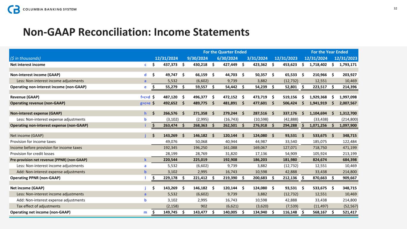 Non-GAAP Reconciliation: Income Statements For the Quarter Ended For the Year Ended ($ in thousands) 12/31/2024 9/30/2024 6/30/2024 3/31/2024 12/31/2023 12/31/2024 12/31/2023 Net interest income c $ 437,373 $ 430,218 $ 427,449 $ 423,362 $ 453,623 $ 1,718,402 $ 1,793,171 Non-interest income (GAAP) d $ 49,747 $ 66,159 $ 44,703 $ 50,357 $ 65,533 $ 210,966 $ 203,927 Less: Non-interest income adjustments a 5,532 (6,602) 9,739 3,882 (12,732) 12,551 10,469 Operating non-interest income (non-GAAP) e $ 55,279 $ 59,557 $ 54,442 $ 54,239 $ 52,801 $ 223,517 $ 214,396 Revenue (GAAP) f=c+d $ 487,120 $ 496,377 $ 472,152 $ 473,719 $ 519,156 $ 1,929,368 $ 1,997,098 Operating revenue (non-GAAP) g=c+e $ 492,652 $ 489,775 $ 481,891 $ 477,601 $ 506,424 $ 1,941,919 $ 2,007,567 Non-interest expense (GAAP) h $ 266,576 $ 271,358 $ 279,244 $ 287,516 $ 337,176 $ 1,104,694 $ 1,312,700 Less: Non-interest expense adjustments b (3,102) (2,995) (16,743) (10,598) (42,888) (33,438) (214,800) Operating non-interest expense (non-GAAP) i $ 263,474 $ 268,363 $ 262,501 $ 276,918 $ 294,288 $ 1,071,256 $ 1,097,900 Net income (GAAP) j $ 143,269 $ 146,182 $ 120,144 $ 124,080 $ 93,531 $ 533,675 $ 348,715 Provision for income taxes 49,076 50,068 40,944 44,987 33,540 185,075 122,484 Income before provision for income taxes 192,345 196,250 161,088 169,067 127,071 718,750 471,199 Provision for credit losses 28,199 28,769 31,820 17,136 54,909 105,924 213,199 Pre-provision net revenue (PPNR) (non-GAAP) k 220,544 225,019 192,908 186,203 181,980 824,674 684,398 Less: Non-interest income adjustments a 5,532 (6,602) 9,739 3,882 (12,732) 12,551 10,469 Add: Non-interest expense adjustments b 3,102 2,995 16,743 10,598 42,888 33,438 214,800 Operating PPNR (non-GAAP) l $ 229,178 $ 221,412 $ 219,390 $ 200,683 $ 212,136 $ 870,663 $ 909,667 Net income (GAAP) j $ 143,269 $ 146,182 $ 120,144 $ 124,080 $ 93,531 $ 533,675 $ 348,715 Less: Non-interest income adjustments a 5,532 (6,602) 9,739 3,882 (12,732) 12,551 10,469 Add: Non-interest expense adjustments b 3,102 2,995 16,743 10,598 42,888 33,438 214,800 Tax effect of adjustments (2,158) 902 (6,621) (3,620) (7,539) (11,497) (52,567) Operating net income (non-GAAP) m $ 149,745 $ 143,477 $ 140,005 $ 134,940 $ 116,148 $ 568,167 $ 521,417 32