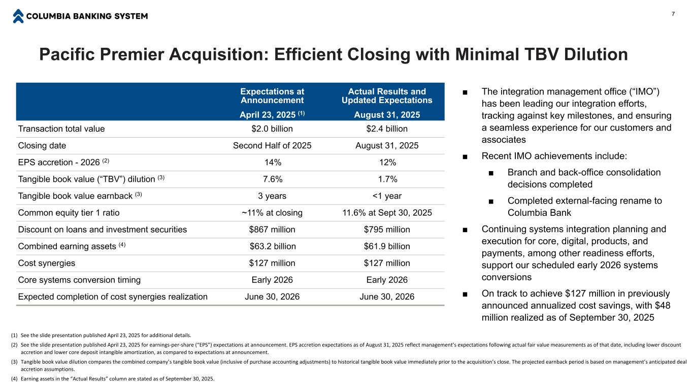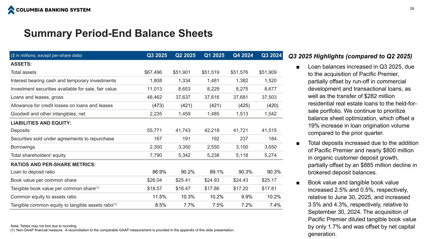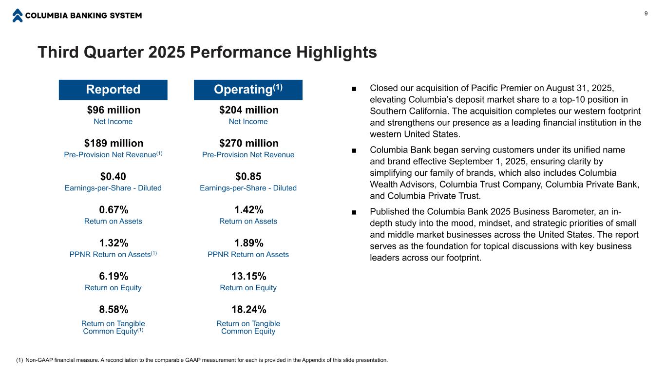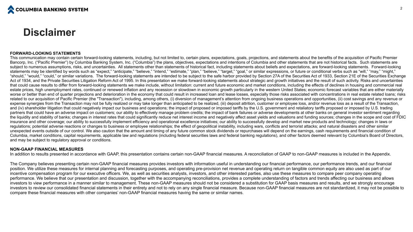 Disclaimer FORWARD-LOOKING STATEMENTS This communication may contain certain forward-looking statements, including, but not limited to, certain plans, expectations, goals, projections, and statements about the benefits of the acquisition of Pacific Premier Bancorp, Inc. (“Pacific Premier”) by Columbia Banking System, Inc. (“Columbia”) the plans, objectives, expectations and intentions of Columbia and other statements that are not historical facts. Such statements are subject to numerous assumptions, risks, and uncertainties. All statements other than statements of historical fact, including statements about beliefs and expectations, are forward-looking statements. Forward-looking statements may be identified by words such as “expect,” “anticipate,” “believe,” “intend,” “estimate,” “plan,” “believe,” “target,” “goal,” or similar expressions, or future or conditional verbs such as “will,” “may,” “might,” “should,” “would,” “could,” or similar variations. The forward-looking statements are intended to be subject to the safe harbor provided by Section 27A of the Securities Act of 1933, Section 21E of the Securities Exchange Act of 1934, and the Private Securities Litigation Reform Act of 1995. In this presentation we make forward-looking statements about strategic and growth initiatives and the result of such activity. Risks and uncertainties that could cause results to differ from forward-looking statements we make include, without limitation: current and future economic and market conditions, including the effects of declines in housing and commercial real estate prices, high unemployment rates, continued or renewed inflation and any recession or slowdown in economic growth particularly in the western United States; economic forecast variables that are either materially worse or better than end of quarter projections and deterioration in the economy that could result in increased loan and lease losses, especially those risks associated with concentrations in real estate related loans; risks related to our acquisition of Pacific Premier (the "Transaction"), including, among others, (i) diversion of management’s attention from ongoing business operations and opportunities, (ii) cost savings and any revenue or expense synergies from the Transaction may not be fully realized or may take longer than anticipated to be realized, (iii) deposit attrition, customer or employee loss, and/or revenue loss as a result of the Transaction, and (iv) shareholder litigation that could negatively impact our business and operations; the impact of proposed or imposed tariffs by the U.S. government and retaliatory tariffs proposed or imposed by U.S. trading partners that could have an adverse impact on customers; our ability to effectively manage problem credits; the impact of bank failures or adverse developments at other banks on general investor sentiment regarding the liquidity and stability of banks; changes in interest rates that could significantly reduce net interest income and negatively affect asset yields and valuations and funding sources; changes in the scope and cost of FDIC insurance and other coverage; our ability to successfully implement efficiency and operational excellence initiatives; our ability to successfully develop and market new products and technology; changes in laws or regulations; potential adverse reactions or changes to business or employee relationships; the effect of geopolitical instability, including wars, conflicts and terrorist attacks; and natural disasters and other similar unexpected events outside of our control. We also caution that the amount and timing of any future common stock dividends or repurchases will depend on the earnings, cash requirements and financial condition of Columbia, market conditions, capital requirements, applicable law and regulations (including federal securities laws and federal banking regulations), and other factors deemed relevant by Columbia's Board of Directors, and may be subject to regulatory approval or conditions. NON-GAAP FINANCIAL MEASURES In addition to results presented in accordance with GAAP, this presentation contains certain non-GAAP financial measures. A reconciliation of GAAP to non-GAAP measures is included in the Appendix. The Company believes presenting certain non-GAAP financial measures provides investors with information useful in understanding our financial performance, our performance trends, and our financial position. We utilize these measures for internal planning and forecasting purposes, and operating pre-provision net revenue and operating return on tangible common equity are also used as part of our incentive compensation program for our executive officers. We, as well as securities analysts, investors, and other interested parties, also use these measures to compare peer company operating performance. We believe that our presentation and discussion, together with the accompanying reconciliations, provides a complete understanding of factors and trends affecting our business and allows investors to view performance in a manner similar to management. These non-GAAP measures should not be considered a substitution for GAAP basis measures and results, and we strongly encourage investors to review our consolidated financial statements in their entirety and not to rely on any single financial measure. Because non-GAAP financial measures are not standardized, it may not be possible to compare these financial measures with other companies’ non-GAAP financial measures having the same or similar names. 2