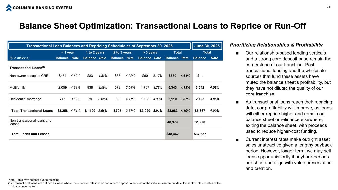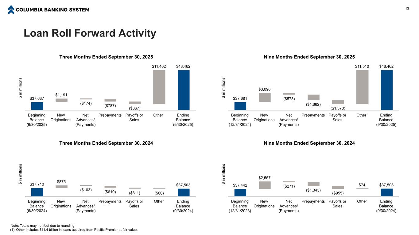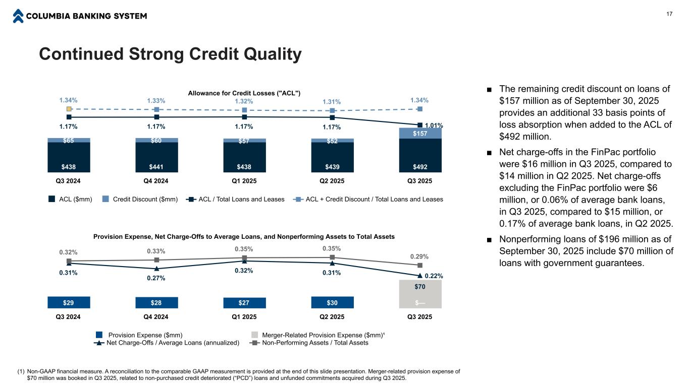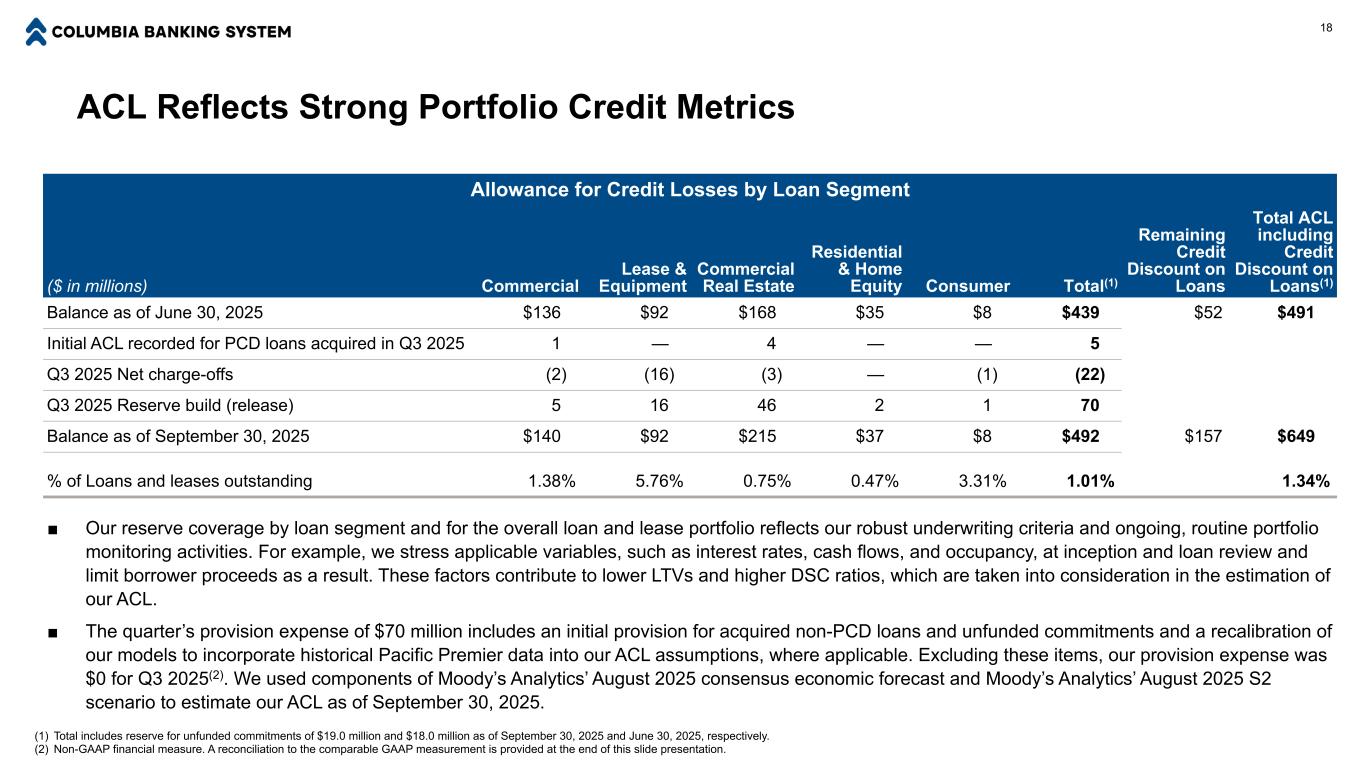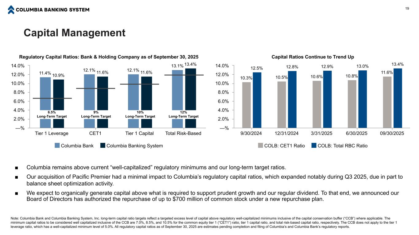 Disclaimer FORWARD-LOOKING STATEMENTS This communication may contain certain forward-looking statements, including, but not limited to, certain plans, expectations, goals, projections, and statements about the benefits of the acquisition of Pacific Premier Bancorp, Inc. (“Pacific Premier”) by Columbia Banking System, Inc. (“Columbia”) the plans, objectives, expectations and intentions of Columbia and other statements that are not historical facts. Such statements are subject to numerous assumptions, risks, and uncertainties. All statements other than statements of historical fact, including statements about beliefs and expectations, are forward-looking statements. Forward-looking statements may be identified by words such as “expect,” “anticipate,” “believe,” “intend,” “estimate,” “plan,” “believe,” “target,” “goal,” or similar expressions, or future or conditional verbs such as “will,” “may,” “might,” “should,” “would,” “could,” or similar variations. The forward-looking statements are intended to be subject to the safe harbor provided by Section 27A of the Securities Act of 1933, Section 21E of the Securities Exchange Act of 1934, and the Private Securities Litigation Reform Act of 1995. In this presentation we make forward-looking statements about strategic and growth initiatives and the result of such activity. Risks and uncertainties that could cause results to differ from forward-looking statements we make include, without limitation: current and future economic and market conditions, including the effects of declines in housing and commercial real estate prices, high unemployment rates, continued or renewed inflation and any recession or slowdown in economic growth particularly in the western United States; economic forecast variables that are either materially worse or better than end of quarter projections and deterioration in the economy that could result in increased loan and lease losses, especially those risks associated with concentrations in real estate related loans; risks related to our acquisition of Pacific Premier (the "Transaction"), including, among others, (i) diversion of management’s attention from ongoing business operations and opportunities, (ii) cost savings and any revenue or expense synergies from the Transaction may not be fully realized or may take longer than anticipated to be realized, (iii) deposit attrition, customer or employee loss, and/or revenue loss as a result of the Transaction, and (iv) shareholder litigation that could negatively impact our business and operations; the impact of proposed or imposed tariffs by the U.S. government and retaliatory tariffs proposed or imposed by U.S. trading partners that could have an adverse impact on customers; our ability to effectively manage problem credits; the impact of bank failures or adverse developments at other banks on general investor sentiment regarding the liquidity and stability of banks; changes in interest rates that could significantly reduce net interest income and negatively affect asset yields and valuations and funding sources; changes in the scope and cost of FDIC insurance and other coverage; our ability to successfully implement efficiency and operational excellence initiatives; our ability to successfully develop and market new products and technology; changes in laws or regulations; potential adverse reactions or changes to business or employee relationships; the effect of geopolitical instability, including wars, conflicts and terrorist attacks; and natural disasters and other similar unexpected events outside of our control. We also caution that the amount and timing of any future common stock dividends or repurchases will depend on the earnings, cash requirements and financial condition of Columbia, market conditions, capital requirements, applicable law and regulations (including federal securities laws and federal banking regulations), and other factors deemed relevant by Columbia's Board of Directors, and may be subject to regulatory approval or conditions. NON-GAAP FINANCIAL MEASURES In addition to results presented in accordance with GAAP, this presentation contains certain non-GAAP financial measures. A reconciliation of GAAP to non-GAAP measures is included in the Appendix. The Company believes presenting certain non-GAAP financial measures provides investors with information useful in understanding our financial performance, our performance trends, and our financial position. We utilize these measures for internal planning and forecasting purposes, and operating pre-provision net revenue and operating return on tangible common equity are also used as part of our incentive compensation program for our executive officers. We, as well as securities analysts, investors, and other interested parties, also use these measures to compare peer company operating performance. We believe that our presentation and discussion, together with the accompanying reconciliations, provides a complete understanding of factors and trends affecting our business and allows investors to view performance in a manner similar to management. These non-GAAP measures should not be considered a substitution for GAAP basis measures and results, and we strongly encourage investors to review our consolidated financial statements in their entirety and not to rely on any single financial measure. Because non-GAAP financial measures are not standardized, it may not be possible to compare these financial measures with other companies’ non-GAAP financial measures having the same or similar names. 2