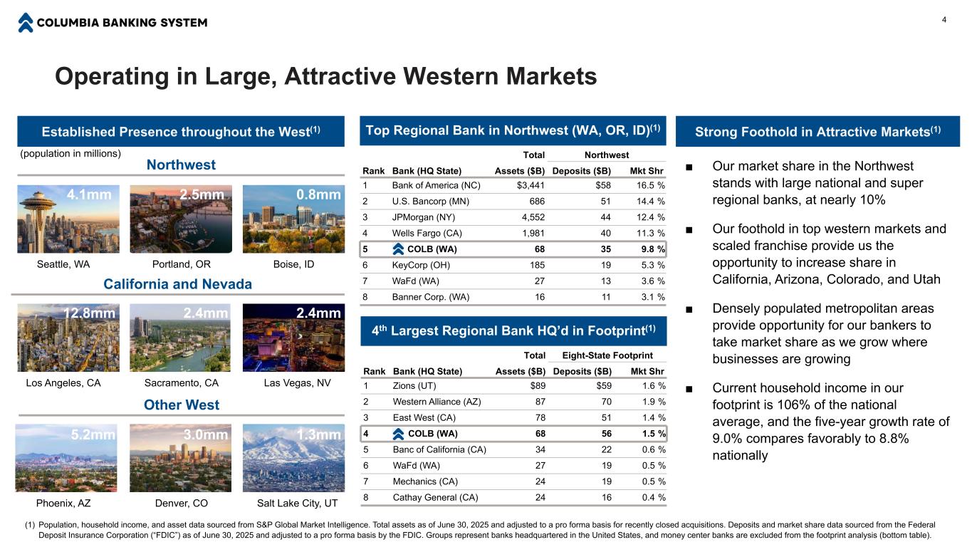 West-Focused Regional Powerhouse 3 Completed Western Footprint(3) Why Columbia? ■ Business Bank of Choice strategy cultivates a granular, low-cost core deposit base ■ Compelling culture and Community Banking at Scale business model foster deep community ties while also attracting and retaining top banking talent ■ Scaled western franchise is difficult to replicate and provides scarcity value ■ Opportunity to organically gain share in California and growing metros in the West while increasing density in the Northwest ■ Strong credit quality is supported by a diversified, well-structured, and conservatively underwritten loan portfolio ■ Solid capital generation supports long-term organic growth and return to shareholders Columbia at a Glance C or po ra te Ticker COLB Market Capitalization(1) $7.9 billion Dividend Yield(1) 5.5% Fi na nc ia ls a s of S ep te m be r 3 0, 2 02 5 Assets $67.5 billion Loans $48.5 billion Deposits $55.8 billion Common Equity Tier 1 Capital Ratio(2) 11.6% Total Capital Ratio(2) 13.4% (1) Market data as of October 29, 2025. (2) Regulatory capital ratios are estimates pending completion and filing of Columbia’s regulatory reports. (3) Columbia is headquartered in Tacoma, Washington and operates approximately 350 branches throughout eight western states.