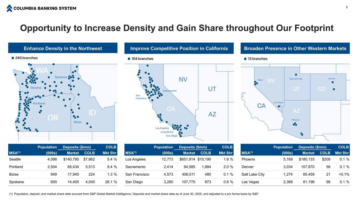 Operating in Large, Attractive Western Markets 4 Established Presence throughout the West(1) Northwest (population in millions) Seattle, WA Portland, OR California and Nevada Los Angeles, CA Sacramento, CA Other West Phoenix, AZ Denver, CO 4.1mm 2.5mm 12.8mm 2.4mm 5.2mm 3.0mm Top Regional Bank in Northwest (WA, OR, ID)(1) Total Northwest Rank Bank (HQ State) Assets ($B) Deposits ($B) Mkt Shr 1 Bank of America (NC) $3,441 $58 16.5 % 2 U.S. Bancorp (MN) 686 51 14.4 % 3 JPMorgan (NY) 4,552 44 12.4 % 4 Wells Fargo (CA) 1,981 40 11.3 % 5 COLB (WA) 68 35 9.8 % 6 KeyCorp (OH) 185 19 5.3 % 7 WaFd (WA) 27 13 3.6 % 8 Banner Corp. (WA) 16 11 3.1 % 4th Largest Regional Bank HQ’d in Footprint(1) Total Eight-State Footprint Rank Bank (HQ State) Assets ($B) Deposits ($B) Mkt Shr 1 Zions (UT) $89 $59 1.6 % 2 Western Alliance (AZ) 87 70 1.9 % 3 East West (CA) 78 51 1.4 % 4 COLB (WA) 68 56 1.5 % 5 Banc of California (CA) 34 22 0.6 % 6 WaFd (WA) 27 19 0.5 % 7 Mechanics (CA) 24 19 0.5 % 8 Cathay General (CA) 24 16 0.4 % Strong Foothold in Attractive Markets(1) ■ Our market share in the Northwest stands with large national and super regional banks, at nearly 10% ■ Our foothold in top western markets and scaled franchise provide us the opportunity to increase share in California, Arizona, Colorado, and Utah ■ Densely populated metropolitan areas provide opportunity for our bankers to take market share as we grow where businesses are growing ■ Current household income in our footprint is 106% of the national average, and the five-year growth rate of 9.0% compares favorably to 8.8% nationally Boise, ID Salt Lake City, UT Las Vegas, NV 0.8mm 2.4mm 1.3mm (1) Population, household income, and asset data sourced from S&P Global Market Intelligence. Total assets as of June 30, 2025 and adjusted to a pro forma basis for recently closed acquisitions. Deposits and market share data sourced from the Federal Deposit Insurance Corporation (“FDIC”) as of June 30, 2025 and adjusted to a pro forma basis by the FDIC. Groups represent banks headquartered in the United States, and money center banks are excluded from the footprint analysis (bottom table).