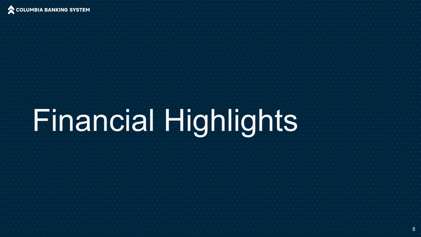 Pacific Premier Acquisition: Efficient Closing with Minimal TBV Dilution 7 Expectations at Announcement Actual Results and Updated Expectations April 23, 2025 (1) August 31, 2025 Transaction total value $2.0 billion $2.4 billion Closing date Second Half of 2025 August 31, 2025 EPS accretion - 2026 (2) 14% 12% Tangible book value (“TBV”) dilution (3) 7.6% 1.7% Tangible book value earnback (3) 3 years <1 year Common equity tier 1 ratio ~11% at closing 11.6% at Sept 30, 2025 Discount on loans and investment securities $867 million $795 million Combined earning assets (4) $63.2 billion $61.9 billion Cost synergies $127 million $127 million Core systems conversion timing Early 2026 Early 2026 Expected completion of cost synergies realization June 30, 2026 June 30, 2026 (1) See the slide presentation published April 23, 2025 for additional details. (2) See the slide presentation published April 23, 2025 for earnings-per-share (“EPS”) expectations at announcement. EPS accretion expectations as of August 31, 2025 reflect management’s expectations following actual fair value measurements as of that date, including lower discount accretion and lower core deposit intangible amortization, as compared to expectations at announcement. (3) Tangible book value dilution compares the combined company’s tangible book value (inclusive of purchase accounting adjustments) to historical tangible book value immediately prior to the acquisition’s close. The projected earnback period is based on management’s anticipated deal accretion assumptions. (4) Earning assets in the “Actual Results” column are stated as of September 30, 2025. ■ The integration management office (“IMO”) has been leading our integration efforts, tracking against key milestones, and ensuring a seamless experience for our customers and associates ■ Recent IMO achievements include: ■ Branch and back-office consolidation decisions completed ■ Completed external-facing rename to Columbia Bank ■ Continuing systems integration planning and execution for core, digital, products, and payments, among other readiness efforts, support our scheduled early 2026 systems conversions ■ On track to achieve $127 million in previously announced annualized cost savings, with $48 million realized as of September 30, 2025