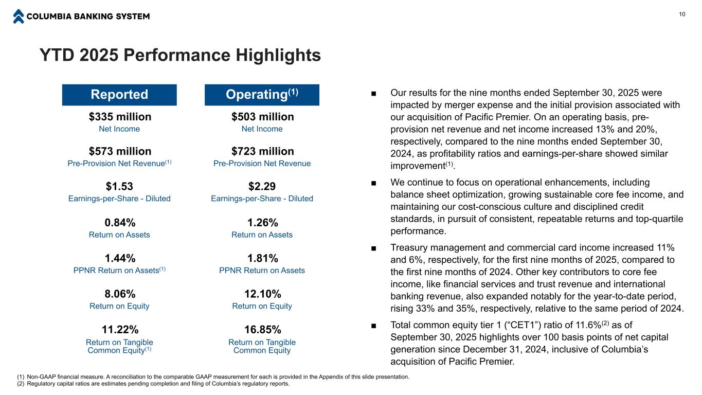 Third Quarter 2025 Performance Highlights 9 ■ Closed our acquisition of Pacific Premier on August 31, 2025, elevating Columbia’s deposit market share to a top-10 position in Southern California. The acquisition completes our western footprint and strengthens our presence as a leading financial institution in the western United States. ■ Columbia Bank began serving customers under its unified name and brand effective September 1, 2025, ensuring clarity by simplifying our family of brands, which also includes Columbia Wealth Advisors, Columbia Trust Company, Columbia Private Bank, and Columbia Private Trust. ■ Published the Columbia Bank 2025 Business Barometer, an in- depth study into the mood, mindset, and strategic priorities of small and middle market businesses across the United States. The report serves as the foundation for topical discussions with key business leaders across our footprint. Reported Operating(1) $96 million $204 million Net Income Net Income $189 million $270 million Pre-Provision Net Revenue(1) Pre-Provision Net Revenue $0.40 $0.85 Earnings-per-Share - Diluted Earnings-per-Share - Diluted 0.67% 1.42% Return on Assets Return on Assets 1.32% 1.89% PPNR Return on Assets(1) PPNR Return on Assets 6.19% 13.15% Return on Equity Return on Equity 8.58% 18.24% Return on Tangible Common Equity(1) Return on Tangible Common Equity (1) Non-GAAP financial measure. A reconciliation to the comparable GAAP measurement for each is provided in the Appendix of this slide presentation.