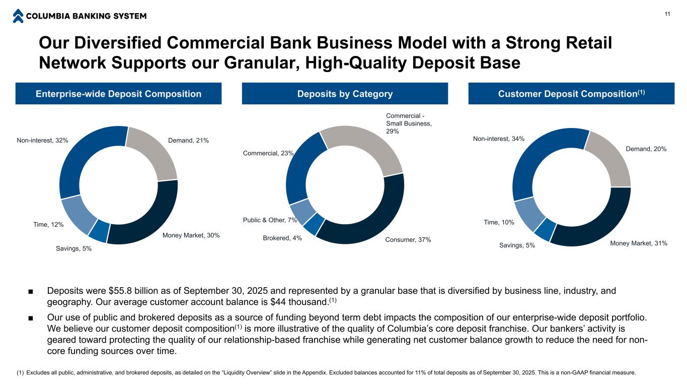 YTD 2025 Performance Highlights 10 ■ Our results for the nine months ended September 30, 2025 were impacted by merger expense and the initial provision associated with our acquisition of Pacific Premier. On an operating basis, pre- provision net revenue and net income increased 13% and 20%, respectively, compared to the nine months ended September 30, 2024, as profitability ratios and earnings-per-share showed similar improvement(1). ■ We continue to focus on operational enhancements, including balance sheet optimization, growing sustainable core fee income, and maintaining our cost-conscious culture and disciplined credit standards, in pursuit of consistent, repeatable returns and top-quartile performance. ■ Treasury management and commercial card income increased 11% and 6%, respectively, for the first nine months of 2025, compared to the first nine months of 2024. Other key contributors to core fee income, like financial services and trust revenue and international banking revenue, also expanded notably for the year-to-date period, rising 33% and 35%, respectively, relative to the same period of 2024. ■ Total common equity tier 1 (“CET1”) ratio of 11.6%(2) as of September 30, 2025 highlights over 100 basis points of net capital generation since December 31, 2024, inclusive of Columbia’s acquisition of Pacific Premier. Reported Operating(1) $335 million $503 million Net Income Net Income $573 million $723 million Pre-Provision Net Revenue(1) Pre-Provision Net Revenue $1.53 $2.29 Earnings-per-Share - Diluted Earnings-per-Share - Diluted 0.84% 1.26% Return on Assets Return on Assets 1.44% 1.81% PPNR Return on Assets(1) PPNR Return on Assets 8.06% 12.10% Return on Equity Return on Equity 11.22% 16.85% Return on Tangible Common Equity(1) Return on Tangible Common Equity (1) Non-GAAP financial measure. A reconciliation to the comparable GAAP measurement for each is provided in the Appendix of this slide presentation. (2) Regulatory capital ratios are estimates pending completion and filing of Columbia’s regulatory reports.