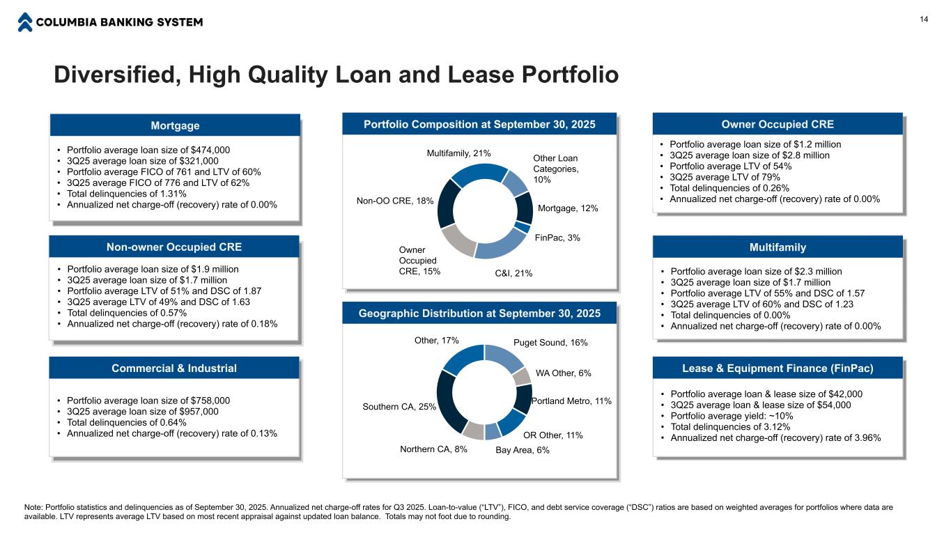 Diversified, High Quality Loan and Lease Portfolio Note: Portfolio statistics and delinquencies as of September 30, 2025. Annualized net charge-off rates for Q3 2025. Loan-to-value (“LTV”), FICO, and debt service coverage (“DSC”) ratios are based on weighted averages for portfolios where data are available. LTV represents average LTV based on most recent appraisal against updated loan balance. Totals may not foot due to rounding. • Portfolio average loan size of $474,000 • 3Q25 average loan size of $321,000 • Portfolio average FICO of 761 and LTV of 60% • 3Q25 average FICO of 776 and LTV of 62% • Total delinquencies of 1.31% • Annualized net charge-off (recovery) rate of 0.00% Non-owner Occupied CRE • Portfolio average loan size of $1.9 million • 3Q25 average loan size of $1.7 million • Portfolio average LTV of 51% and DSC of 1.87 • 3Q25 average LTV of 49% and DSC of 1.63 • Total delinquencies of 0.57% • Annualized net charge-off (recovery) rate of 0.18% Commercial & Industrial • Portfolio average loan size of $758,000 • 3Q25 average loan size of $957,000 • Total delinquencies of 0.64% • Annualized net charge-off (recovery) rate of 0.13% Multifamily • Portfolio average loan size of $2.3 million • 3Q25 average loan size of $1.7 million • Portfolio average LTV of 55% and DSC of 1.57 • 3Q25 average LTV of 60% and DSC of 1.23 • Total delinquencies of 0.00% • Annualized net charge-off (recovery) rate of 0.00% Owner Occupied CRE • Portfolio average loan size of $1.2 million • 3Q25 average loan size of $2.8 million • Portfolio average LTV of 54% • 3Q25 average LTV of 79% • Total delinquencies of 0.26% • Annualized net charge-off (recovery) rate of 0.00% Lease & Equipment Finance (FinPac) • Portfolio average loan & lease size of $42,000 • 3Q25 average loan & lease size of $54,000 • Portfolio average yield: ~10% • Total delinquencies of 3.12% • Annualized net charge-off (recovery) rate of 3.96% Puget Sound, 16% WA Other, 6% Portland Metro, 11% OR Other, 11% Bay Area, 6%Northern CA, 8% Southern CA, 25% Other, 17% Mortgage, 12% FinPac, 3% C&I, 21% Owner Occupied CRE, 15% Non-OO CRE, 18% Multifamily, 21% Other Loan Categories, 10% Portfolio Composition at September 30, 2025 Geographic Distribution at September 30, 2025 Mortgage 14
