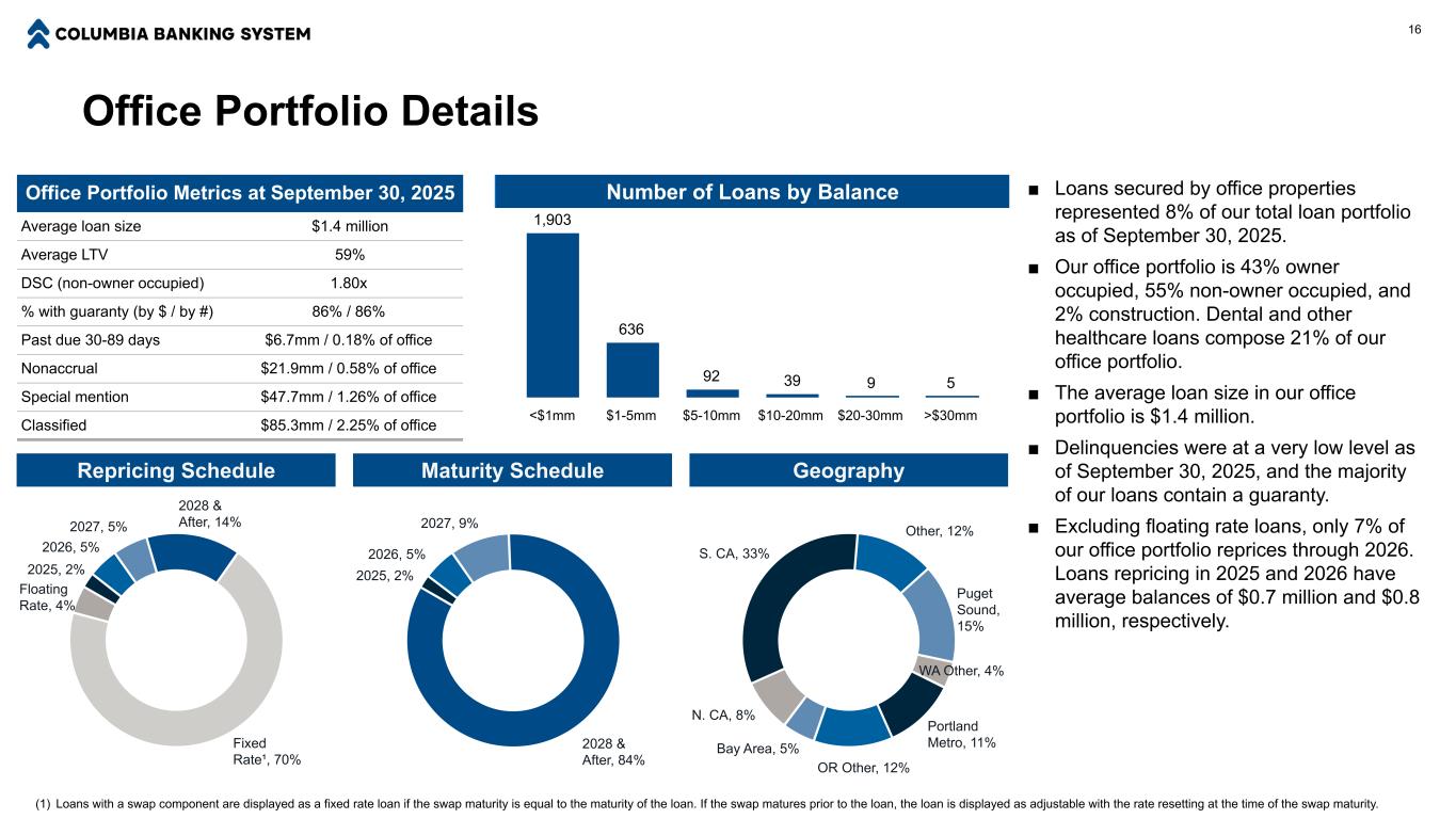 Office Portfolio Details Puget Sound, 15% WA Other, 4% Portland Metro, 11% OR Other, 12% Bay Area, 5% N. CA, 8% S. CA, 33% Other, 12% Office Portfolio Metrics at September 30, 2025 Average loan size $1.4 million Average LTV 59% DSC (non-owner occupied) 1.80x % with guaranty (by $ / by #) 86% / 86% Past due 30-89 days $6.7mm / 0.18% of office Nonaccrual $21.9mm / 0.58% of office Special mention $47.7mm / 1.26% of office Classified $85.3mm / 2.25% of office Number of Loans by Balance Geography 16 ■ Loans secured by office properties represented 8% of our total loan portfolio as of September 30, 2025. ■ Our office portfolio is 43% owner occupied, 55% non-owner occupied, and 2% construction. Dental and other healthcare loans compose 21% of our office portfolio. ■ The average loan size in our office portfolio is $1.4 million. ■ Delinquencies were at a very low level as of September 30, 2025, and the majority of our loans contain a guaranty. ■ Excluding floating rate loans, only 7% of our office portfolio reprices through 2026. Loans repricing in 2025 and 2026 have average balances of $0.7 million and $0.8 million, respectively. 1,746 441 71 38 7 6 <$1mm $1-5mm $5-10mm $10-20mm $20-30mm >$30mm 2025, 2% 2026, 5% 2027, 5% 2028 & After, 14% Fixed Rate¹, 70% Floating Rate, 4% Repricing Schedule (1) Loans with a swap component are displayed as a fixed rate loan if the swap maturity is equal to the maturity of the loan. If the swap matures prior to the loan, the loan is displayed as adjustable with the rate resetting at the time of the swap maturity. 2025, 2% 2026, 5% 2027, 9% 2028 & After, 84% Maturity Schedule , 19 8 9 6 7 1,903 636 92 9 5