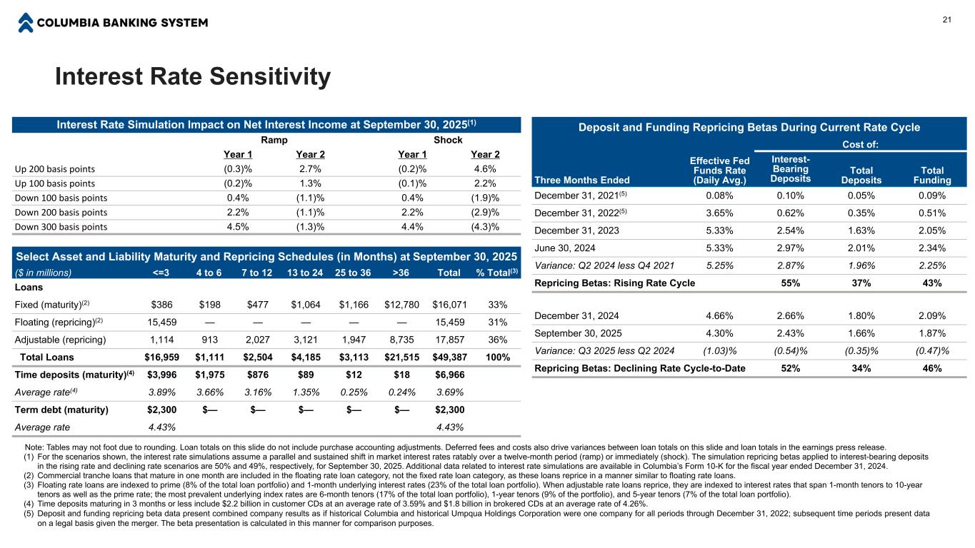 Select Asset and Liability Maturity and Repricing Schedules (in Months) at September 30, 2025 ($ in millions) <=3 4 to 6 7 to 12 13 to 24 25 to 36 >36 Total % Total(3) Loans Fixed (maturity)(2) $386 $198 $477 $1,064 $1,166 $12,780 $16,071 33% Floating (repricing)(2) 15,459 — — — — — 15,459 31% Adjustable (repricing) 1,114 913 2,027 3,121 1,947 8,735 17,857 36% Total Loans $16,959 $1,111 $2,504 $4,185 $3,113 $21,515 $49,387 100% Time deposits (maturity)(4) $3,996 $1,975 $876 $89 $12 $18 $6,966 Average rate(4) 3.89% 3.66% 3.16% 1.35% 0.25% 0.24% 3.69% Term debt (maturity) $2,300 $— $— $— $— $— $2,300 Average rate 4.43% 4.43% Interest Rate Sensitivity 21 Note: Tables may not foot due to rounding. Loan totals on this slide do not include purchase accounting adjustments. Deferred fees and costs also drive variances between loan totals on this slide and loan totals in the earnings press release. (1) For the scenarios shown, the interest rate simulations assume a parallel and sustained shift in market interest rates ratably over a twelve-month period (ramp) or immediately (shock). The simulation repricing betas applied to interest-bearing deposits in the rising rate and declining rate scenarios are 50% and 49%, respectively, for September 30, 2025. Additional data related to interest rate simulations are available in Columbia’s Form 10-K for the fiscal year ended December 31, 2024. (2) Commercial tranche loans that mature in one month are included in the floating rate loan category, not the fixed rate loan category, as these loans reprice in a manner similar to floating rate loans. (3) Floating rate loans are indexed to prime (8% of the total loan portfolio) and 1-month underlying interest rates (23% of the total loan portfolio). When adjustable rate loans reprice, they are indexed to interest rates that span 1-month tenors to 10-year tenors as well as the prime rate; the most prevalent underlying index rates are 6-month tenors (17% of the total loan portfolio), 1-year tenors (9% of the portfolio), and 5-year tenors (7% of the total loan portfolio). (4) Time deposits maturing in 3 months or less include $2.2 billion in customer CDs at an average rate of 3.59% and $1.8 billion in brokered CDs at an average rate of 4.26%. (5) Deposit and funding repricing beta data present combined company results as if historical Columbia and historical Umpqua Holdings Corporation were one company for all periods through December 31, 2022; subsequent time periods present data on a legal basis given the merger. The beta presentation is calculated in this manner for comparison purposes. Interest Rate Simulation Impact on Net Interest Income at September 30, 2025(1) Ramp Shock Year 1 Year 2 Year 1 Year 2 Up 200 basis points (0.3)% 2.7% (0.2)% 4.6% Up 100 basis points (0.2)% 1.3% (0.1)% 2.2% Down 100 basis points 0.4% (1.1)% 0.4% (1.9)% Down 200 basis points 2.2% (1.1)% 2.2% (2.9)% Down 300 basis points 4.5% (1.3)% 4.4% (4.3)% Deposit and Funding Repricing Betas During Current Rate Cycle Effective Fed Funds Rate (Daily Avg.) Cost of: Three Months Ended Interest- Bearing Deposits Total Deposits Total Funding December 31, 2021(5) 0.08% 0.10% 0.05% 0.09% December 31, 2022(5) 3.65% 0.62% 0.35% 0.51% December 31, 2023 5.33% 2.54% 1.63% 2.05% June 30, 2024 5.33% 2.97% 2.01% 2.34% Variance: Q2 2024 less Q4 2021 5.25% 2.87% 1.96% 2.25% Repricing Betas: Rising Rate Cycle 55% 37% 43% December 31, 2024 4.66% 2.66% 1.80% 2.09% September 30, 2025 4.30% 2.43% 1.66% 1.87% Variance: Q3 2025 less Q2 2024 (1.03)% (0.54)% (0.35)% (0.47)% Repricing Betas: Declining Rate Cycle-to-Date 52% 34% 46%